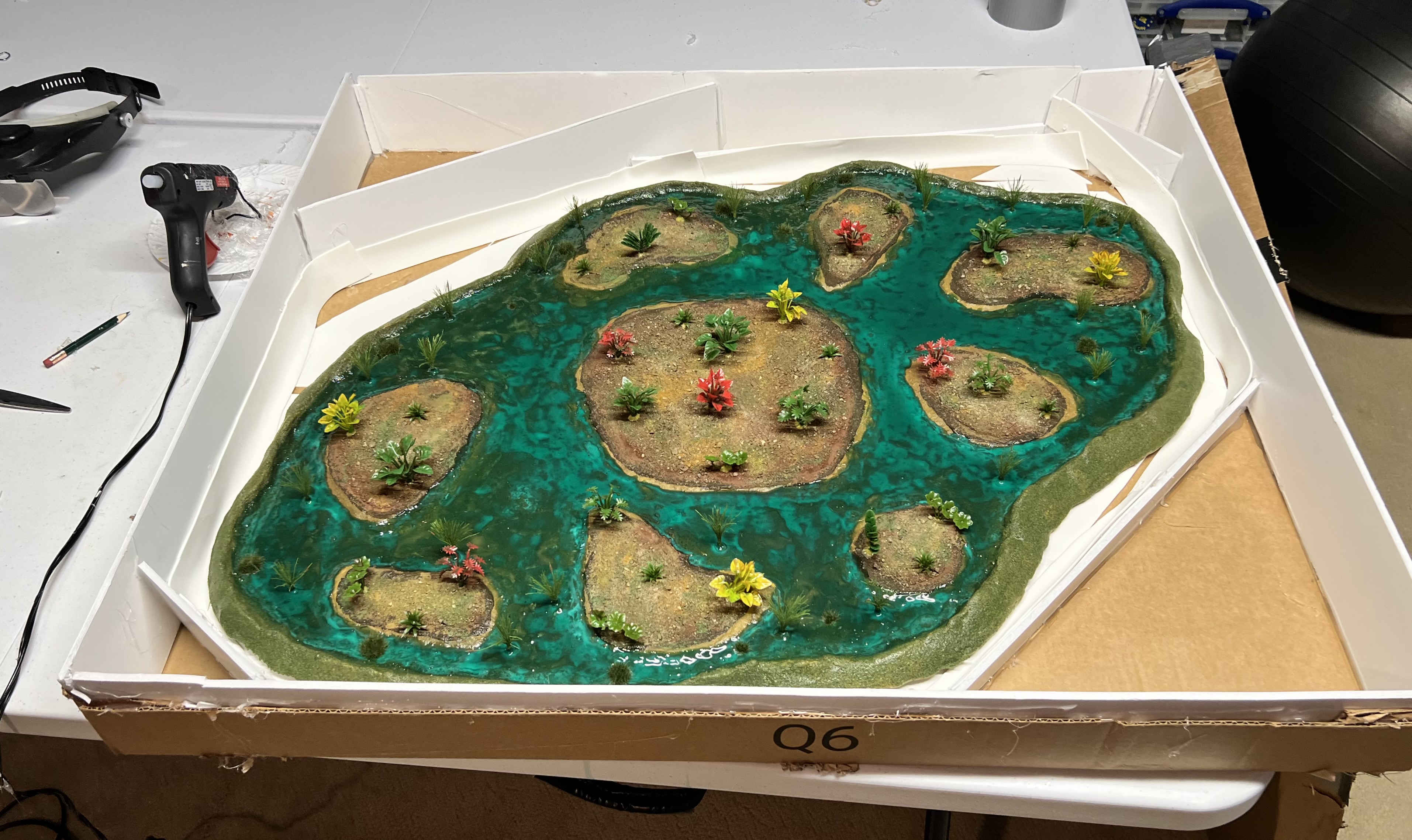 For the two buildings, I converted an iPad 16 box top and bottom. I used Apoxie Sculpt, steel washers, sand, multiple pieces of plastic, desiccant cylinders, and a lot of Juweela items to make the 61 scatter bases. And for two flat industrial structures, I reused two pieces of packing materials to repurpose them as flat rusted structures.