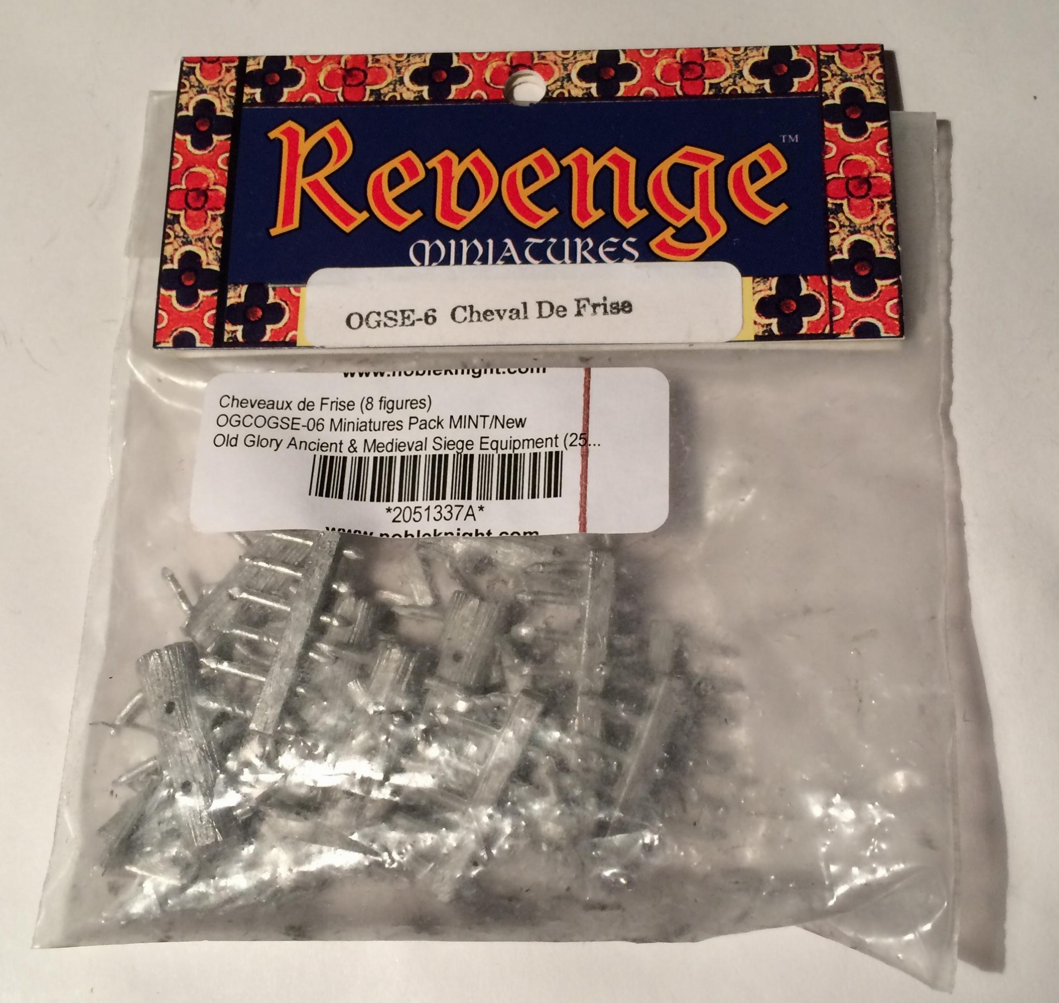 While I have been collecting many different fantasy miniatures this year, I have really wanted more terrain and obstacles for the tabletop. I was happy to come across this out of print (OOP) chevaux de fries collection from Old Glory Miniatures. This was acquired from Noble Knight Games which has a lot of OOP stuff. As a former Combat Engineer, I looked forward to installing real obstacles on the battlefield! Yes, “installing” is the word we Engineers would use – but I digress.