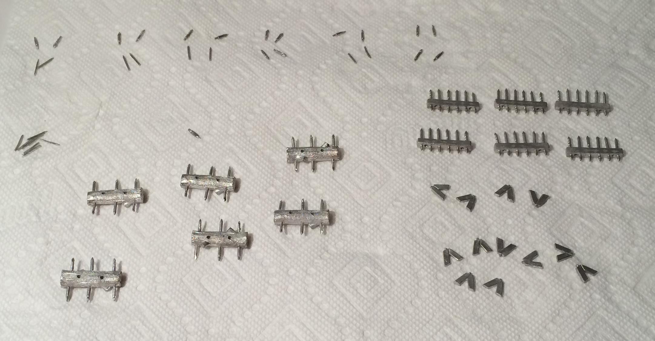 The misspelled label on the package said 8 figures, but really it was a set of 6 pairs of chevaux de fries. Each set consisted of a log with spear-like wooden iron-tipped spikes and a wooden saw horse structure with screw-shaped iron spikes. I got them out of the package, cleaned all the pieces with a brush and dishwashing soap, and was surprised to see how many tiny pieces there were that needed assembly! There were also extra pieces that could have been flash or the bottom of the spikes.