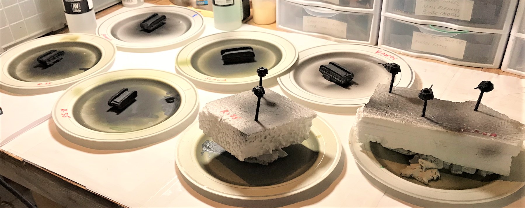 Using wood screws, styrofaim, and poster tack, I was able to paint these tiny R-35 turrets.