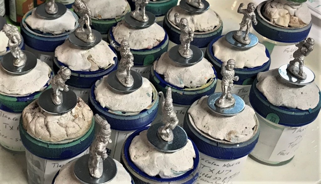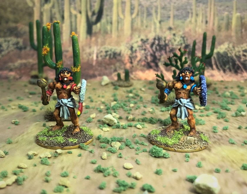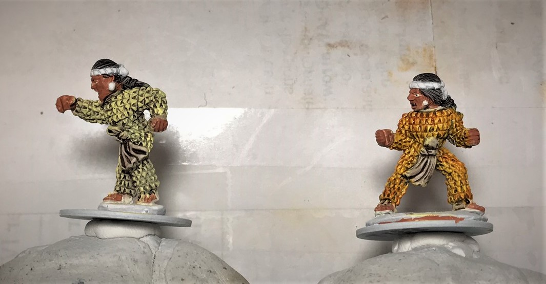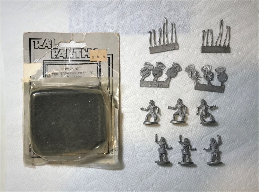 - Aztec Warrior Priests (painted as Tlaxcalans), Ral Partha 42-302, circa 1988 (this post) – 6 figures – 6 Tlaxcalan Warrior Priests