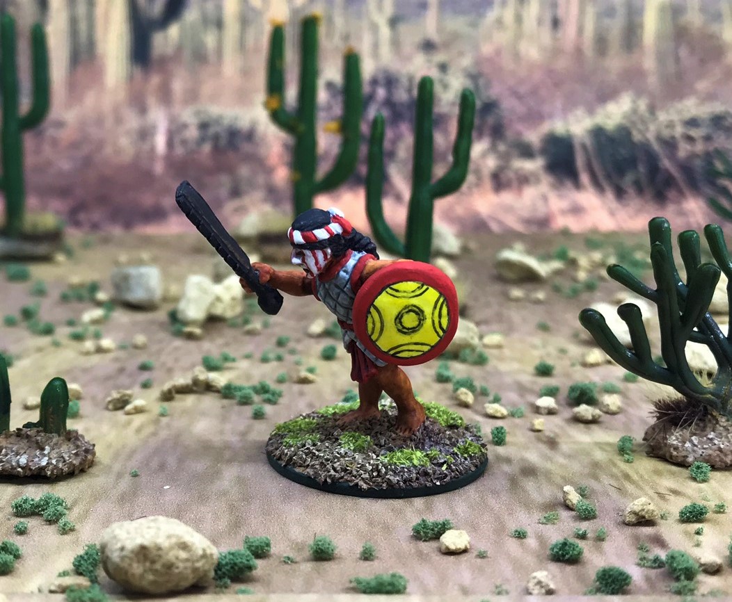 AN28 – armed with a macuahuitl (an obsidian-edged club/broadsword), a shield, and no armor.