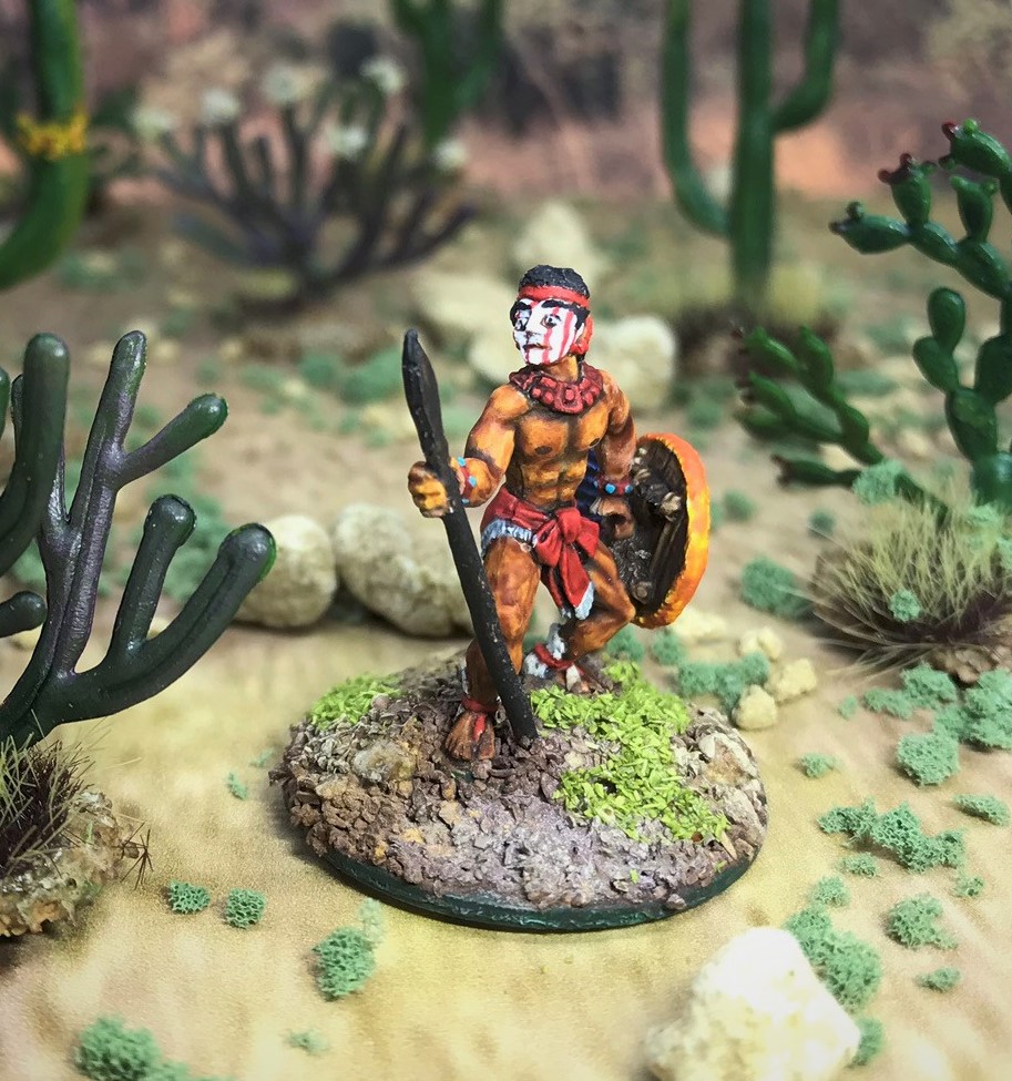 Ral Partha had a historical line of 25mm figures that were cast and sold back in the 1980’s. One of them was the “1200 A.D” line, which included Aztec figures, and one of their blister packs was “Aztec Warrior Priests”. It had 6 figures with two poses. Also supplied were 3 different weapons, and shields … Continue reading Aztec Warrior Priests (painted as Tlaxcalans), Ral Partha 42-302, circa 1988