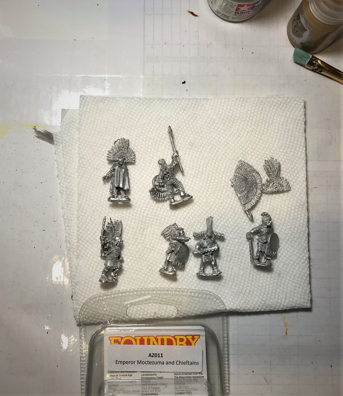 - Montezuma and Chieftains – Wargames Foundry #AZ011 for Feudal Patrol – 6 Aztec figures (Montezuma, 4 Chieftains, 1 Warrior Priest)