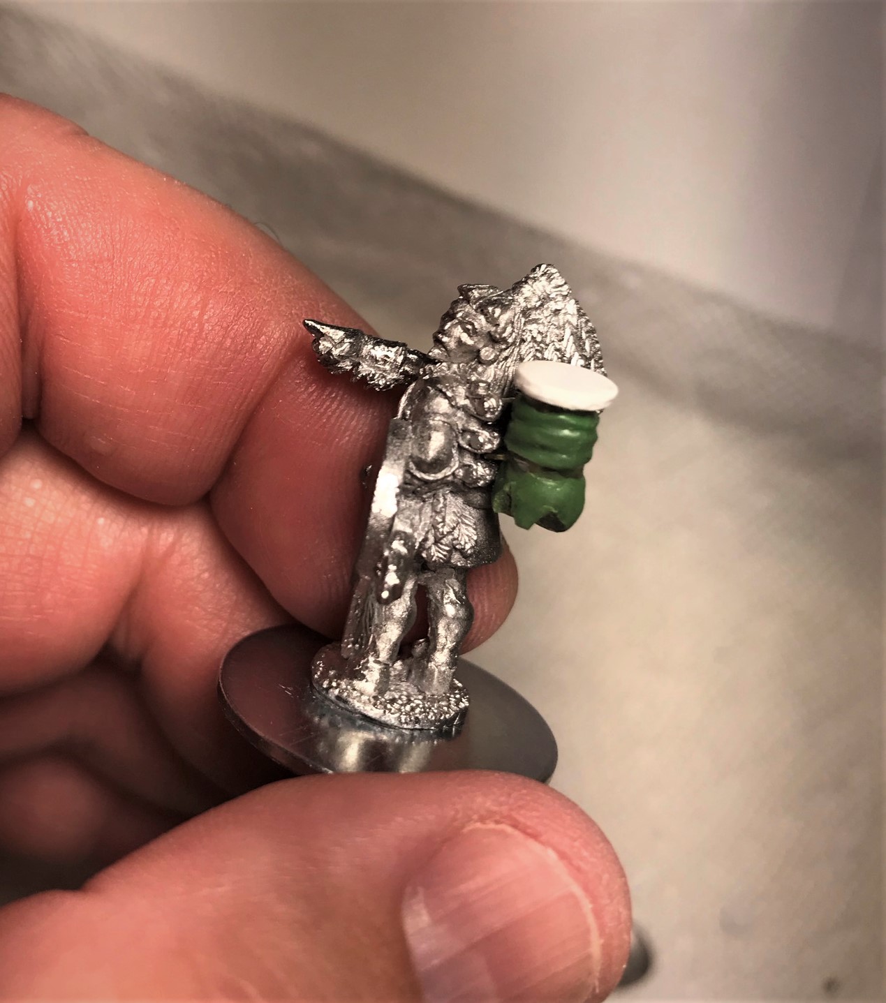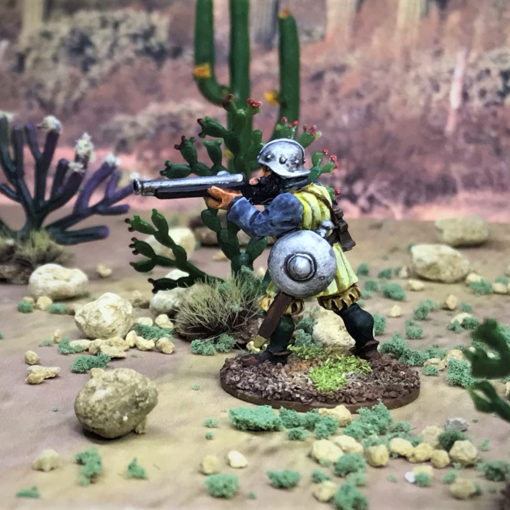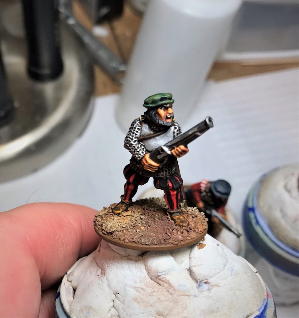 I wanted this figure’s leather armor to be a but lighter – and I achieved this a bit unusually. I base coated the armor with Vallejo Model Air “Light”, and then glazed with the Citadel contrast paint “Plague Bearer Flesh”, followed by a highlight with “Light”. I think it came out the way I wanted – and not too greenish – it should be all right for the tabletop. He has a shield, but that will only help if he is in melee, which as an arquebusier, I’m sure he’d rather avoid.