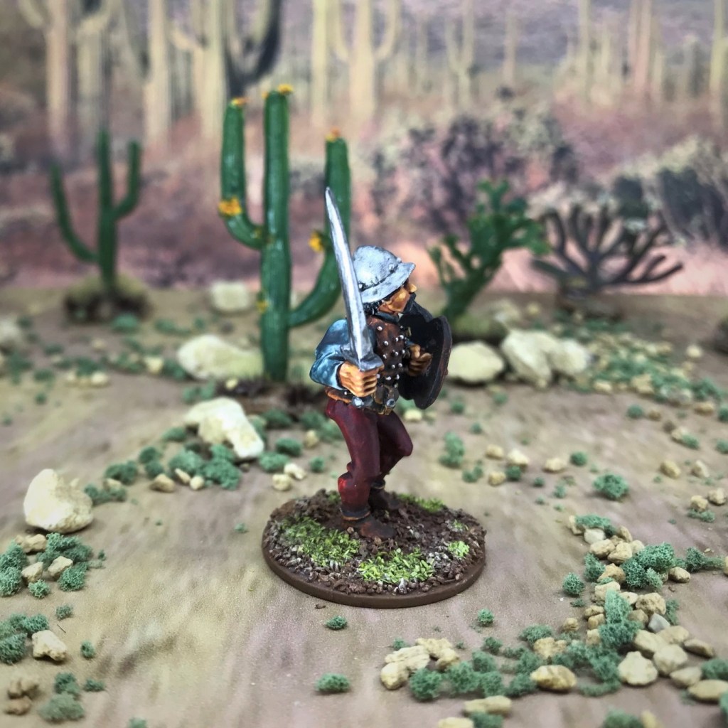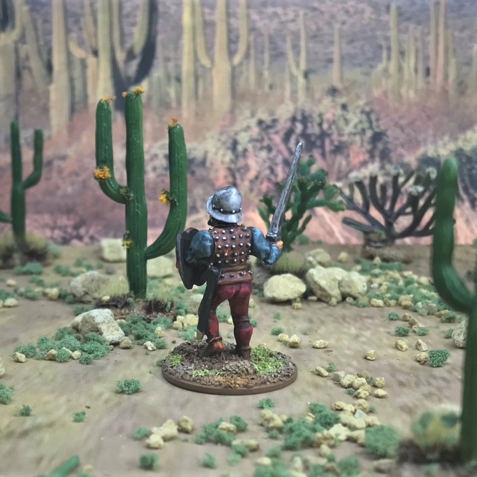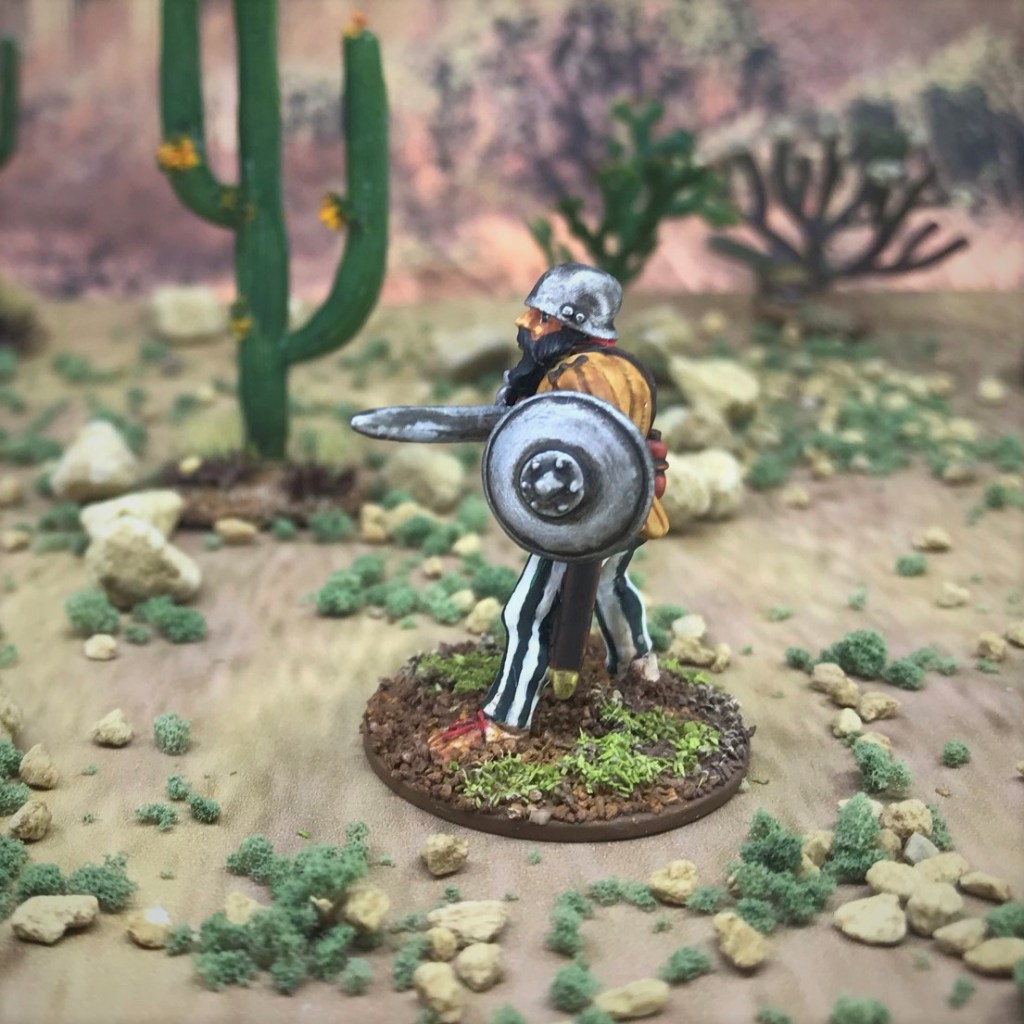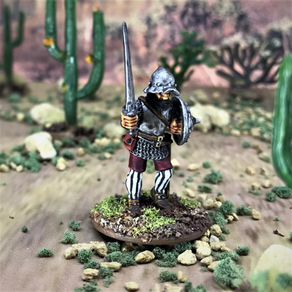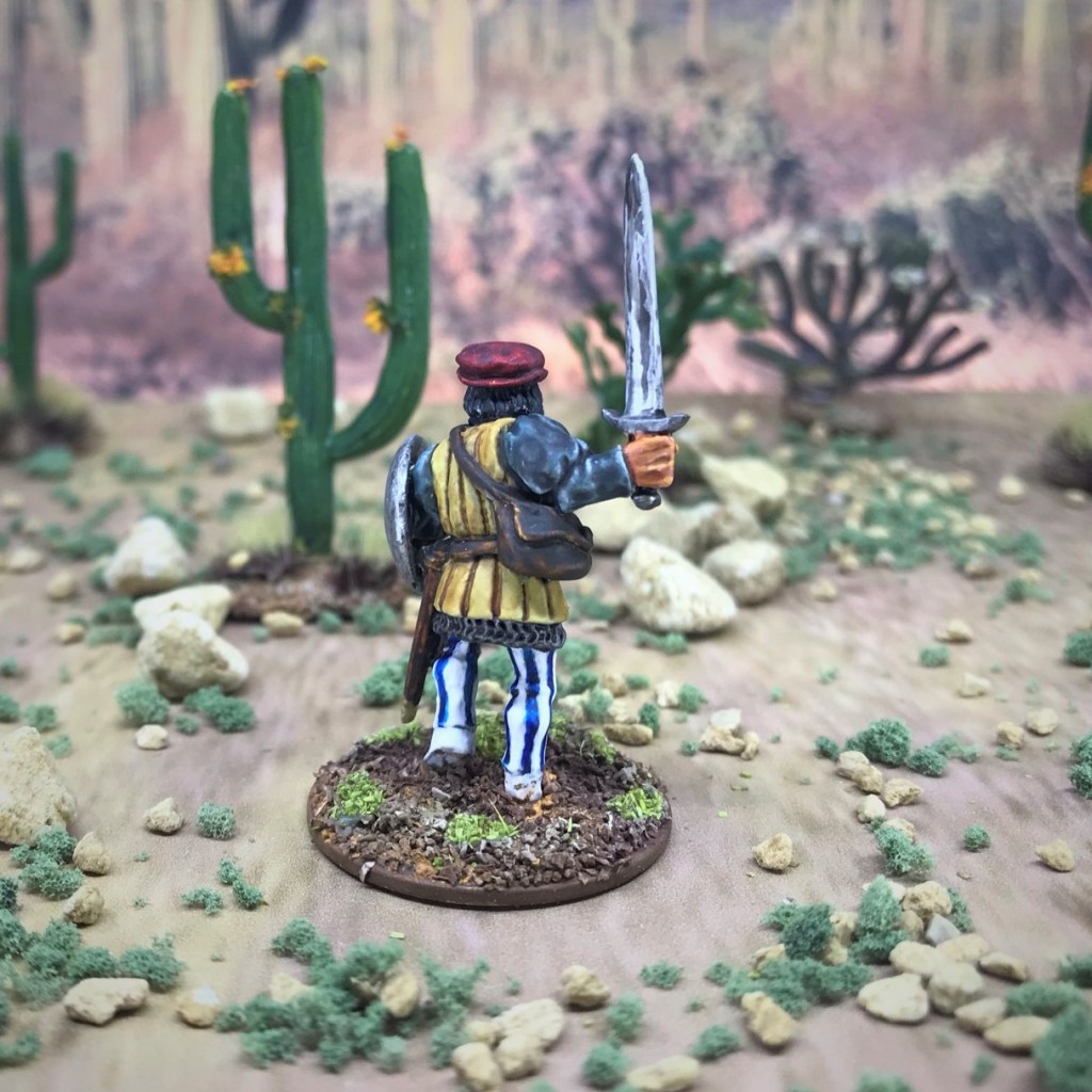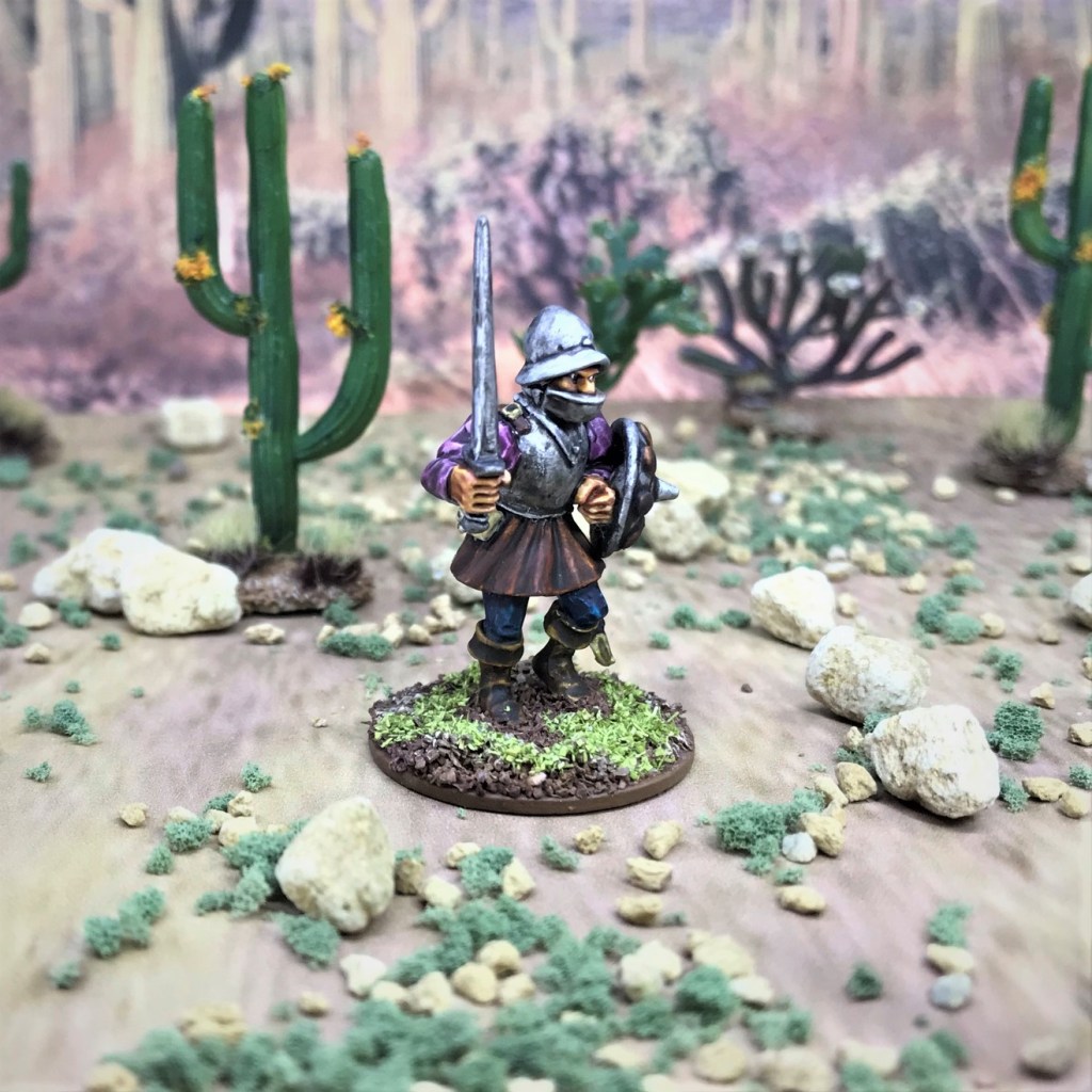 - Conquistador Sword and Buckler Men (this post). 18 figures total in three blister packs: Wargames Foundry #SB015 “Swaggering Swordsmen”, #SB016 “Brutal Sword and Buckler Men”, and #SB017 “Bold Bladesmen”.