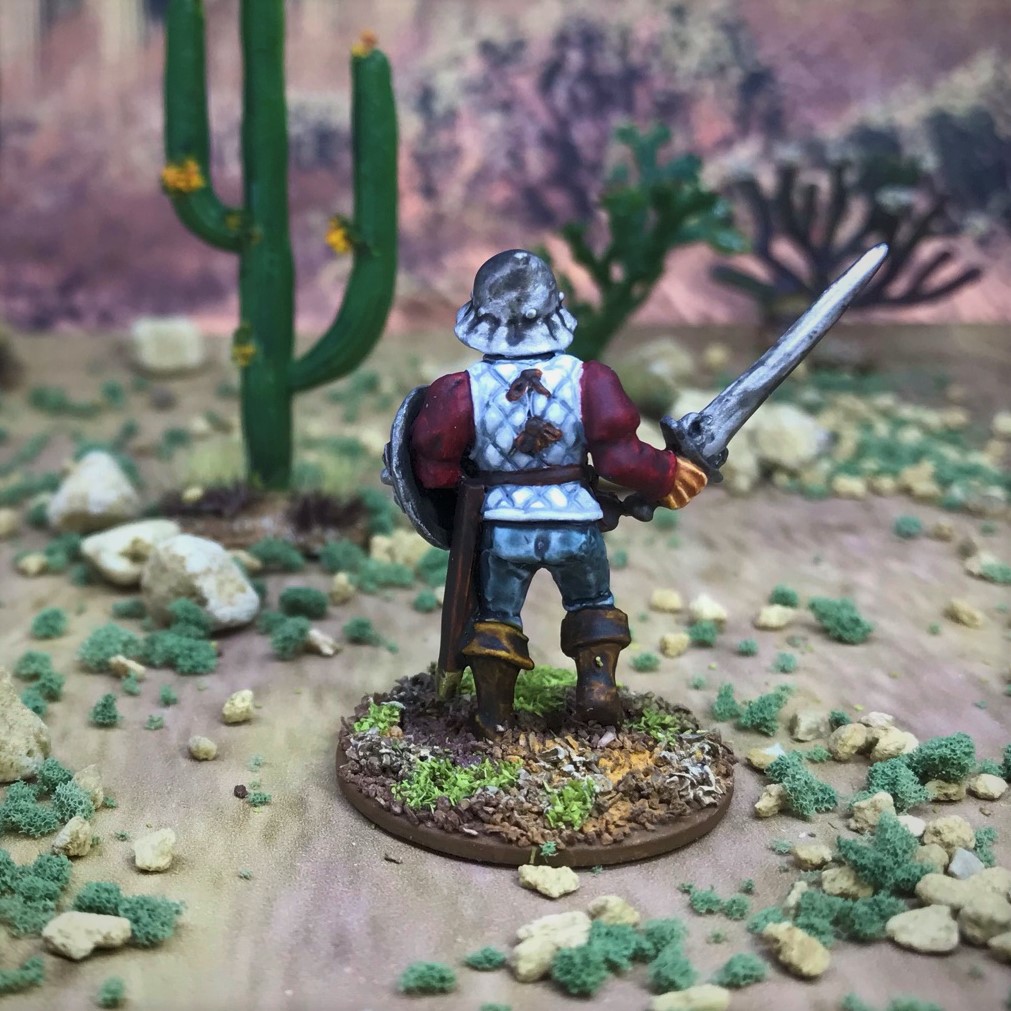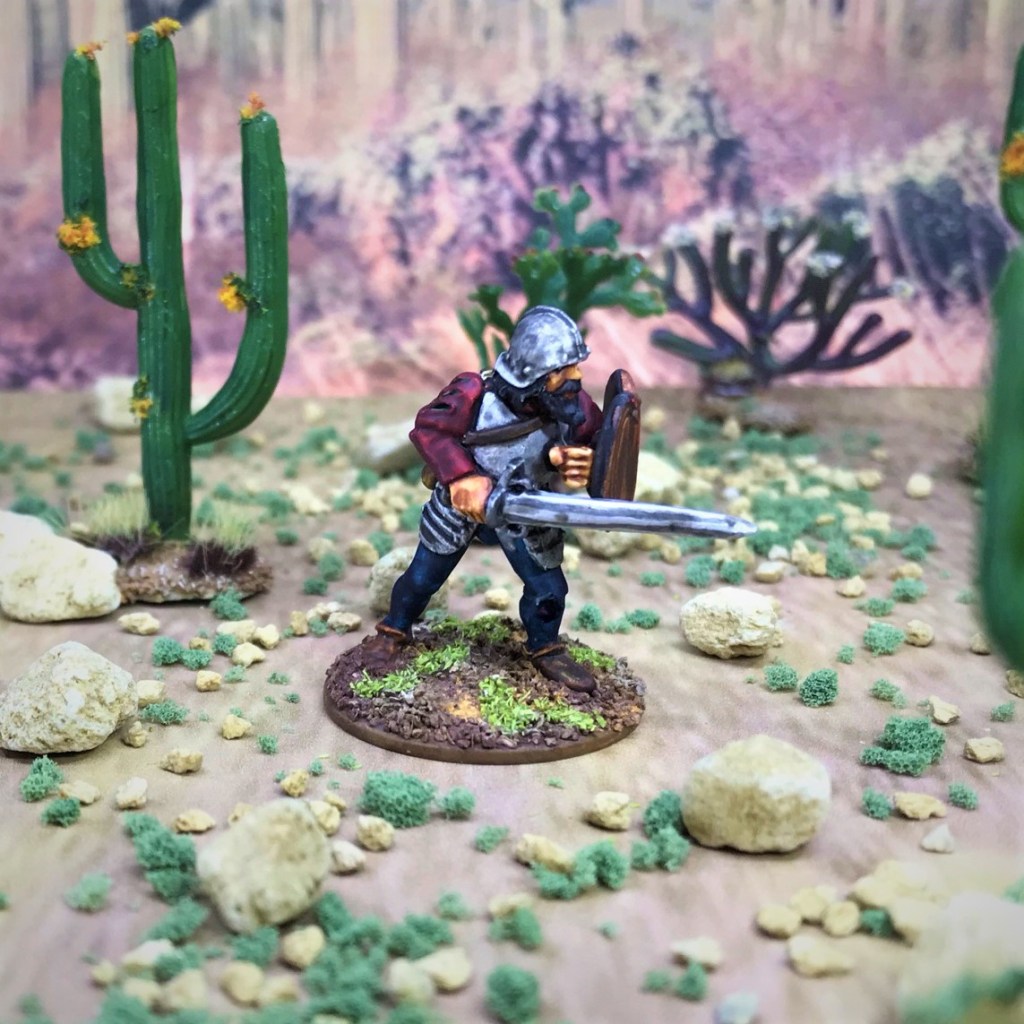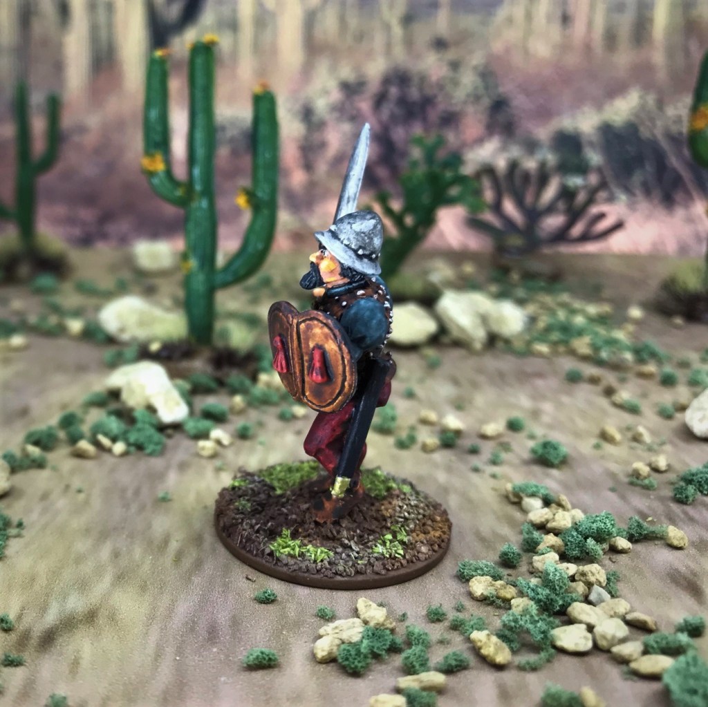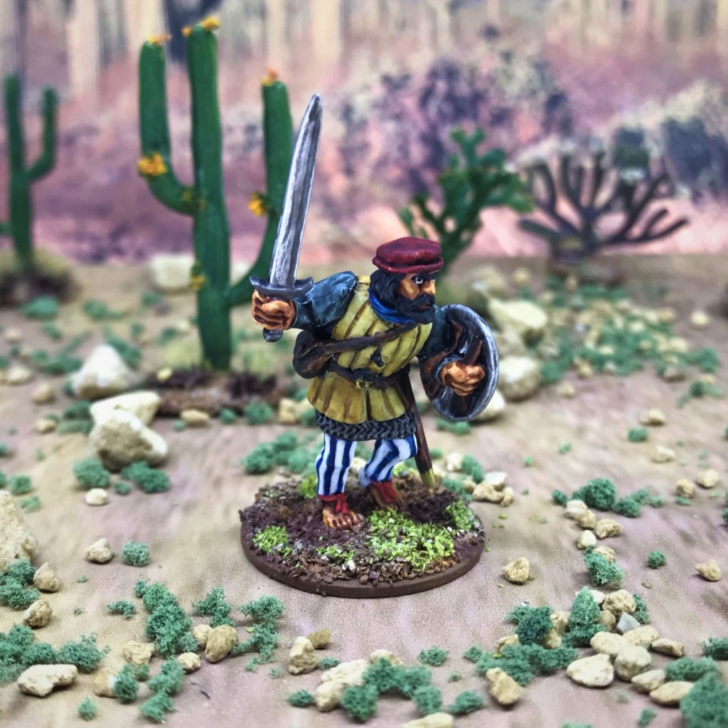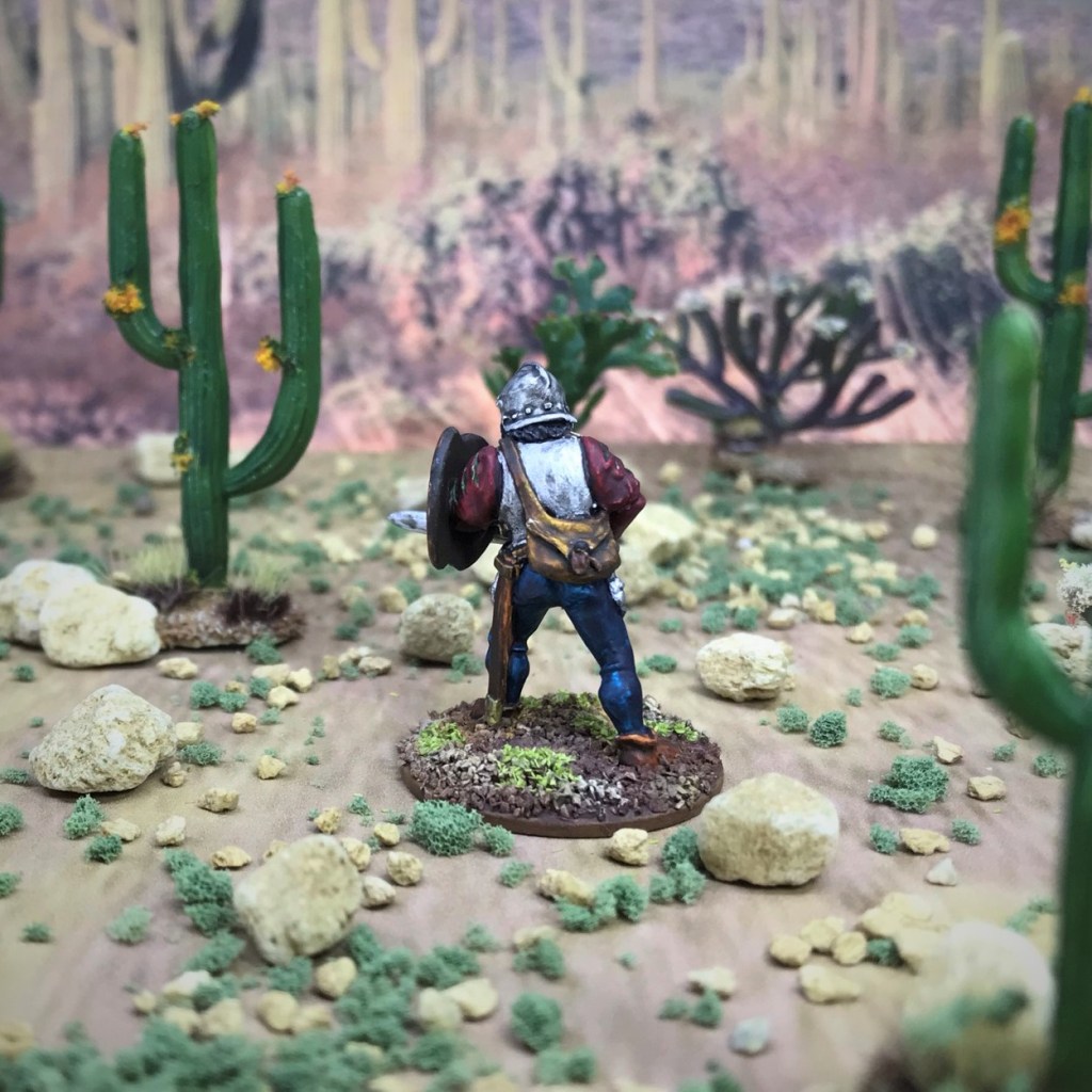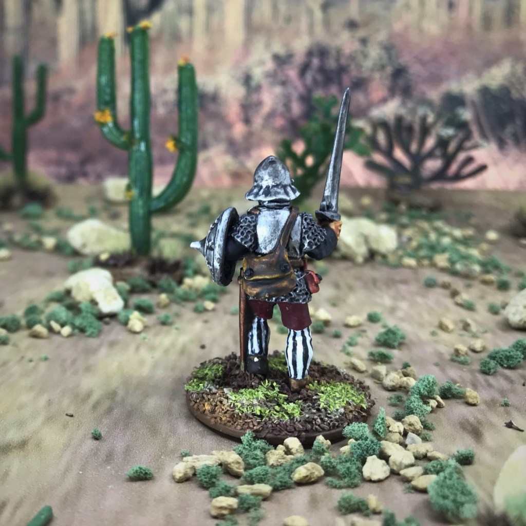 - Conquistador Sword and Buckler Men (this post). 18 figures total in three blister packs: Wargames Foundry #SB015 “Swaggering Swordsmen”, #SB016 “Brutal Sword and Buckler Men”, and #SB017 “Bold Bladesmen”.