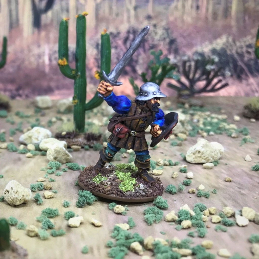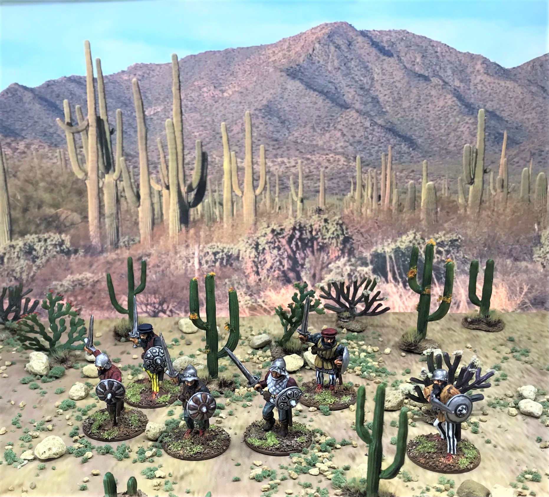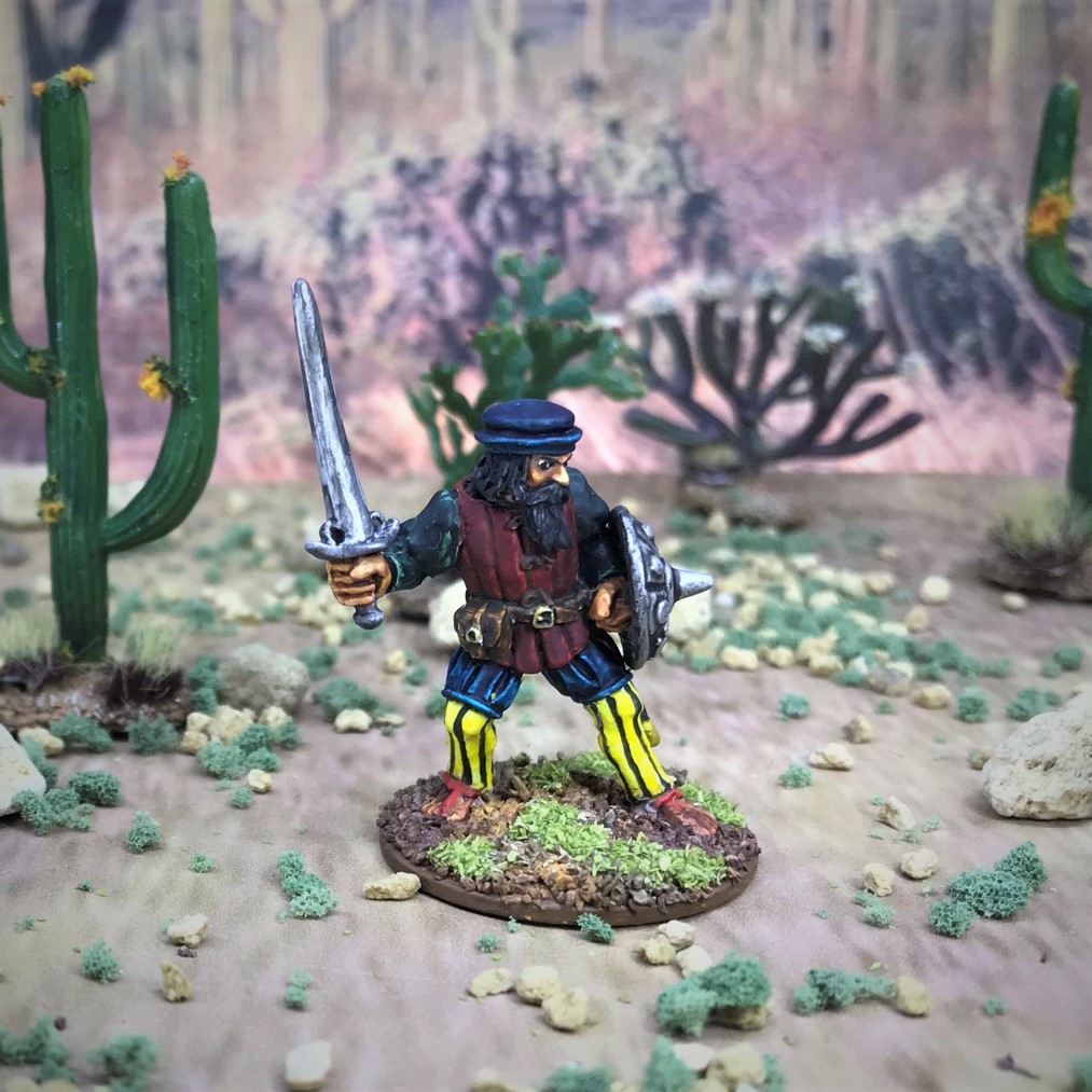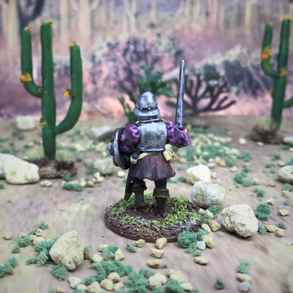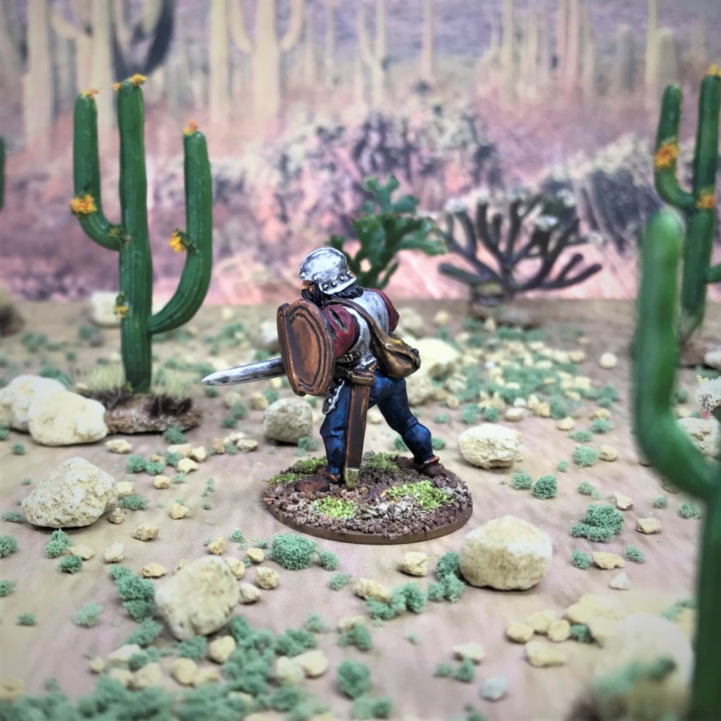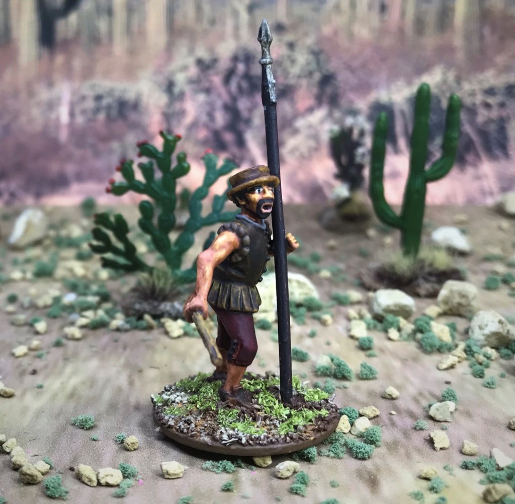 - Conquistador Sword and Buckler Men (this post). 18 figures total in three blister packs: Wargames Foundry #SB015 “Swaggering Swordsmen”, #SB016 “Brutal Sword and Buckler Men”, and #SB017 “Bold Bladesmen”.
