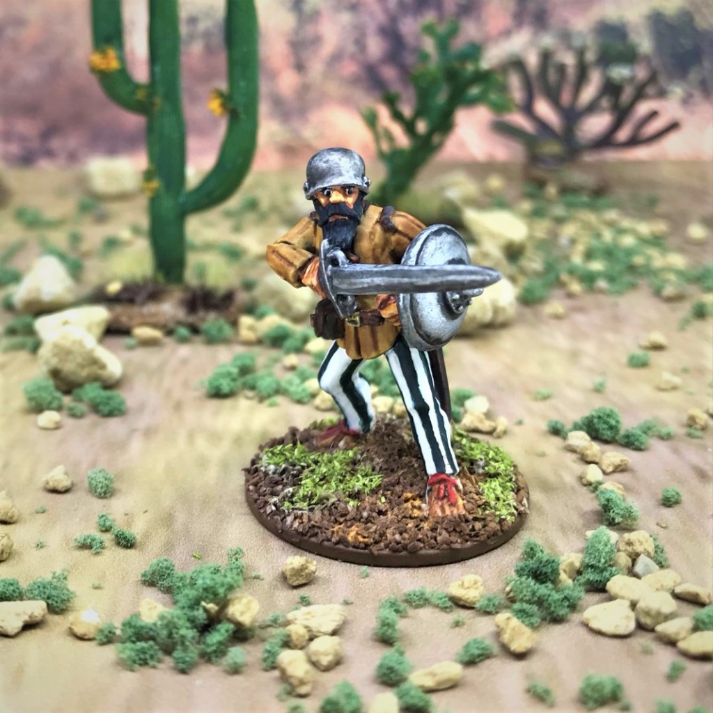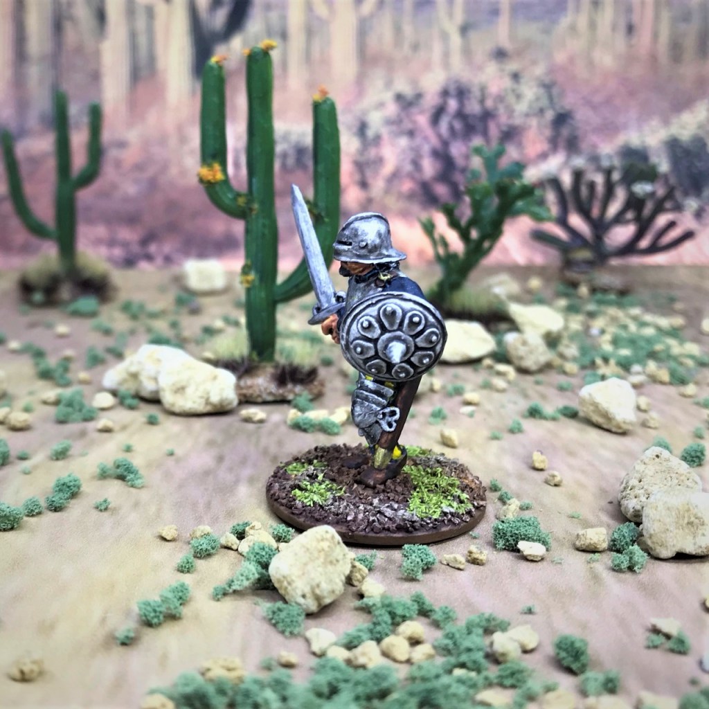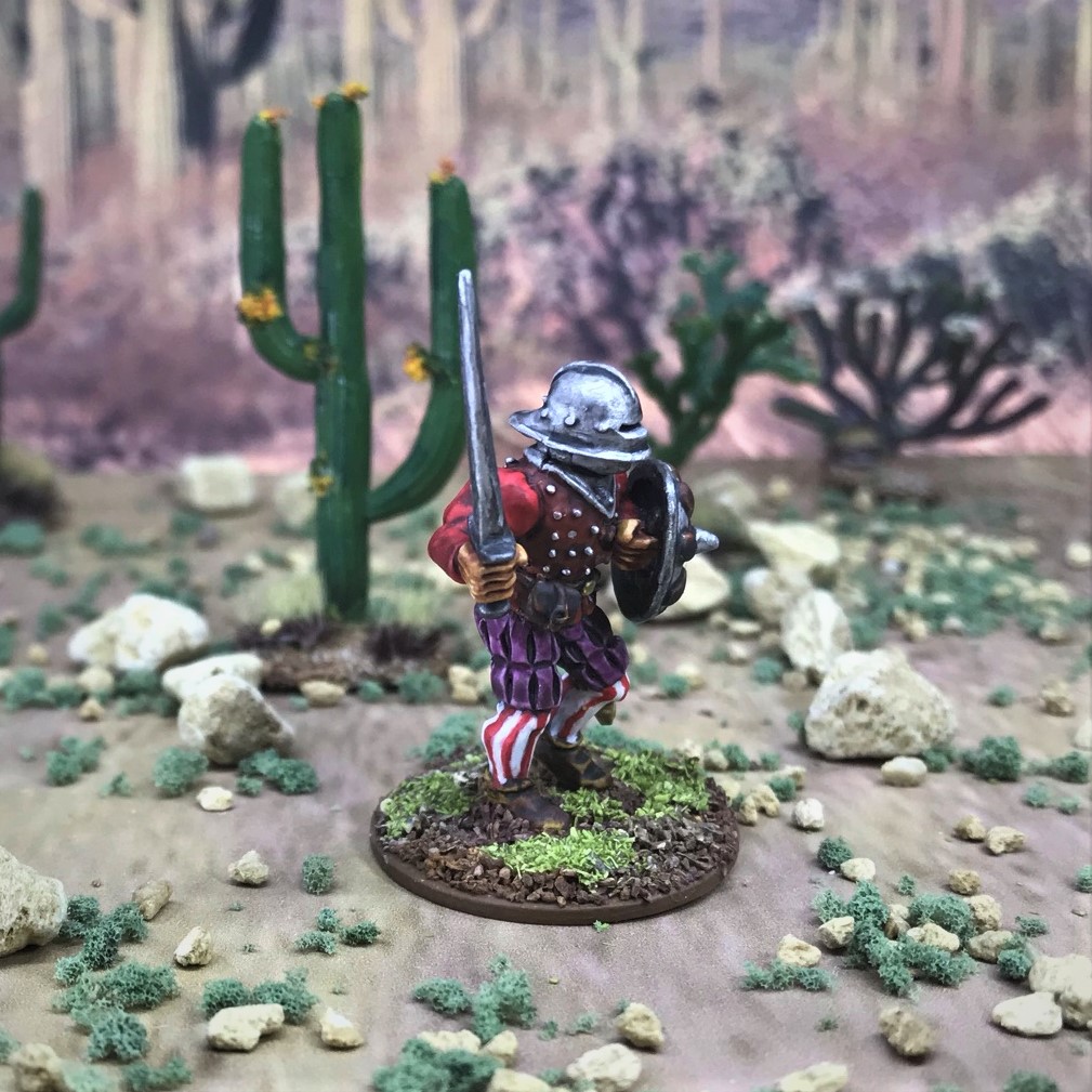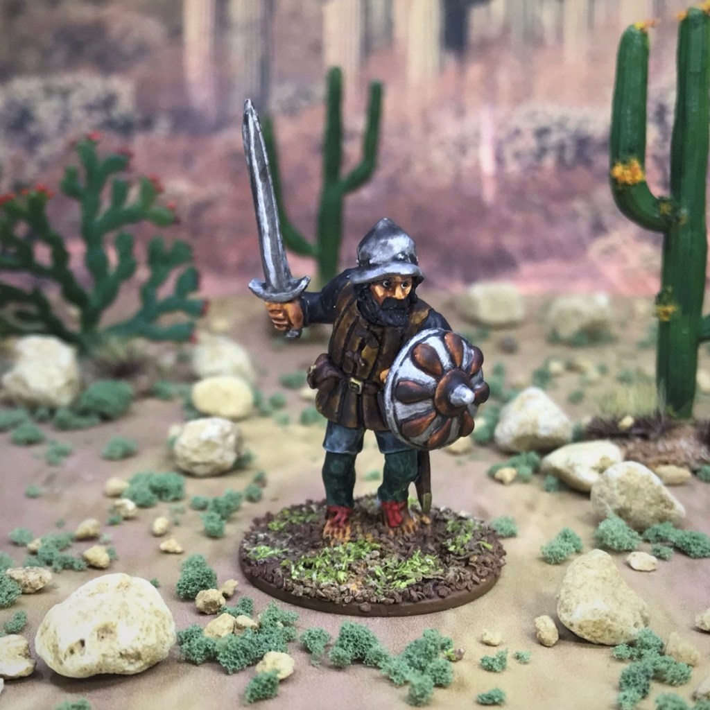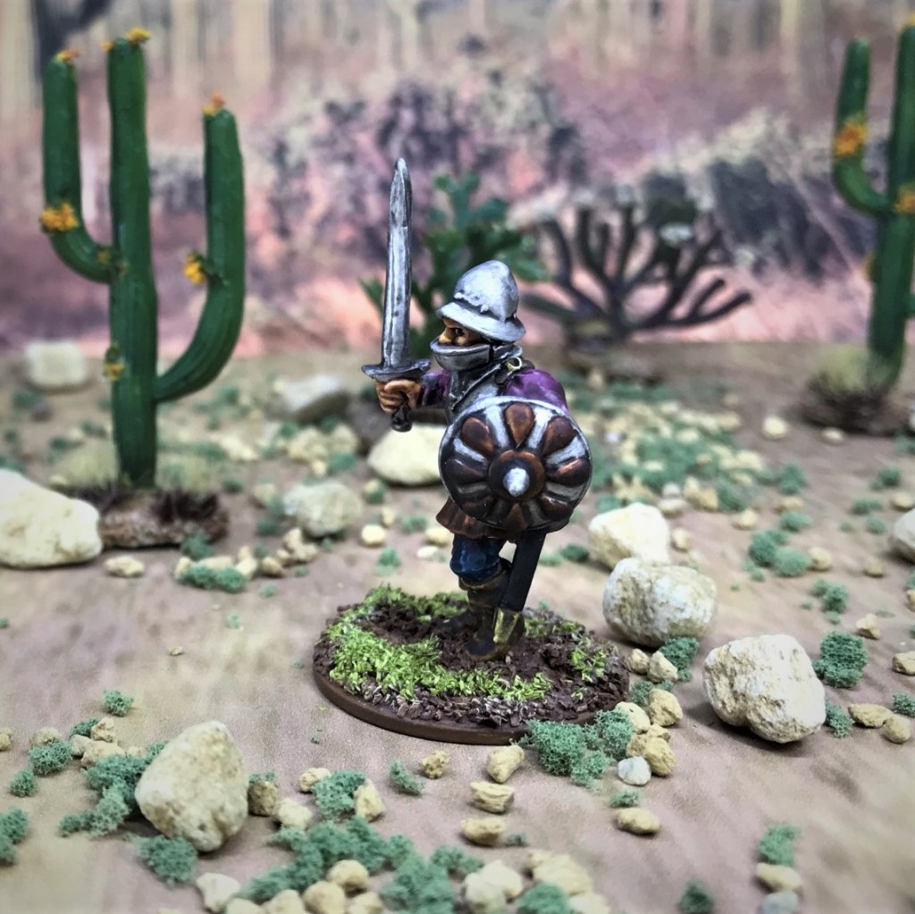 The English term “Sword and Buckler Men” refers to what the Spanish called rodeloros (shield bearers) and espadachines (swordsmen). For those unfamiliar with the term, a buckler is a small shield held by the fist and used mainly to deflect an opponent’s blows (as opposed to mainly protecting against missile weapons). The Conquistadores were professional soldiers and veterans of many wars – and Sword and Buckler Men made up the bulk of their number. It is well-known that the Conquistadores had a major impact during the Age of Discovery/Exploration. They had fought extensively in the Italian Wars (1494-1559) and had the spirit of the men who had driven the Moors from the Iberian peninsula back in 1492 during the Reconquista. The Conquistadores brought their experience and their warfighting characteristics to the New World.