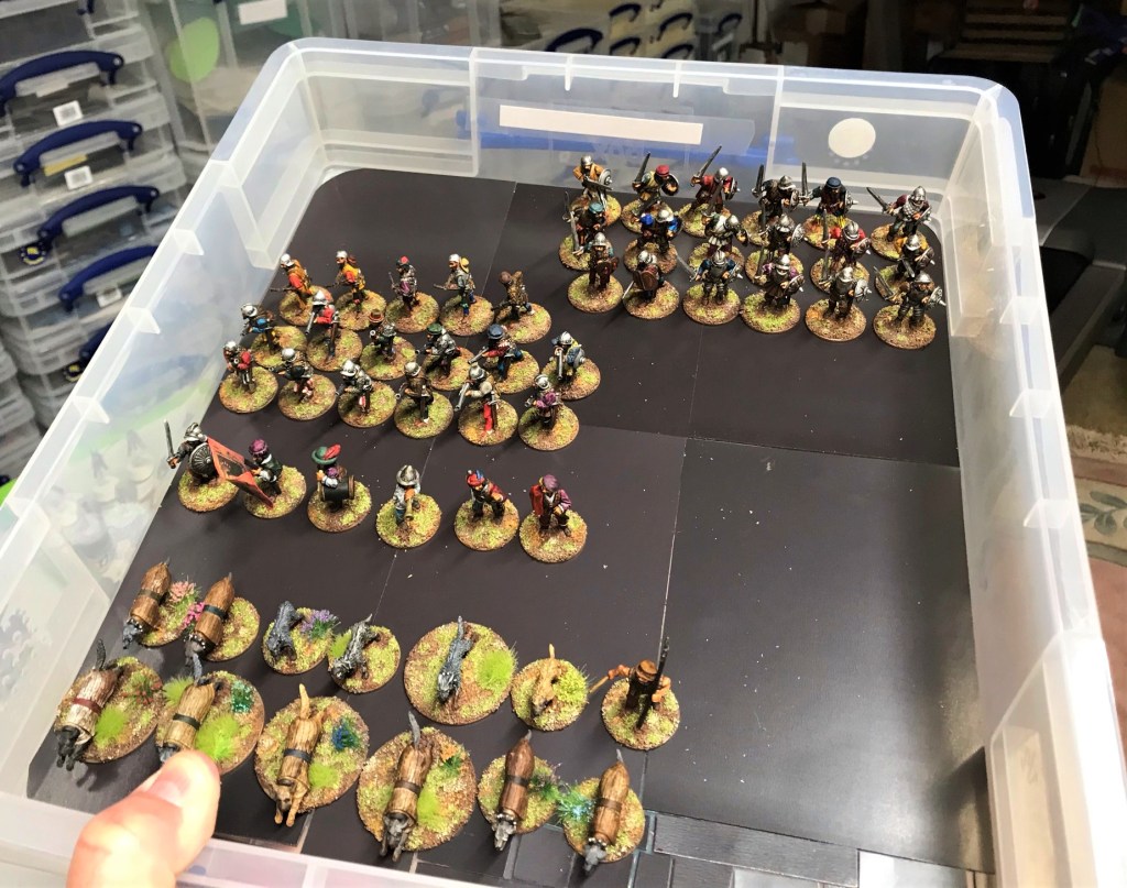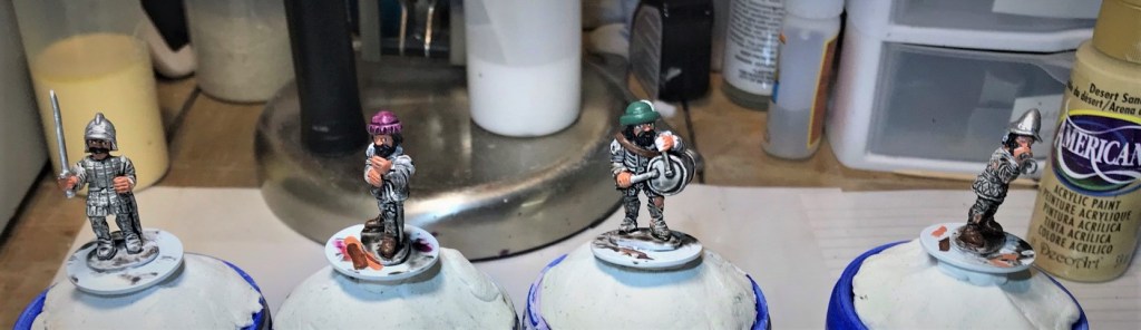 For my SABM, I got three blisters of Wargames Foundry 28mm metal SABM from Badger Games. Each had 6 figures, all Mark Copplestone sculpts (who also sculpted the arquebusiers I posted about previously here and here). These are really beautiful sculpts – and I am glad I got them. The three SKU’s were SB015 “Swaggering Swordsmen”, SB016 “Brutal Sword and Buckler Men”, and SB017 “Bold Bladesmen”. After I finished my War Dogs, I decided that it would be best to do all of these figures together. They are by the same sculptor, and I wanted to have some differentiation among them. I jumped into painting these 18 SABM on January 12th and finished them on January 28th (and I have 8 more SABM to do from OWS but that’s a future post). I was pretty happy with that pace of production given that I had a few distractions on the way (like snow removal, Board of Health work, auto repair, etc.). I also need to catch up on blog posts I follow – and I will indeed do that too.