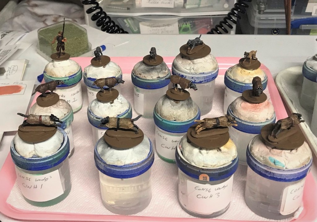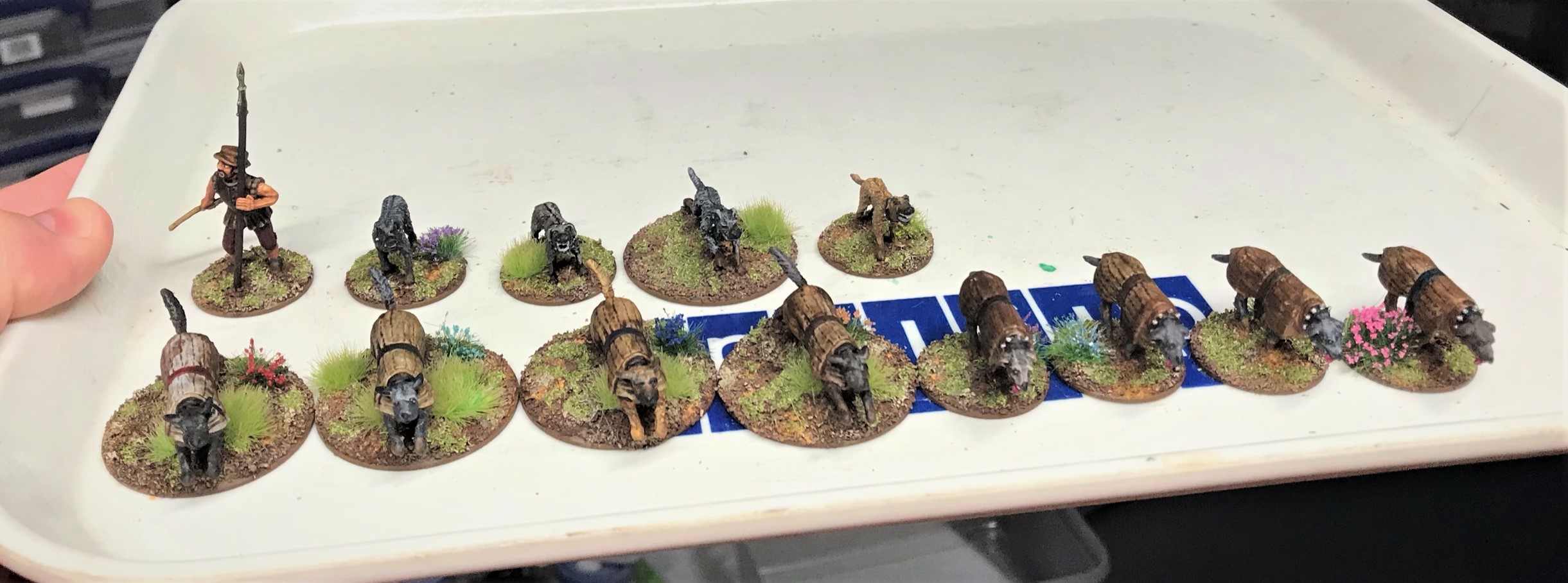 - Perro de Guerra (Conquistador War Dogs). 13 figures total: Outpost Wargames Services #CONS6 “War Dogs” (8 war dogs); Eureka #100CON13 “Dog Handler and Dogs” (1 dog handler/pikeman and 4 war dogs)