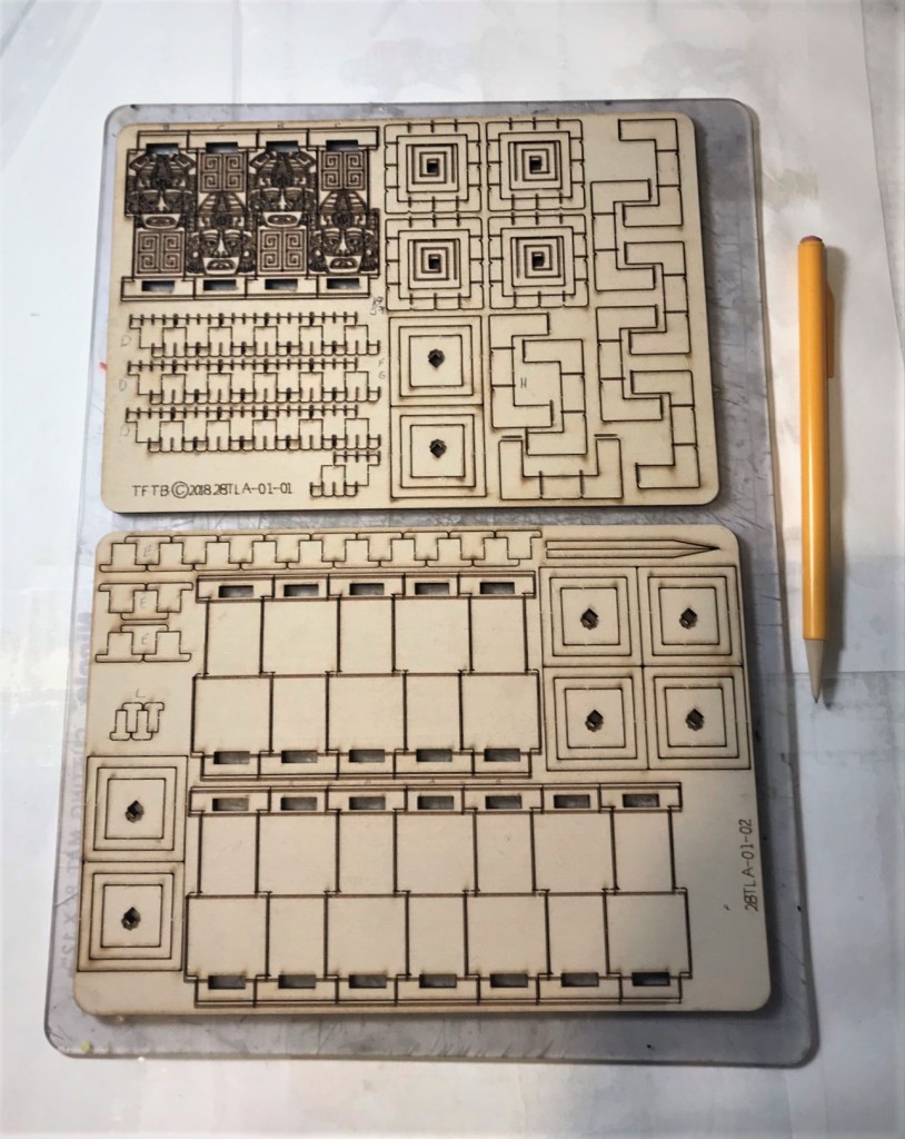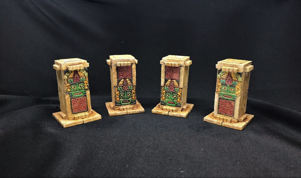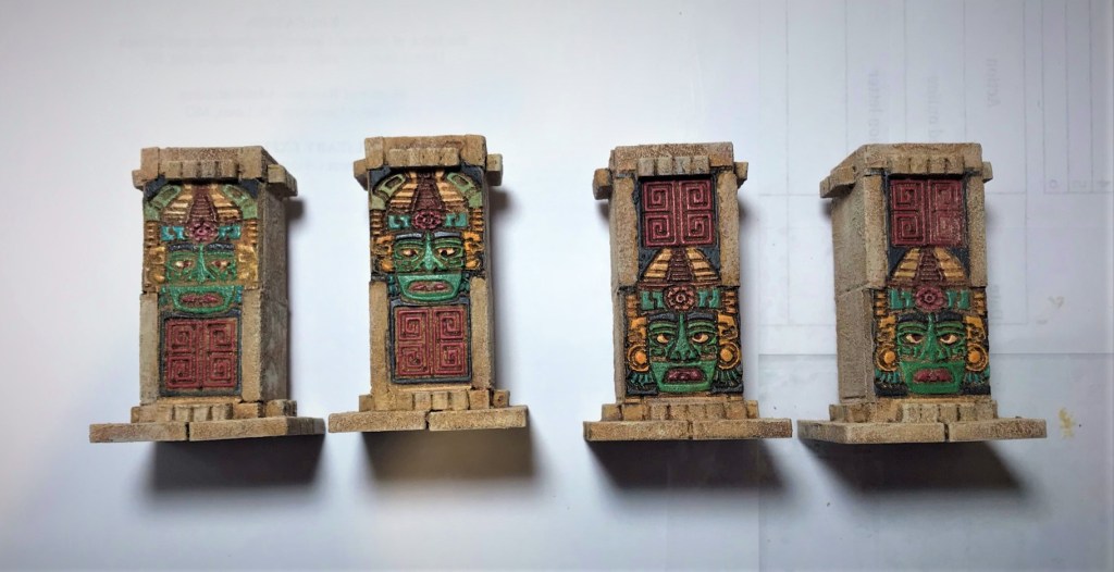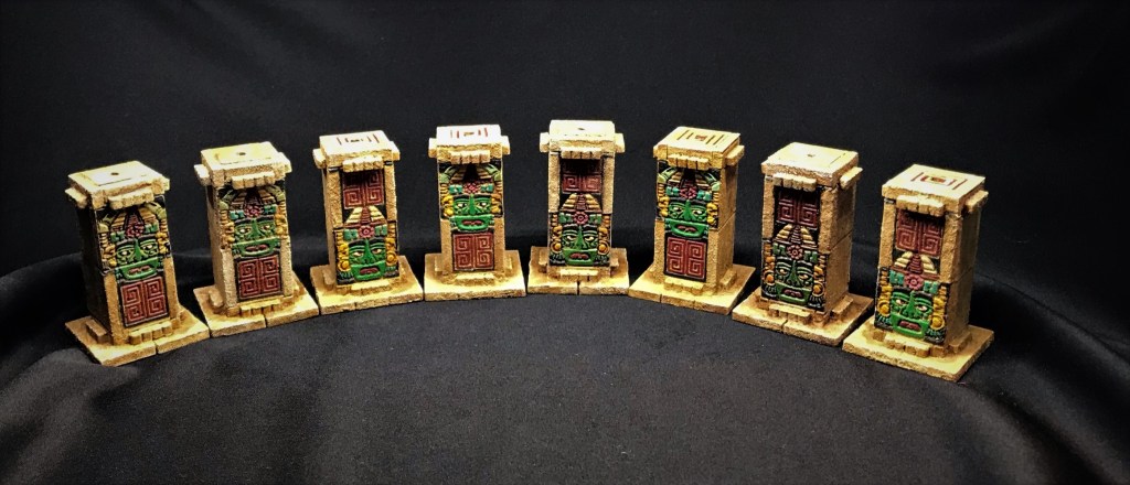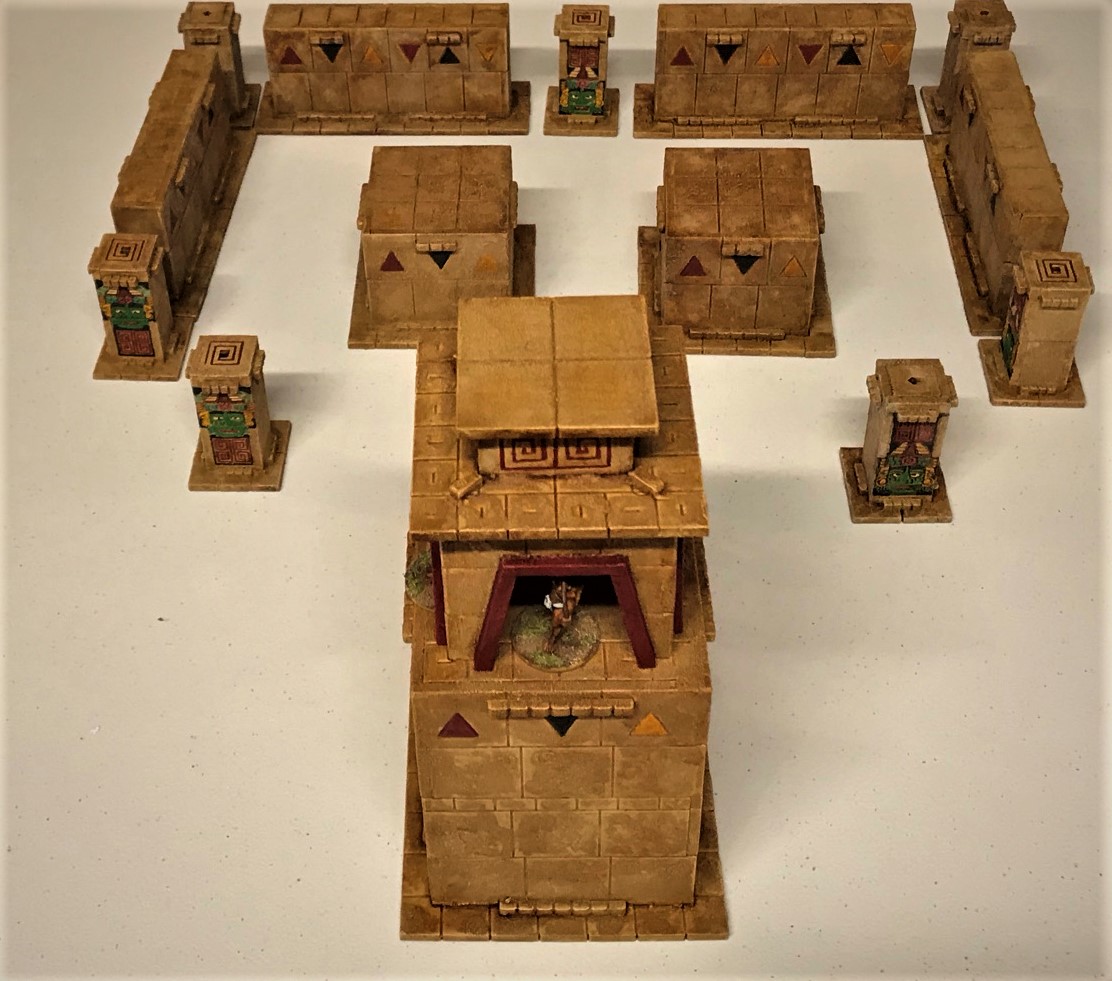 This post will cover the Aztec resin terrain/structures from Acheson Creations that I have recently finished for my Feudal Patrol™ games in Mesoamerica (using my Civilizations Collide supplement). I purchased 6 structures from the company, and they were kind enough to throw in some scatter terrain that I believe will prove to be quite useful. The six buildings plus the 4 scatter pieces are all part of “Mark’s Aztec Building Challenge Contest“, as are all of the MDF I listed in the original contest post. While the buildings in this post would be probably more suited to a rural setting versus a cityscape, I think that the scatter terrain will be useful in several gaming ways.