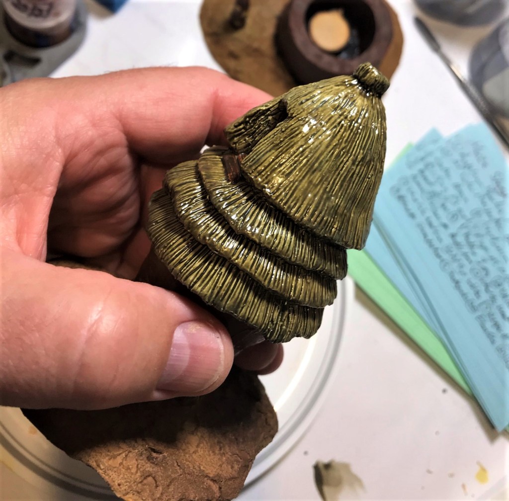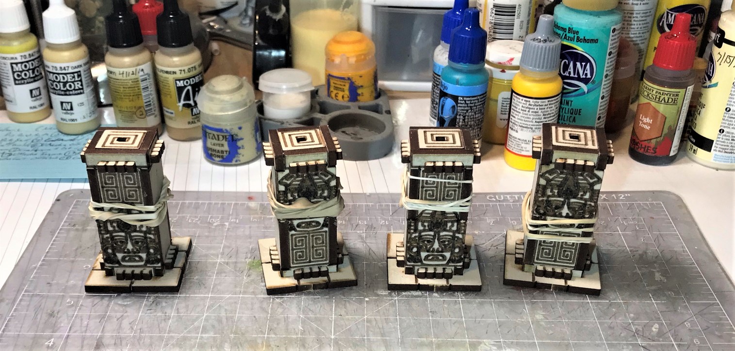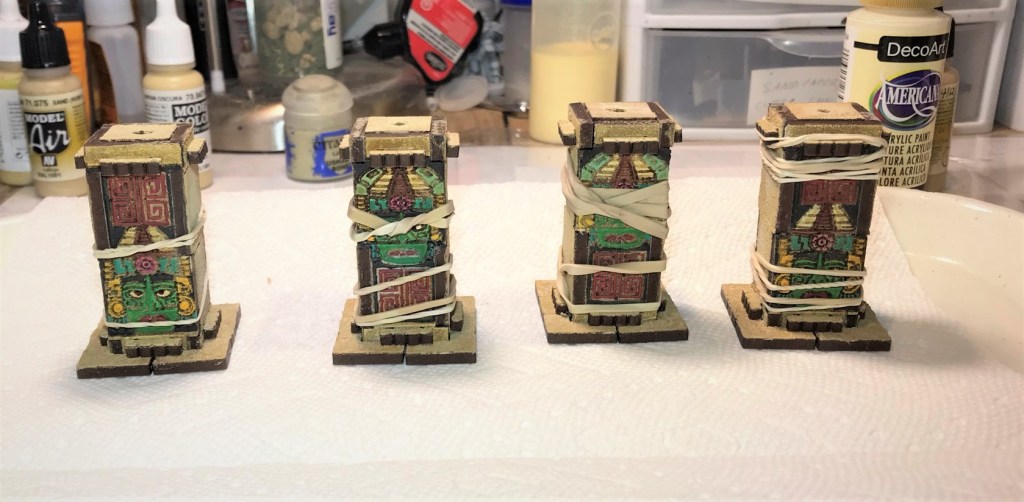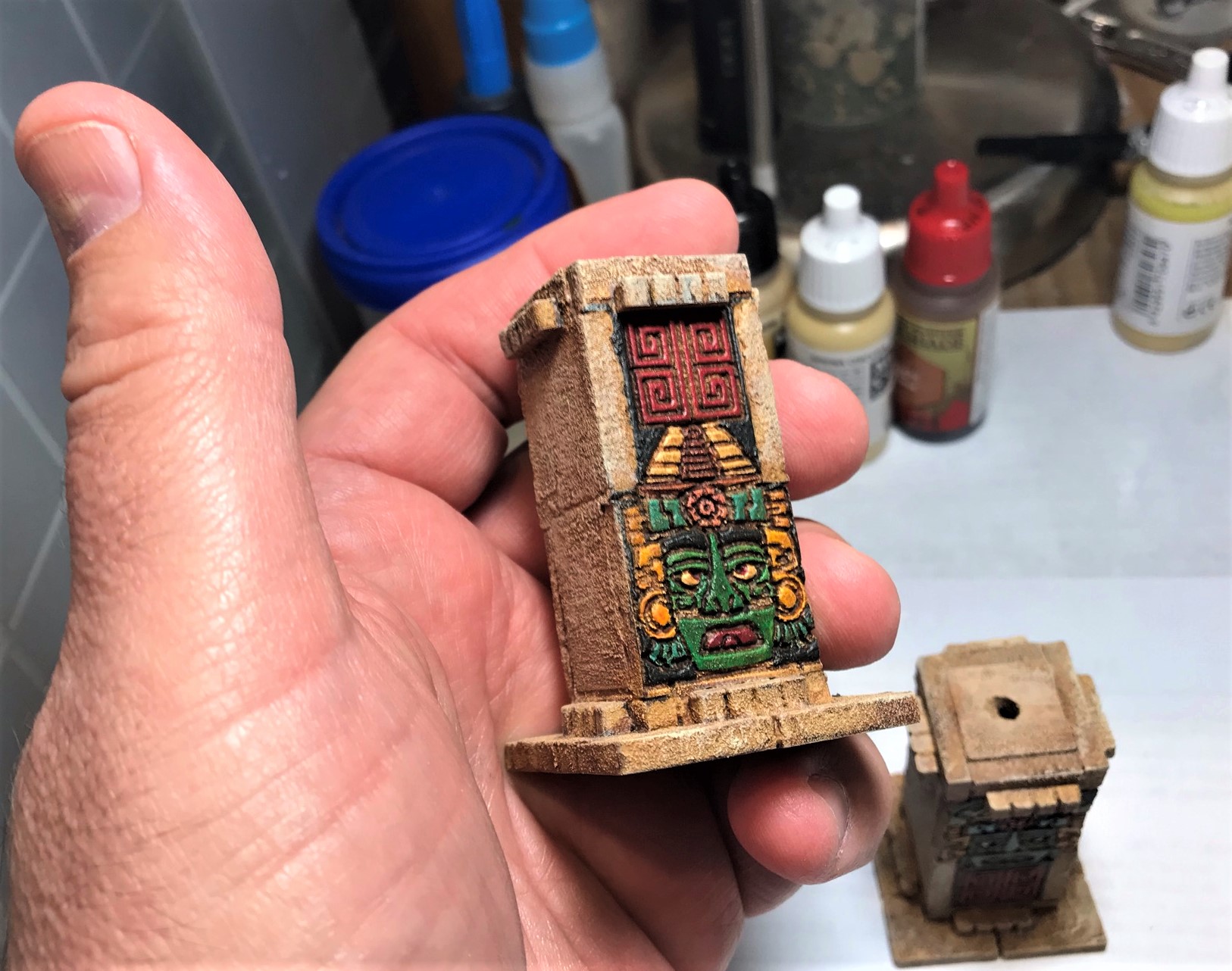 These will be nice treasure markers for the games. I played with some shiny (and tiny) beads (from Japan) and Swarovski glittery crystals from Michaels to make the treasure and fill the pots over some steel BB’s. I also had a chance to do some minimal Aztec freehand work on the pots.