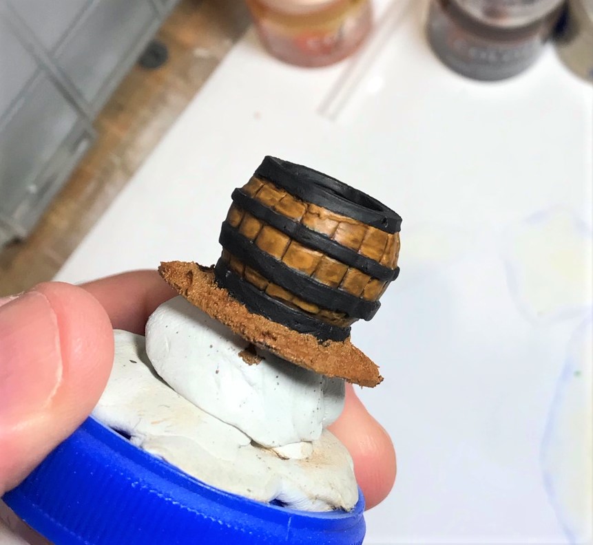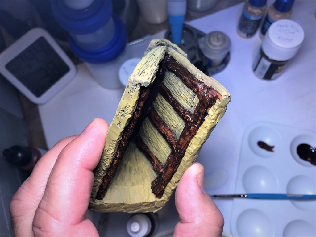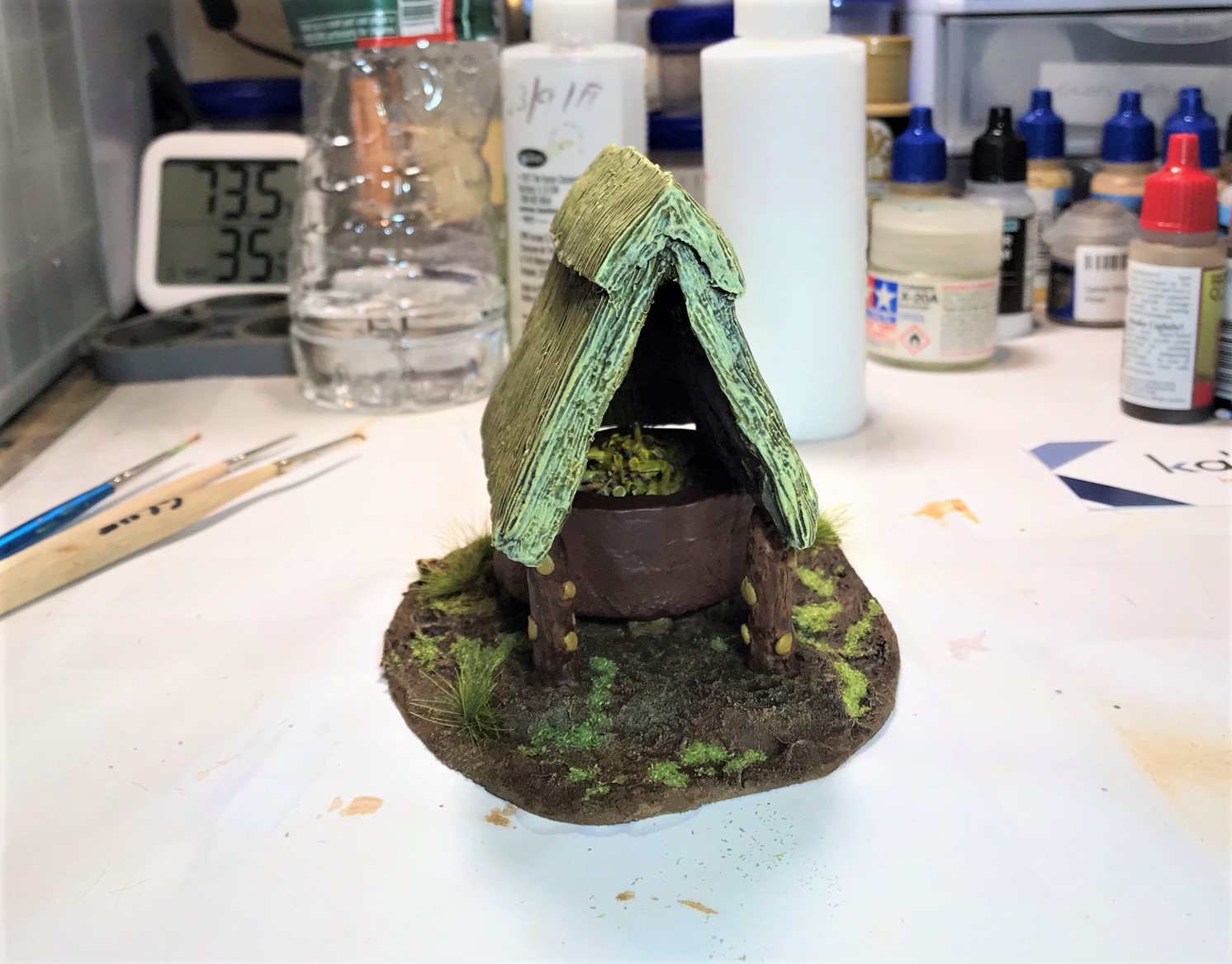 This piece had a few areas that I worked to improve upon. One was to fill an open storage well with “maize” – or at least something that could approximate it. Another was to convert the dowel-like smooth front pillars into a more convincing-looking pair of period wooden supports. The pillars did have a slight wood grain, but I wanted to make them more rustic. Lastly, I did need to do some drilling and magnet installation so as to allow the piece to stay together. As with all of the other pieces here with separate roofs, I needed to finish the inside of the roof (including up to varnishing) before I finished the outside.