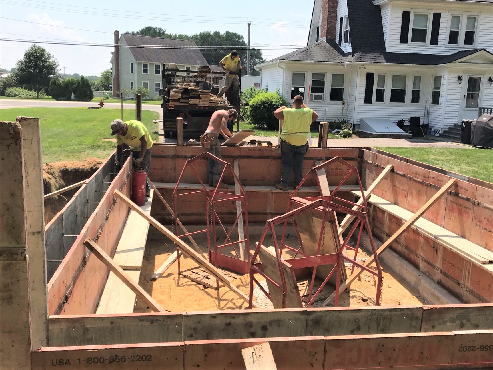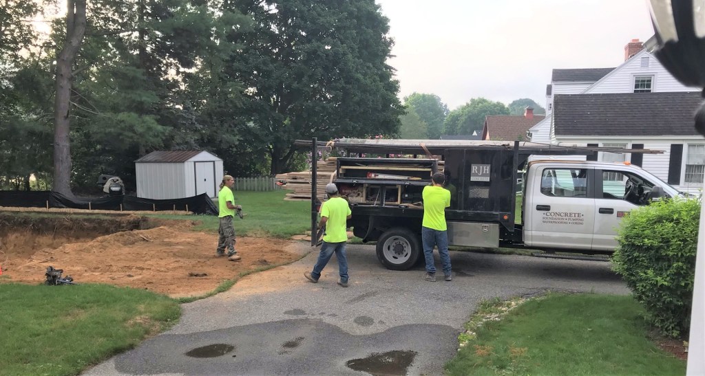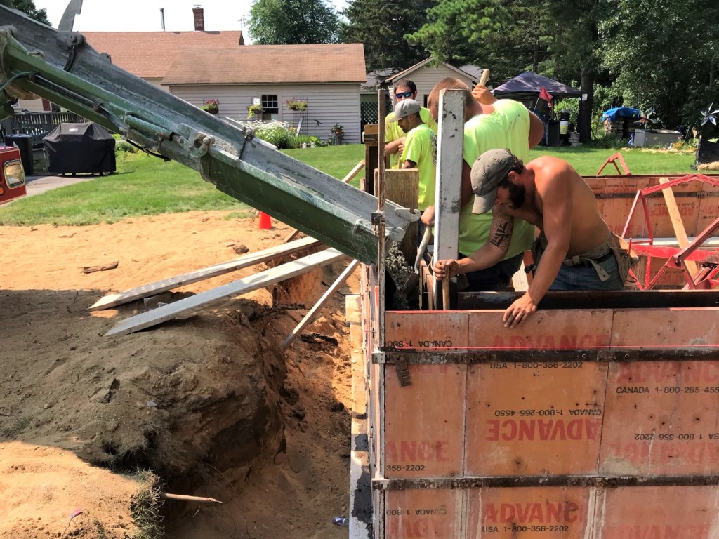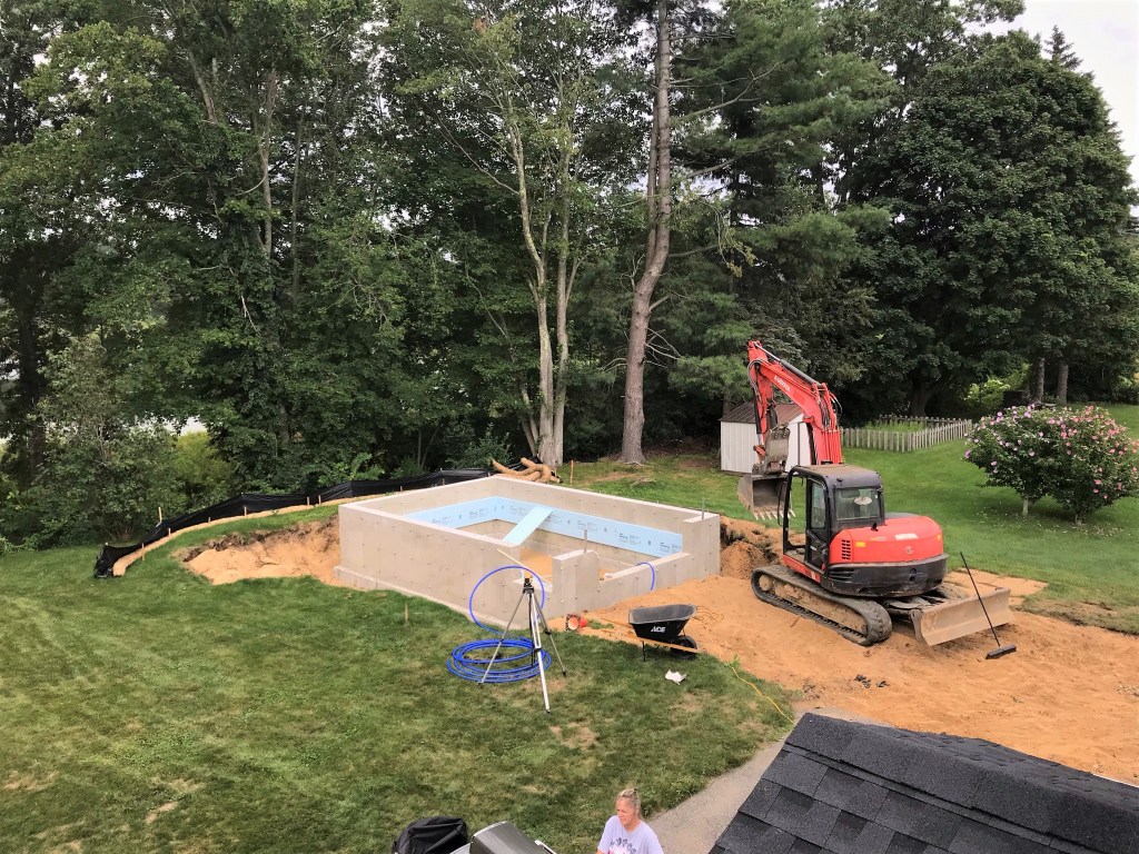 This week on the Garage+ project saw the installation of the concrete footer and the walls – as well as inspection of the foundation. The RJH Concrete crews, under Andy Cormier Homebuilding, did a great job and worked fast on a few warmer July days. The photos below tell the tale.
