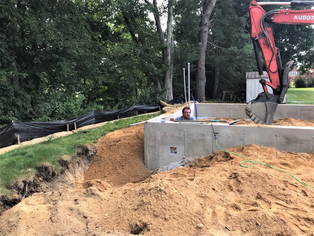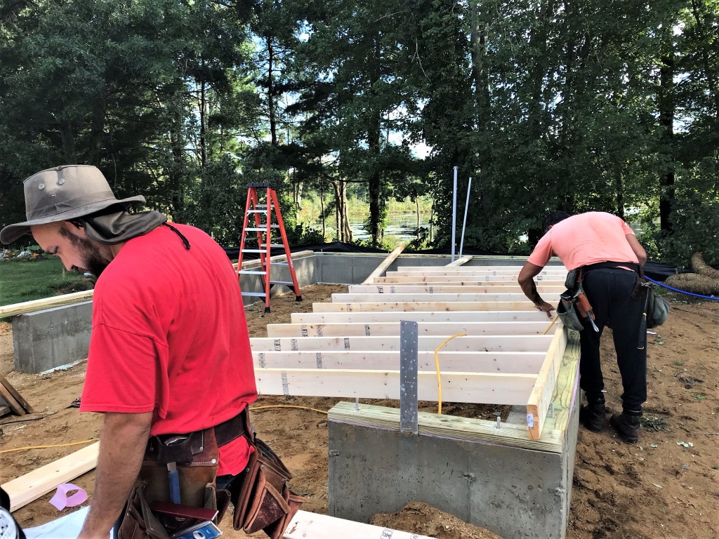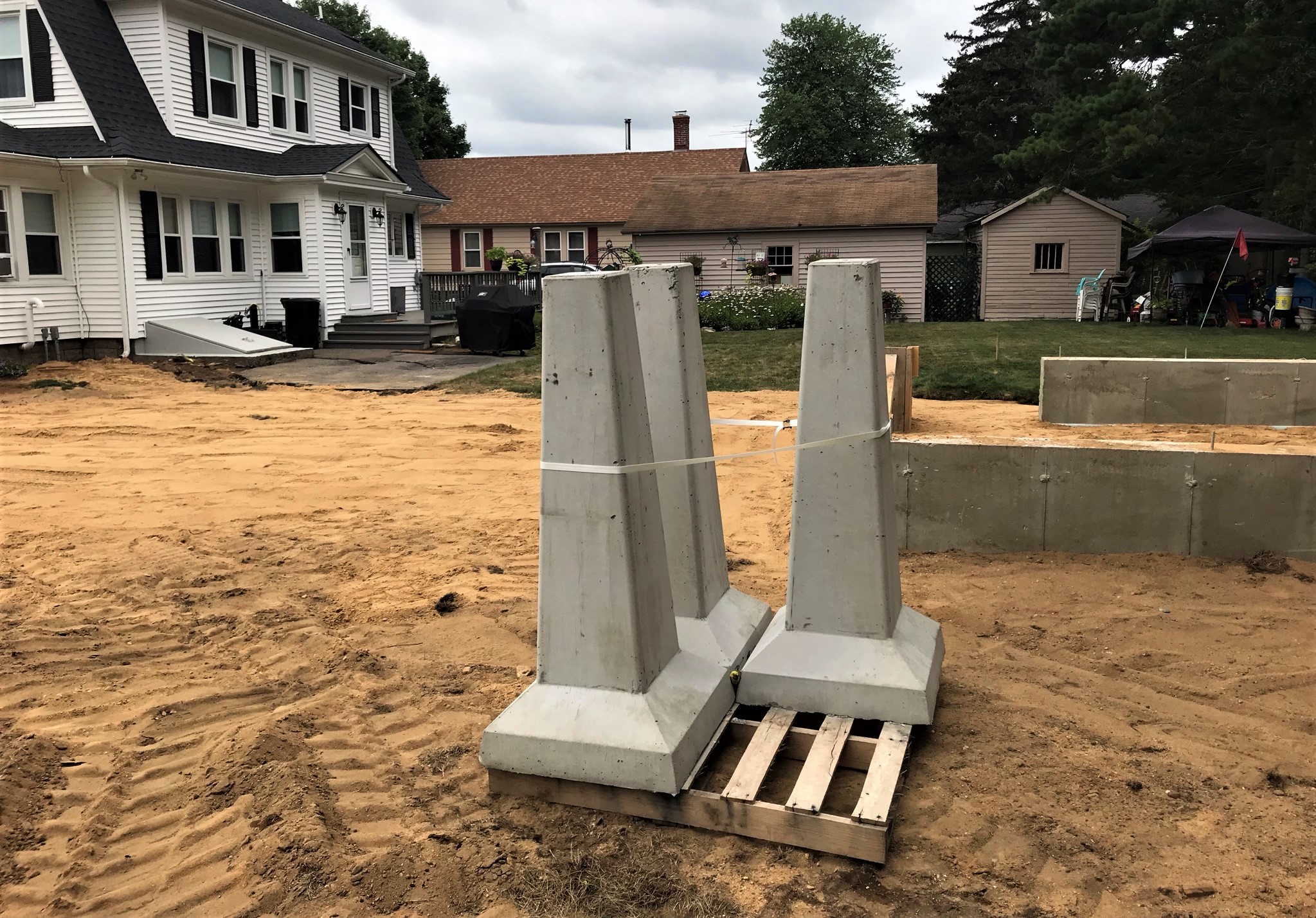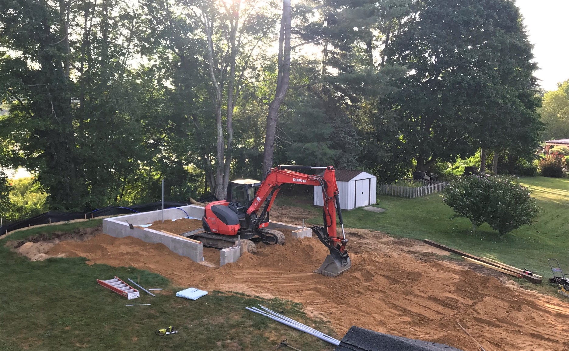 Friday the project got held up as we needed to get the deck piers excavated – and the excavator did not make it to the site. Also, the pre-fabricated concrete deck piers would need to be moved to the other side of the building, and they weigh about 600 lbs. each. Ironically, the heat broke Thursday night and Friday was nice and in the 70’s. But it is August, so….the heat will be back, even in September. Of course it could snow in October…