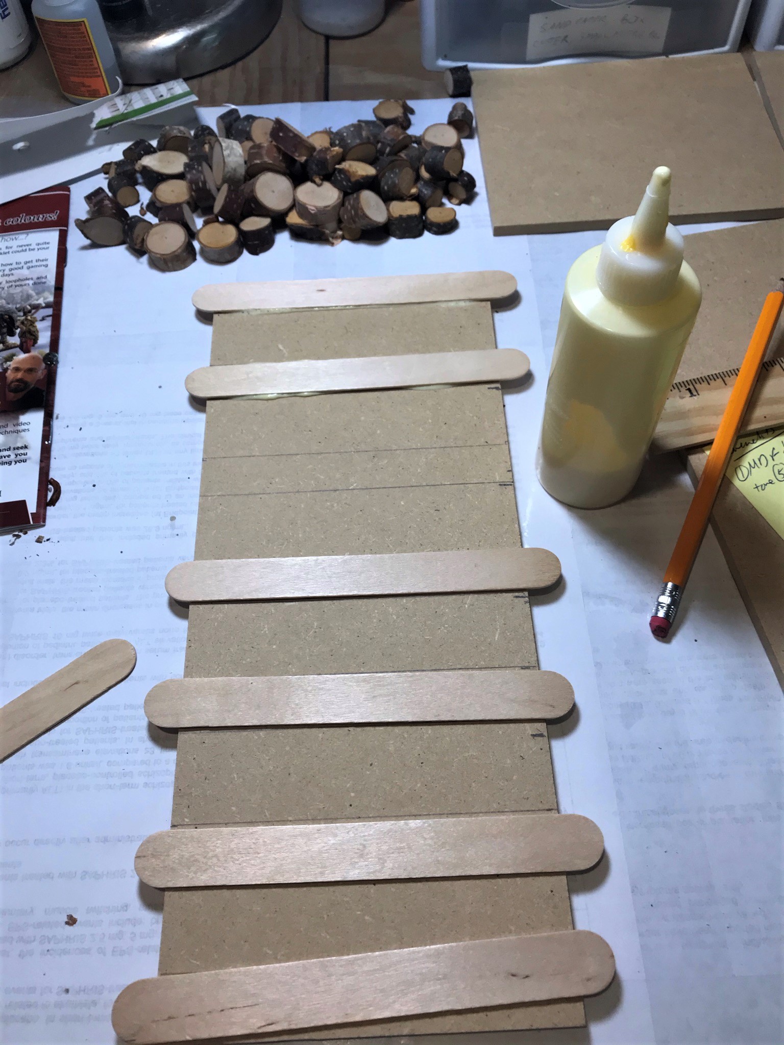 My causeway section prototype would be 5″ wide and a foot long. I spaced out some 6″ craft sticks evenly across the bottom and used wood glue to affix them. These would be to support the wooden piers and stones around them on the sides of the top surface. This worked ok, so I did all six with the cross-glued craft sticks.