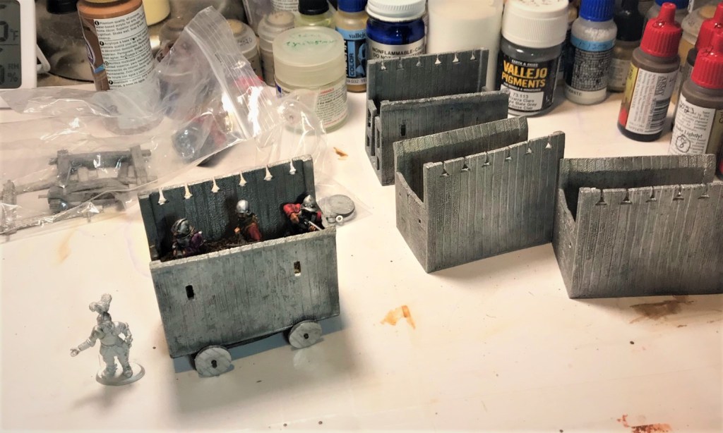 Yes! I had found my solution! I ordered four from them, and the company was great. They even gave me a free Cortes figure (which I will paint soon I hope). Even better, these were solid METAL. Assembly was just adding the undercarriage axle supports, the wheels, and a wheel spacer. There are two benches inside and I can get two figures into the wagon. One challenge faced me that was new – no brush or angled brush would reach under the benches for painting. They do look nice though.