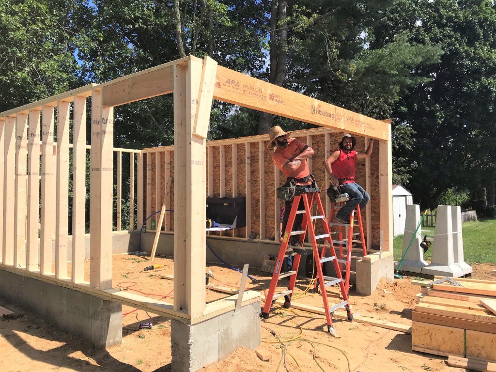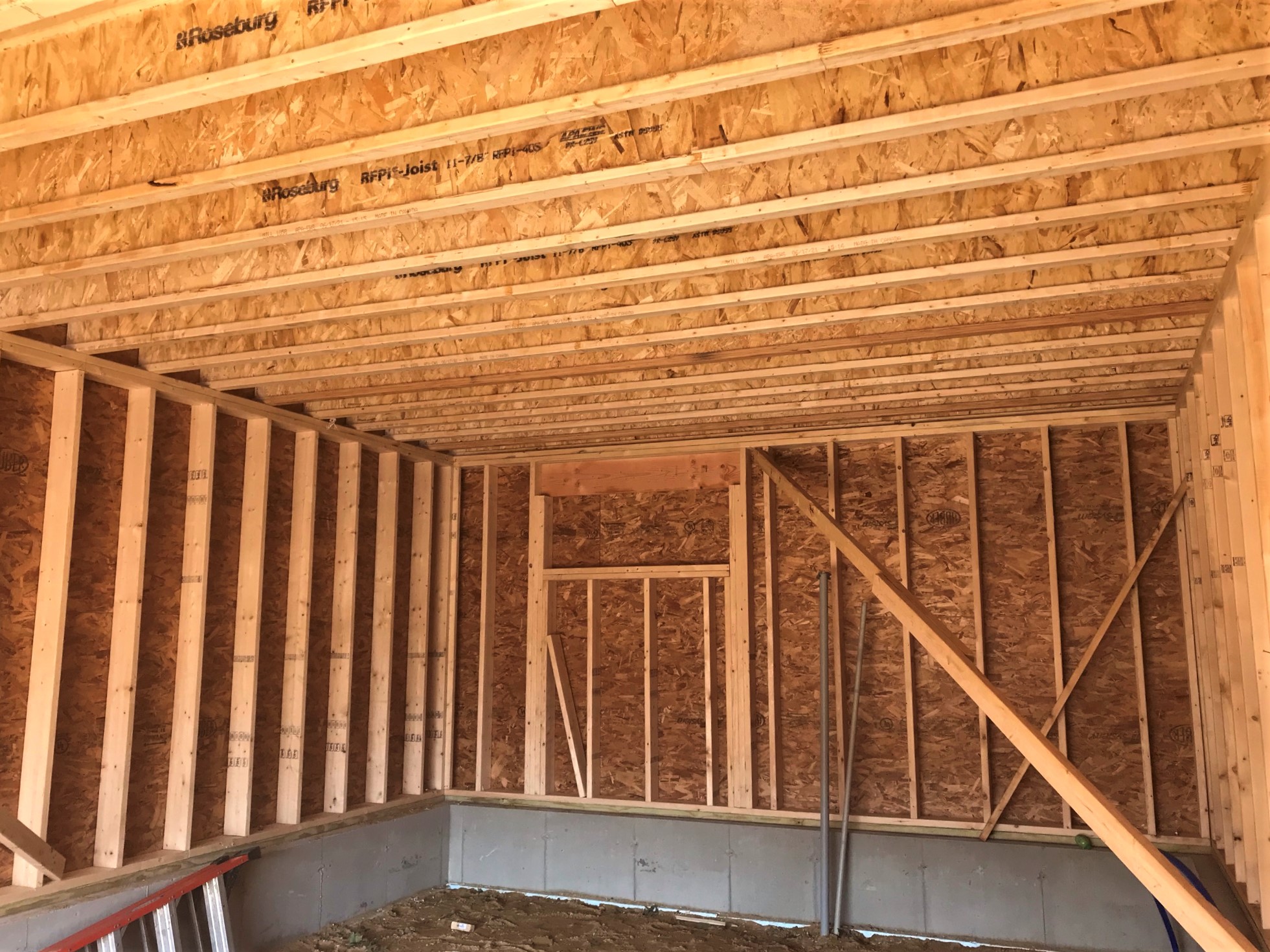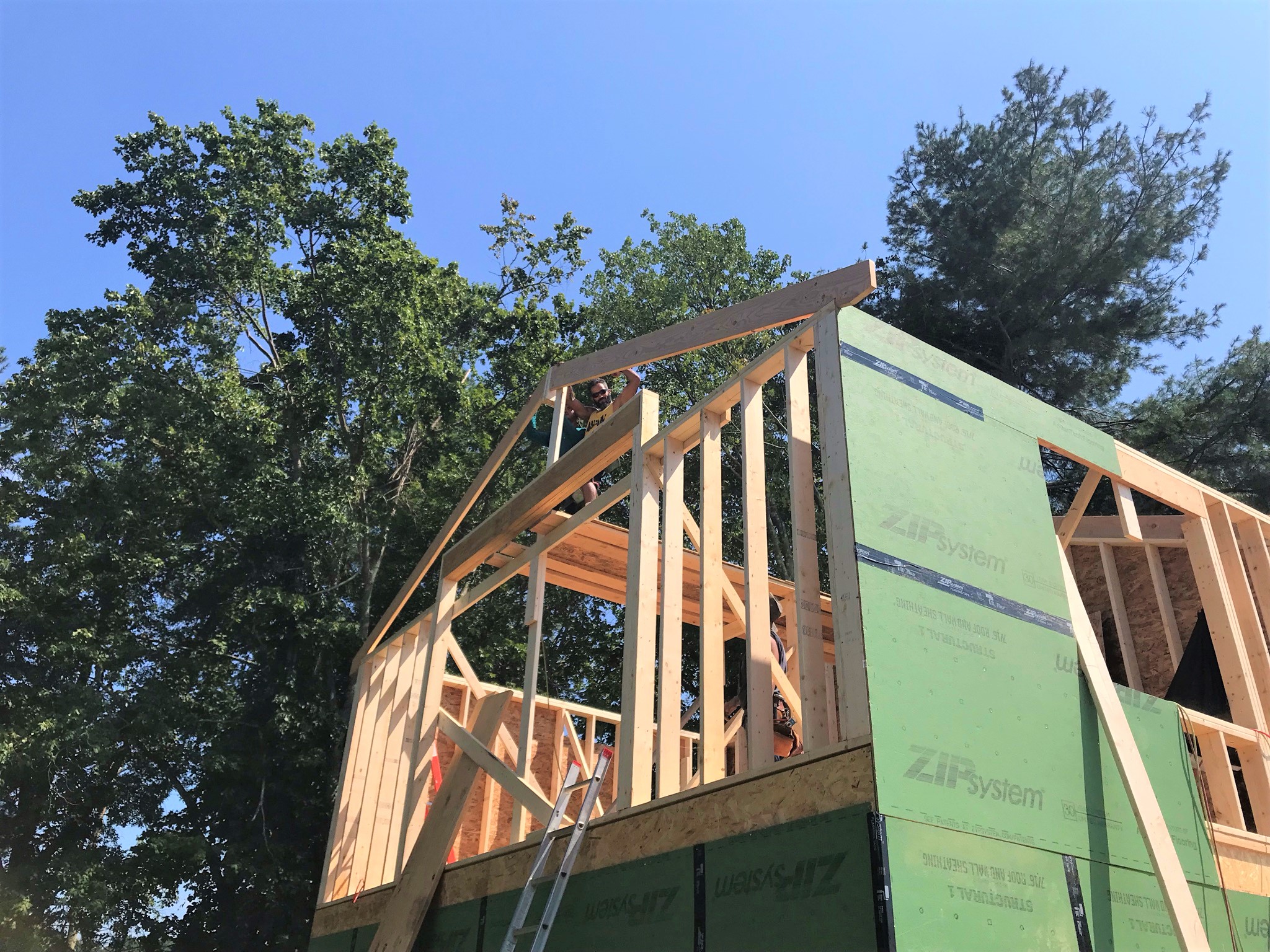 Walls went up quicklyThe two Raphaels mug for the camera after getting up the first LVL beam. On the left is the supervising Raphael.Another view of the beam going up showing the ZIP system sheathing and tape. Soon, three garage walls were framed and sheathed. Here you see Raphael in front, Raphael in the middle, and Enrique in the back.Bracing was set, and then the first of the second-story floor joists was installed on top of the garage walls.More floor joists were to follow.At the end of Tuesday the 24th, this was the hard-won progress. Again, it was HOT.On Wednesday the 25th, work began early on the second floor flooring.We also got a delivery of more lumber…and a porta-potty!Work started on the second floor gables and walls.Raphael handles a sheet of sheathing with ease.