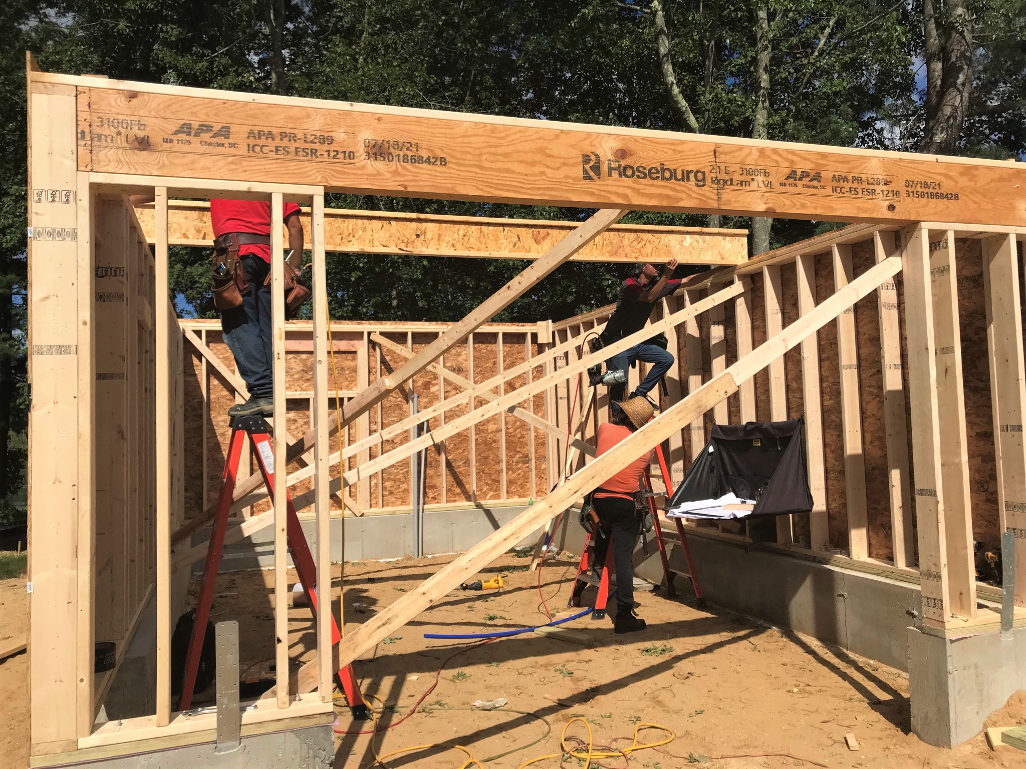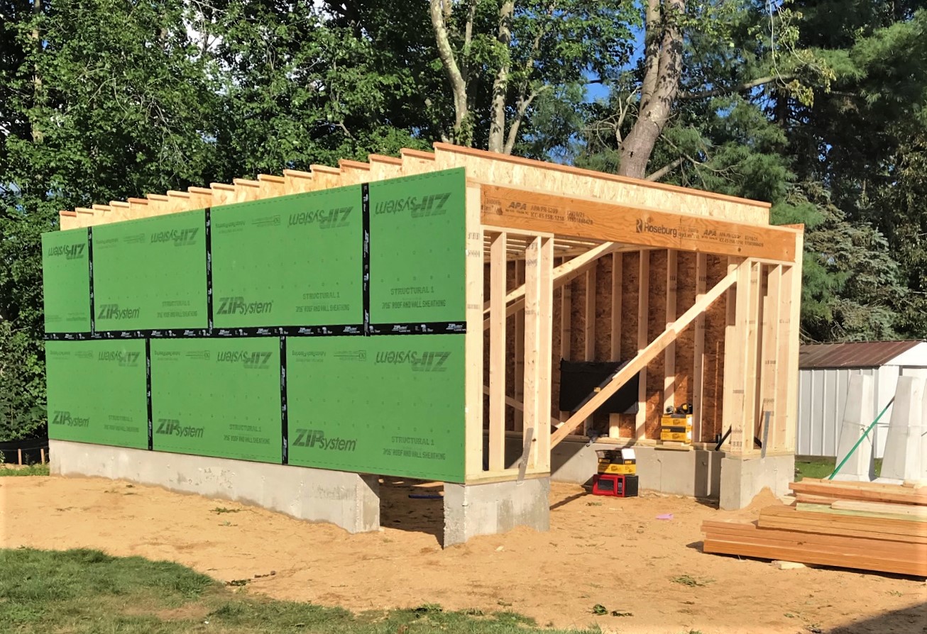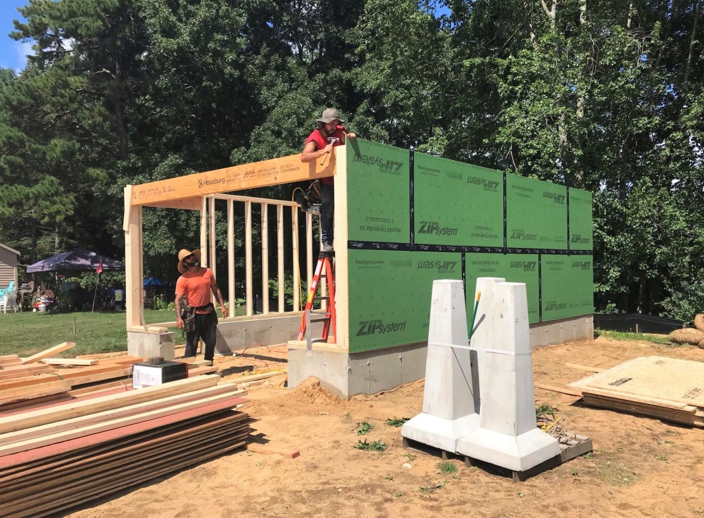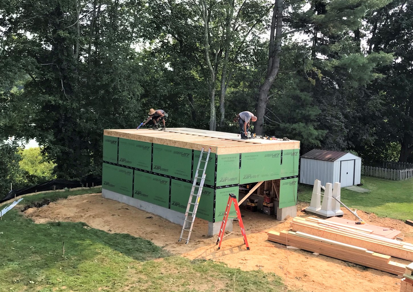 Walls went up quicklyThe two Raphaels mug for the camera after getting up the first LVL beam. On the left is the supervising Raphael.Another view of the beam going up showing the ZIP system sheathing and tape. Soon, three garage walls were framed and sheathed. Here you see Raphael in front, Raphael in the middle, and Enrique in the back.Bracing was set, and then the first of the second-story floor joists was installed on top of the garage walls.More floor joists were to follow.At the end of Tuesday the 24th, this was the hard-won progress. Again, it was HOT.On Wednesday the 25th, work began early on the second floor flooring.We also got a delivery of more lumber…and a porta-potty!Work started on the second floor gables and walls.Raphael handles a sheet of sheathing with ease.