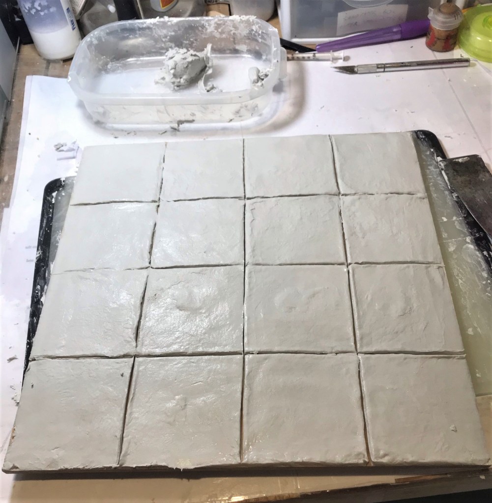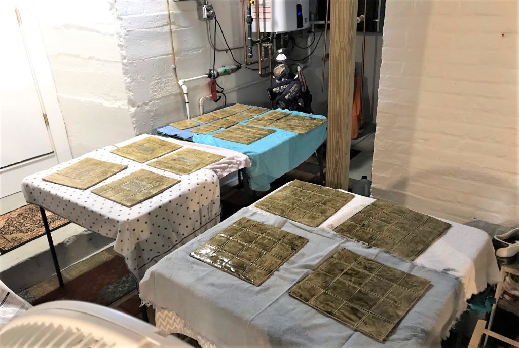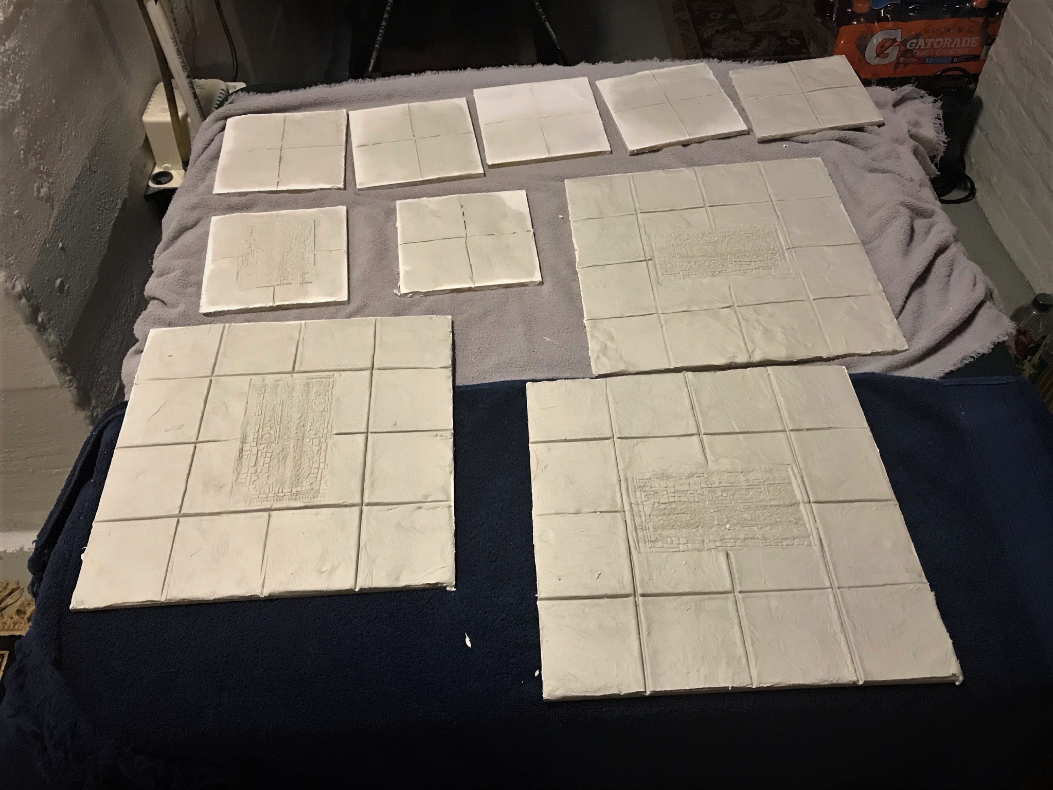 The roller worked fairly well, though there was a learning curve to be sure. I definitely needed to have a tub of water, a brush, and microfiber towels to clean it (and my tools) constantly. The DAS/PVA on the MDF was left to dry over 24 hours. On a few of the larger tiles, I was surprised to see some of the MDF had a bit of warp from the drying clay/glue combo. The smaller pieces had none. Lesson learned. Certainly, finding enough flat surface for all 15 square feet to dry was not easy. I ended up using multiple card tables in the cellar. Yes, the wife was annoyed again. This whole process used up three packs of DAS – that’s 3 kilograms/6.6 pounds – of the stuff.