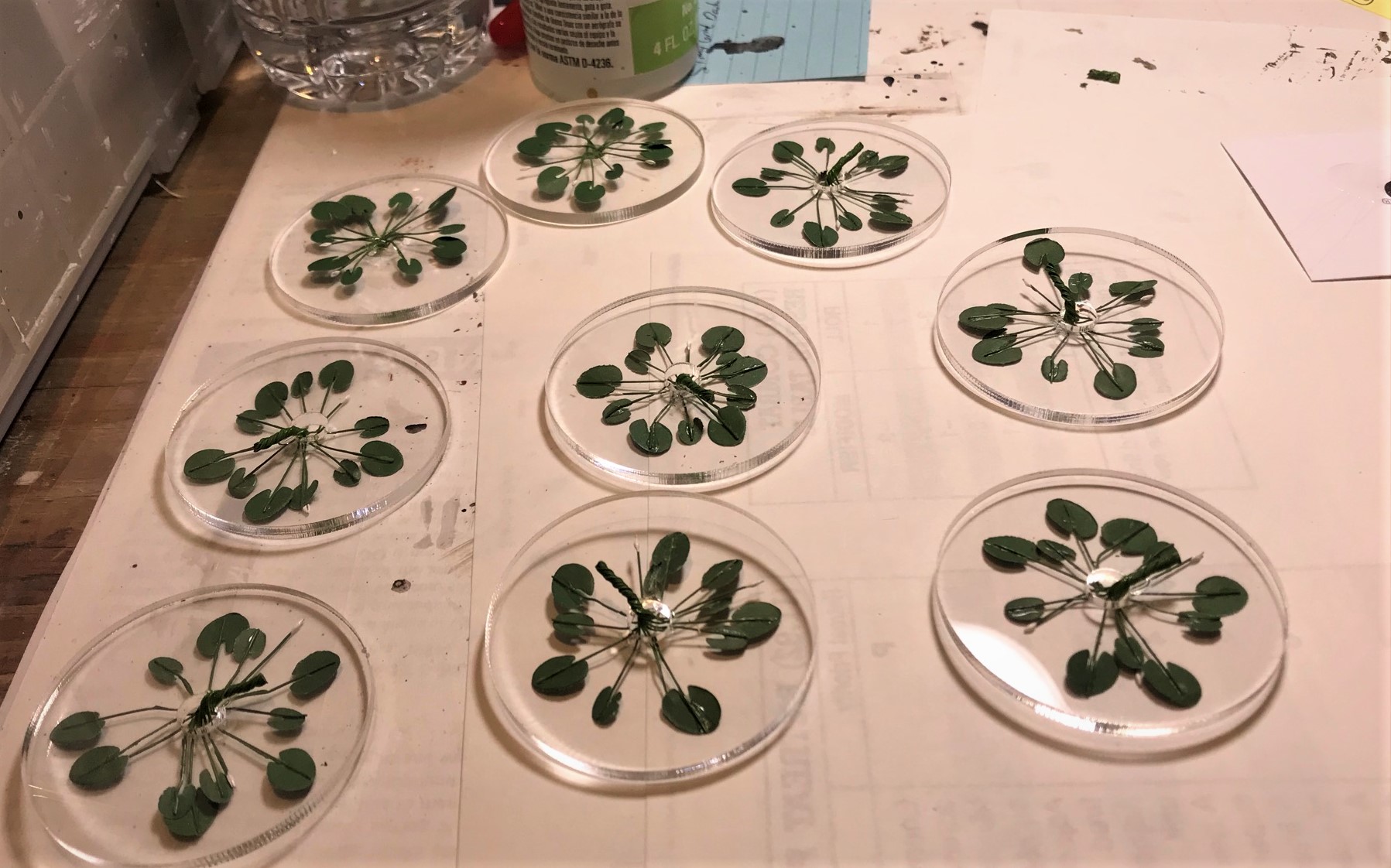 I bought some 2″ clear acrylic bases years ago (2017), and had some in storage. I thought they would work well for the lily pads. They come with removable protective paper over them so that they had no scratches.
