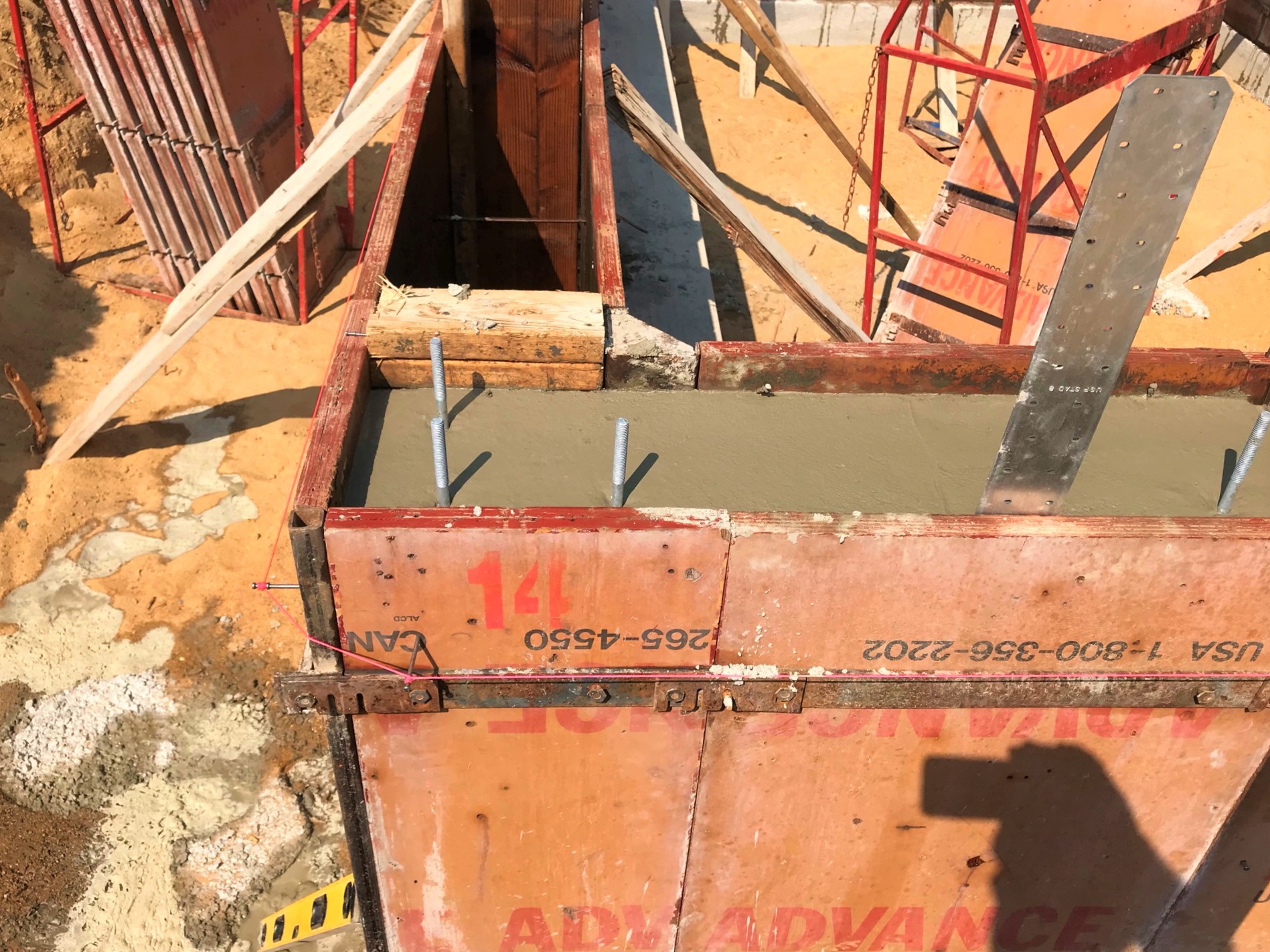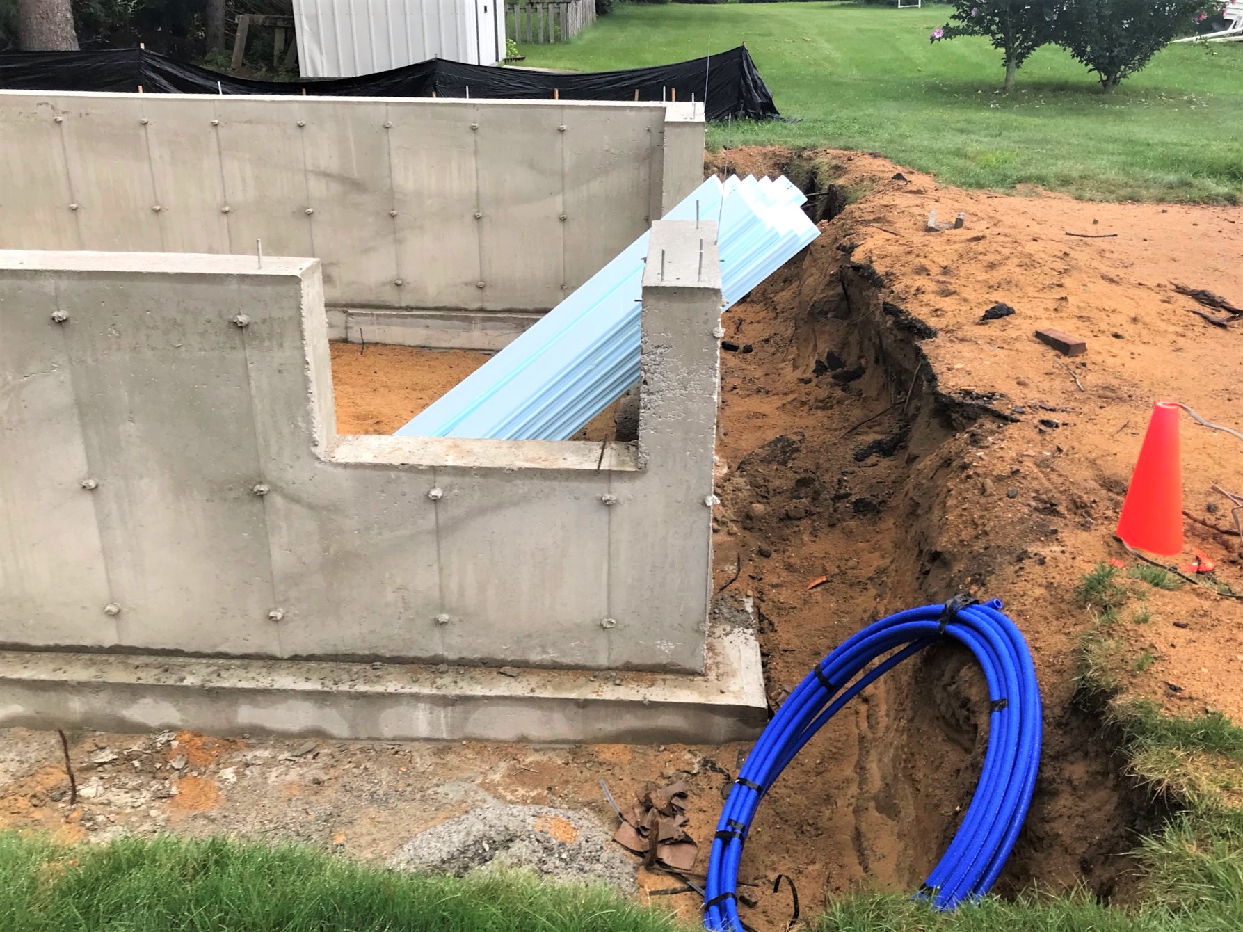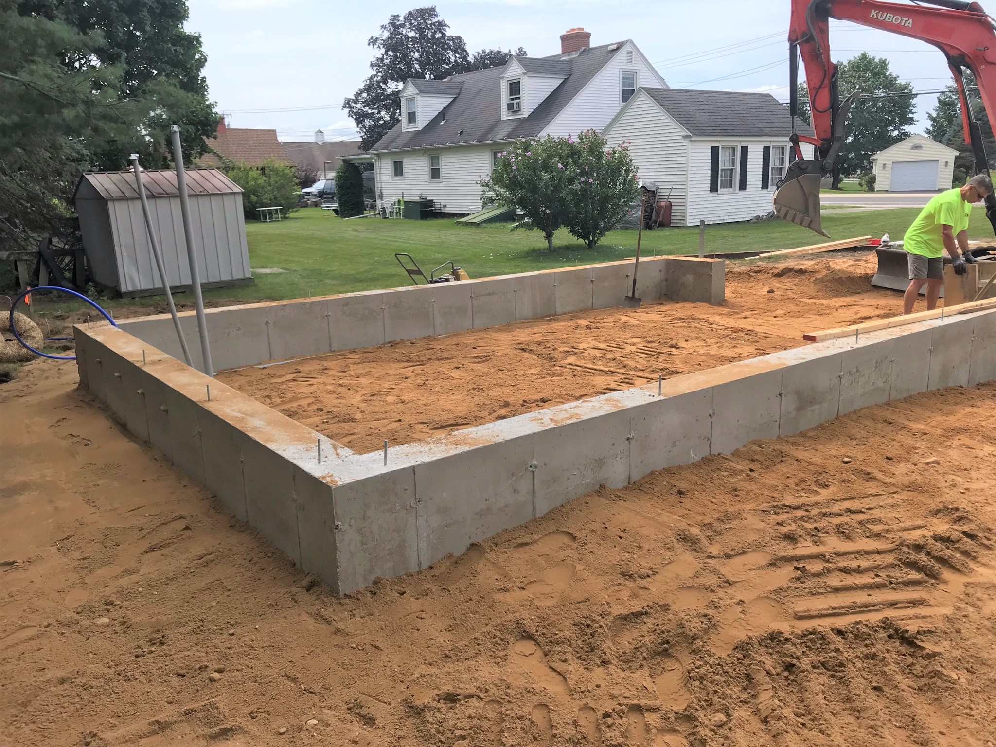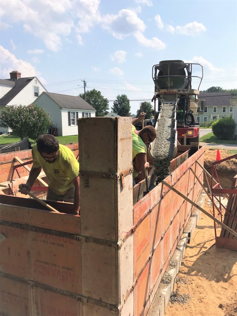 The concrete crew arrived early on Monday, July 26th.They got to work quickly to place forms for the footer.Footer placed – an earthen excavation wall collapsed on the right but that was no problem. Note how sandy our soil is!Footer view from the second floor of our house.By Monday afternoon, the crew stripped the footer forms.On Tuesday, July 27th, the wall forms were delivered and assembled on the footer.Crew assembling the forms.By Tuesday mid-day, two concrete trucks arrived and the placement of the concrete began. One of the two delivery trucks – because of our underground leach fields, the trucks had to deliver with every extension possible to get to the back walls.Extensions in action.Some of the concrete finished work on Tuesday.It was a hot day, but the crew worked hard and fast.Finishing work proceeds on the concrete walls.On Wednesday, July 28th, the forms on the walls were stripped to reveal this!Same view as above but a different angle.On Friday, the foundation was inspected and passed!