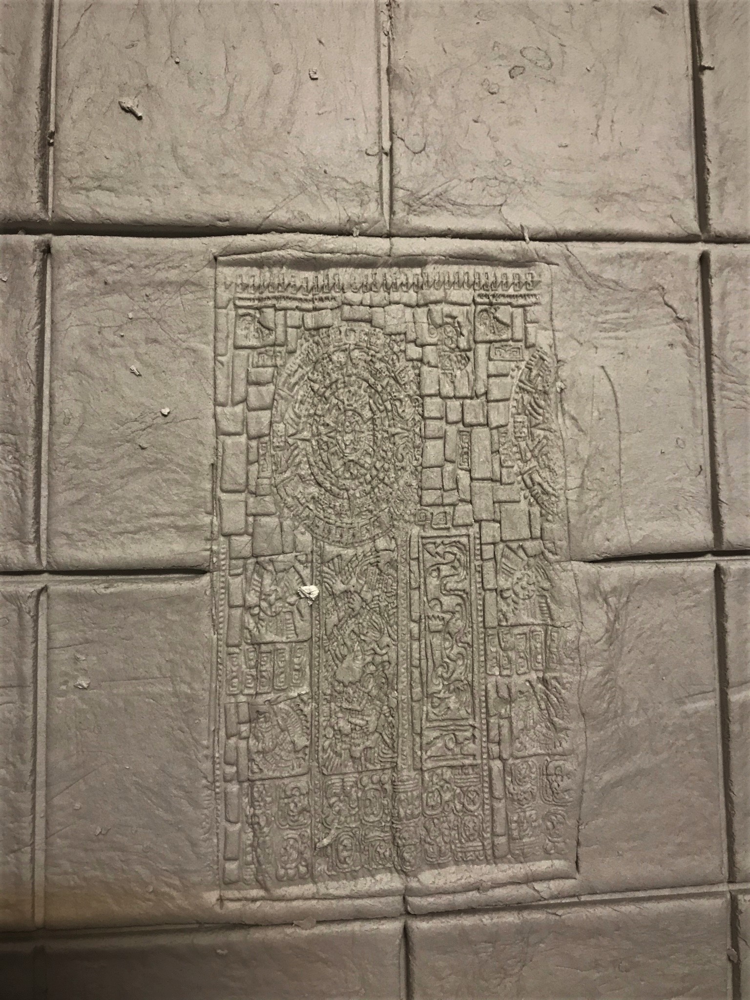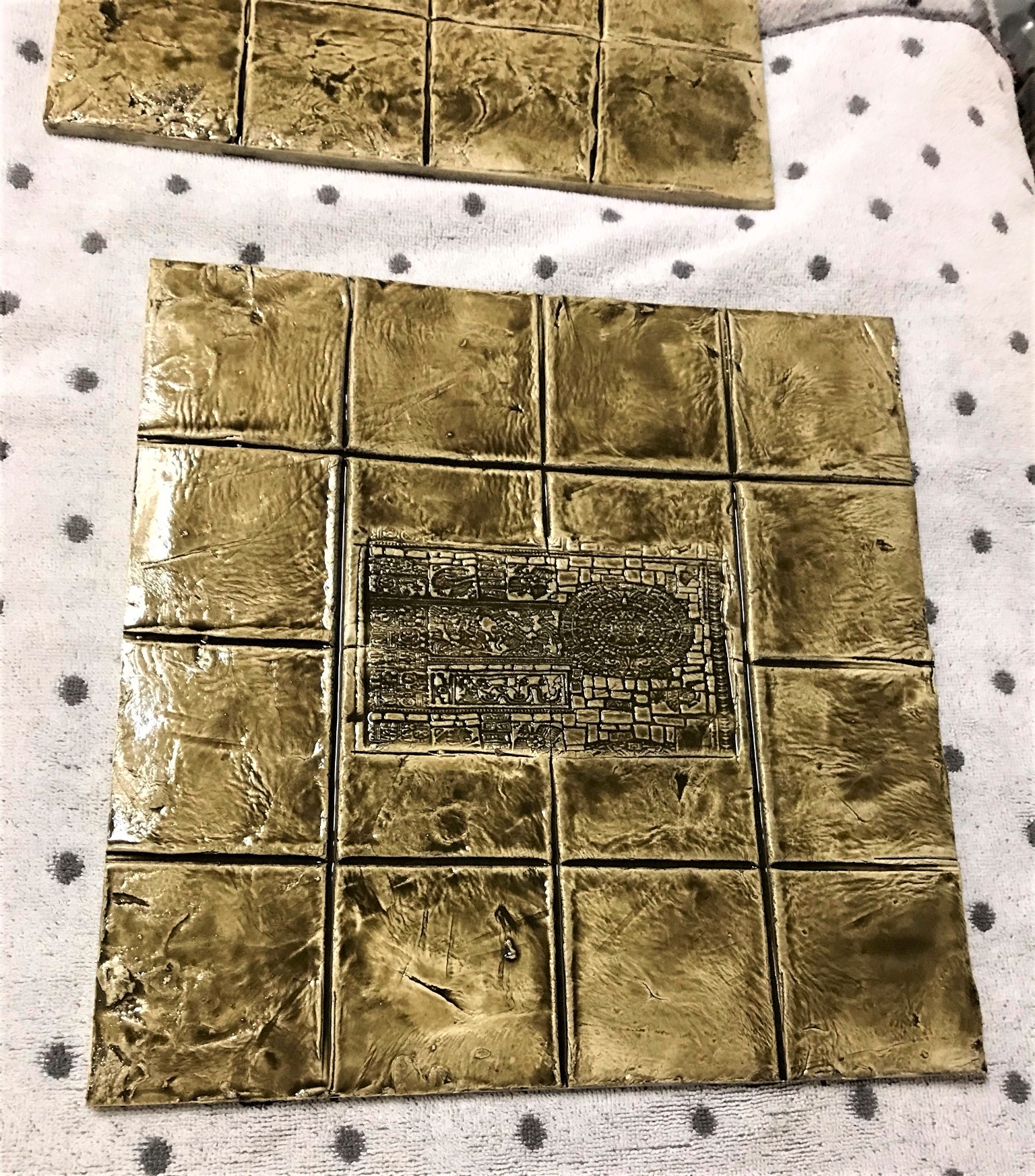 A tile without an imprint.This shows how I sculpted the tile surfaces for the roller. The DAS/PVA mix is on top – and I used a roller and wet fingers to smooth the top. Then I marked off 3″ squares and drew the edge of the carpenter’s square across as a tool. If there was to be an imprint, I placed and traced the template as you see here. Then, I would use the Aztec roller to make the imprint.An example of the rolled imprint. It was not always perfect, but I was able to smooth out the edges as best as I could. I expected to be able to make them work – and in the end they did. This was the worst example – I got better over time. In any case, when I was dry brushing I was able to make all look pretty good (though you can be the final judge).
