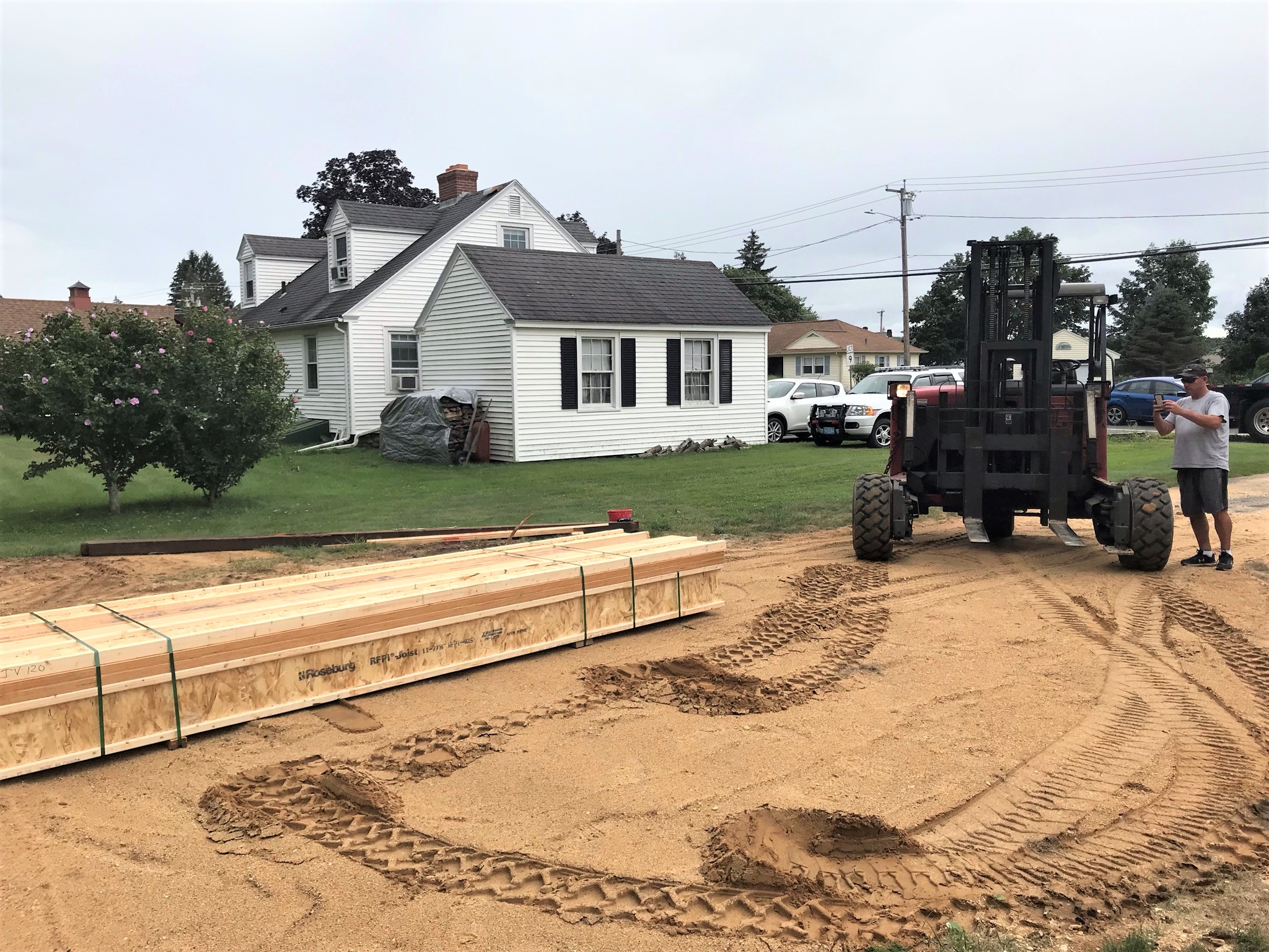Friday saw a delivery of lumber – mostly LVL’s and floor joists.Saturday saw a BIG delivery of even more lumber.Lots of lumber!End of week – here we are progress-wise.