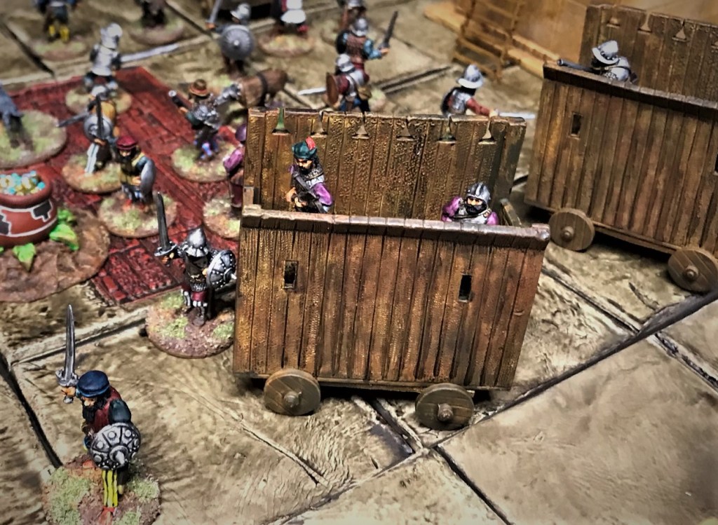 War wagons were wooden carts for deploying missile troops. They had slits in them for crossbowmen and arquebusiers to be able to fire from while having some protection against enemy missile weapons. I think of them as wooden APC’s (WPC’s maybe?). Hernan Cortes used them as he was besieged in Tenochtitlan in 1520 – yes – over 500 years ago now.