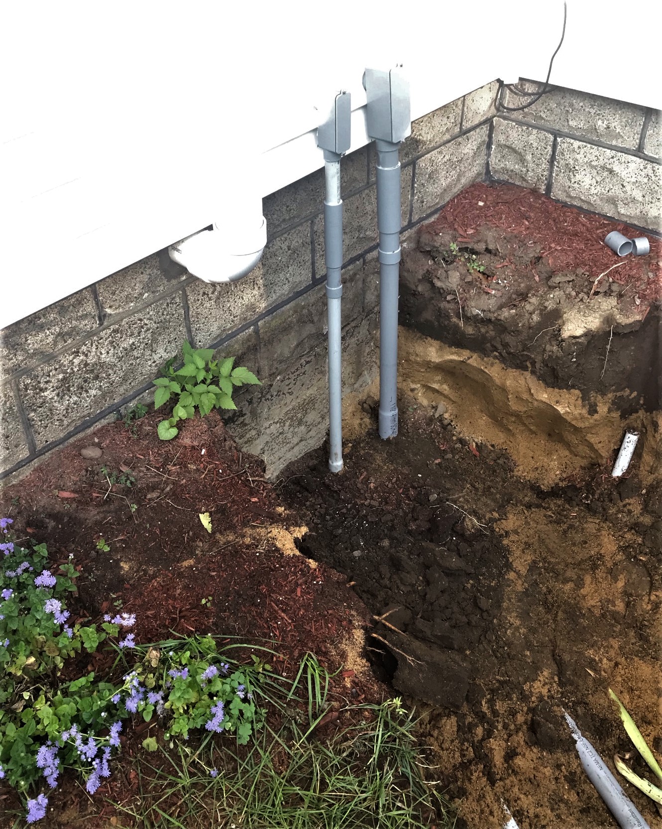 Here the water line trench is started (separate and distant from the other electrical/coax conduit trench for obvious reasons).Electricians work on the conduits in the foundation. My wife Lynn is inspecting above!Long view of the trenches – looking very WWI in the back yard…At the end of Wednesday, August 11th, the water line was in and its trench was backfilled. The electrical and coax cable conduits were inside the foundation and ready for backfill there too.