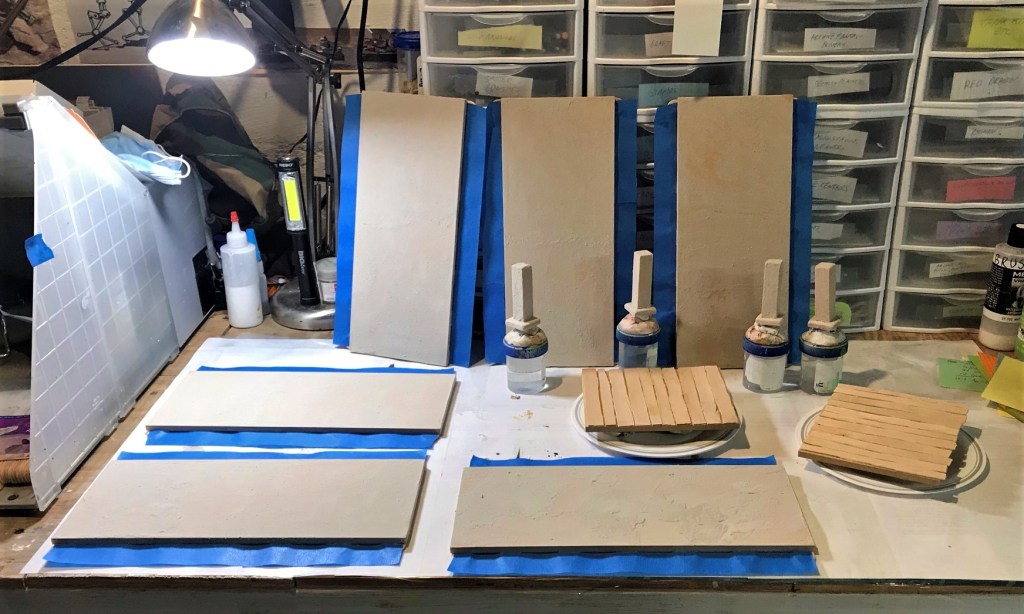 After the MDF was all cut, I laid out the pieces that I had on my FLG swamp mat, and arranged my buildings. Later, I would get a water mat from them, as I thought the swamp would not work as well. After the MDF concept layout, I was on to the building of the six causeways. I usually went through the process of doing one phase of work on one piece (like a prototype), and if that worked, moving on to the rest in similar phases.