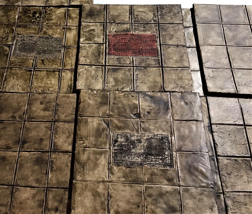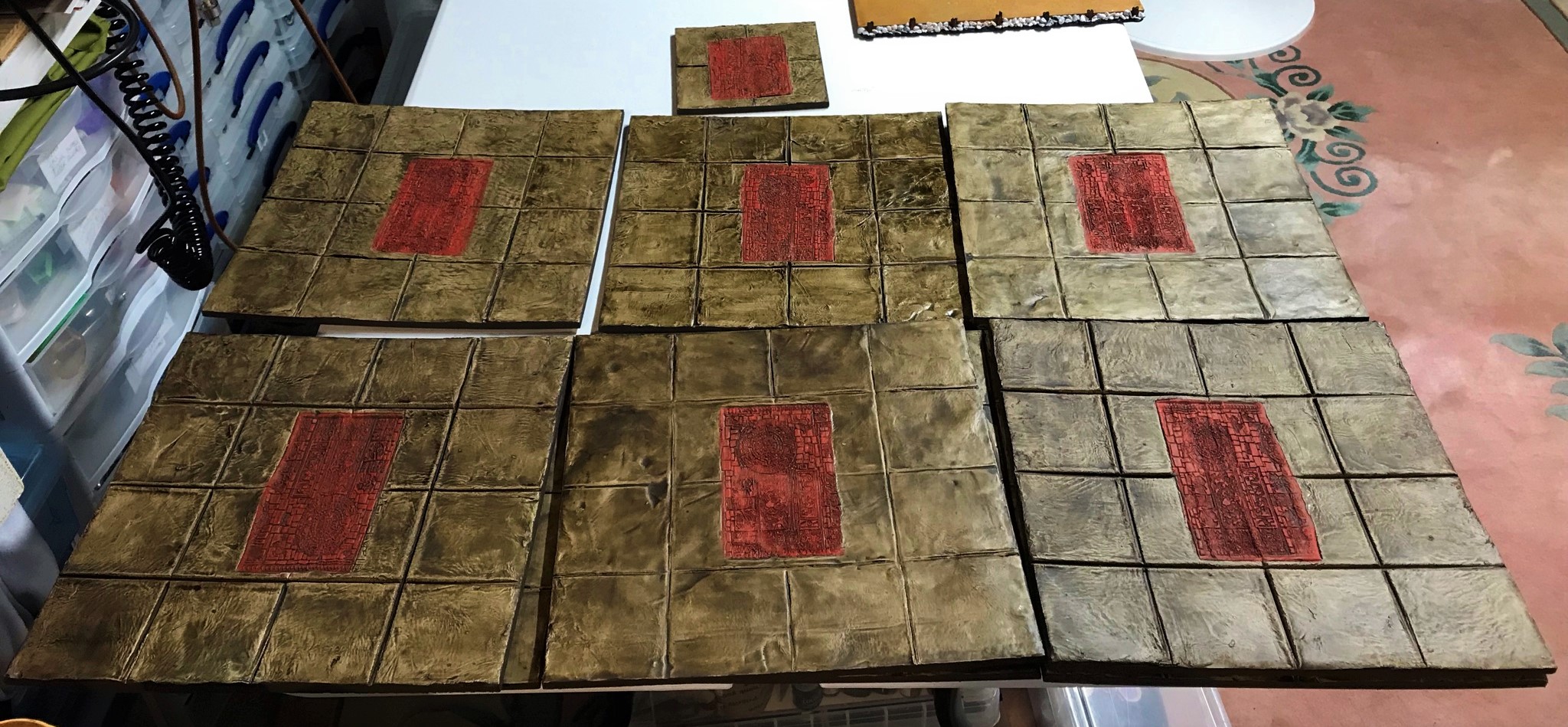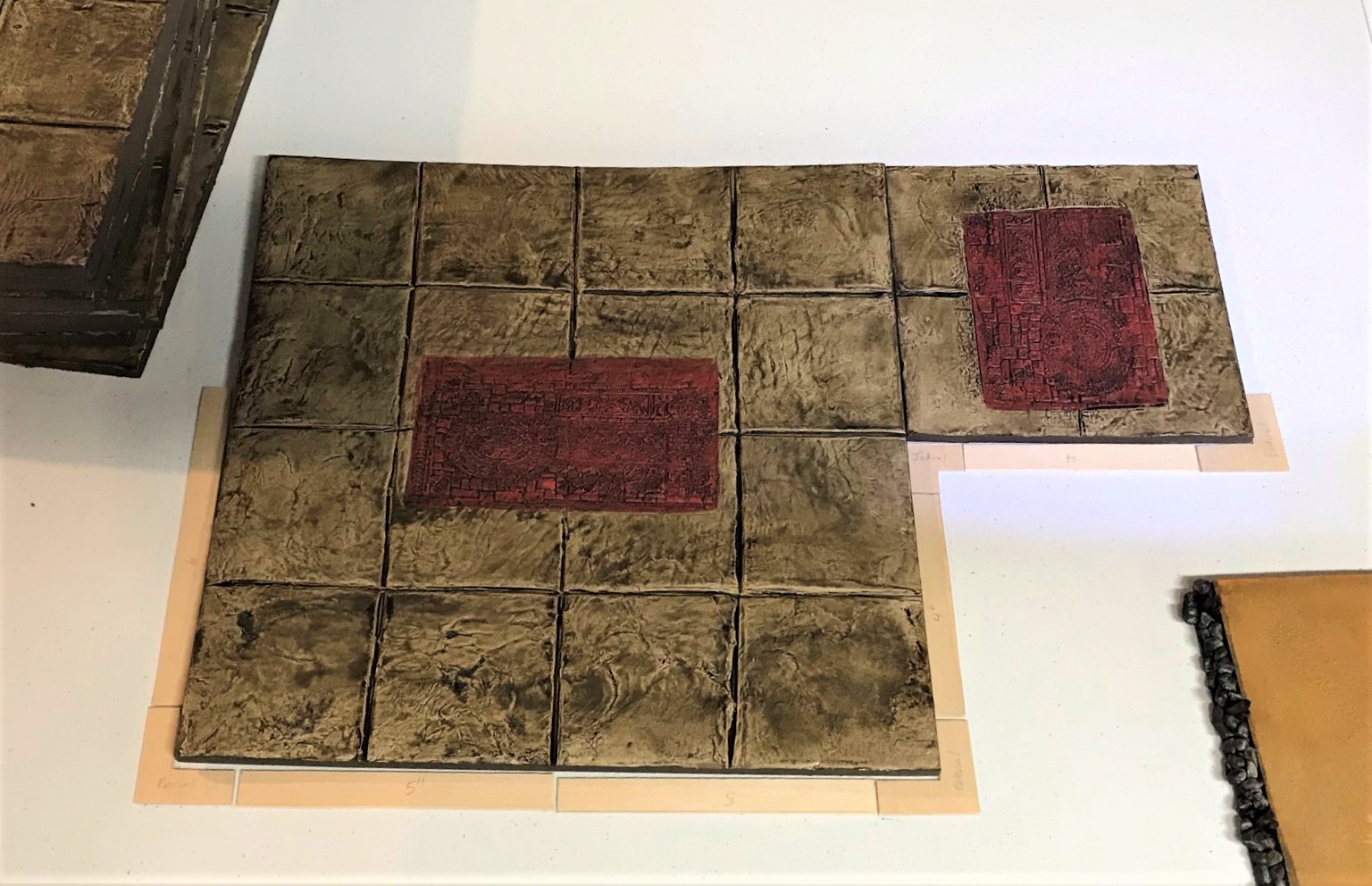 I then brush varnished and shaded all of the tiles. At this time I moved on to dry brushing the imprints with Citadel “Astorath Red”. I also darkened the edges with DecoArt “Raw Umber”. The tiles line up together on the lines nicely. Though some warp is visible, it is not horrible. I also went over all of the tiles and shaded them as needed so that the colors were similar and no untouched DAS/PVA was visible.
