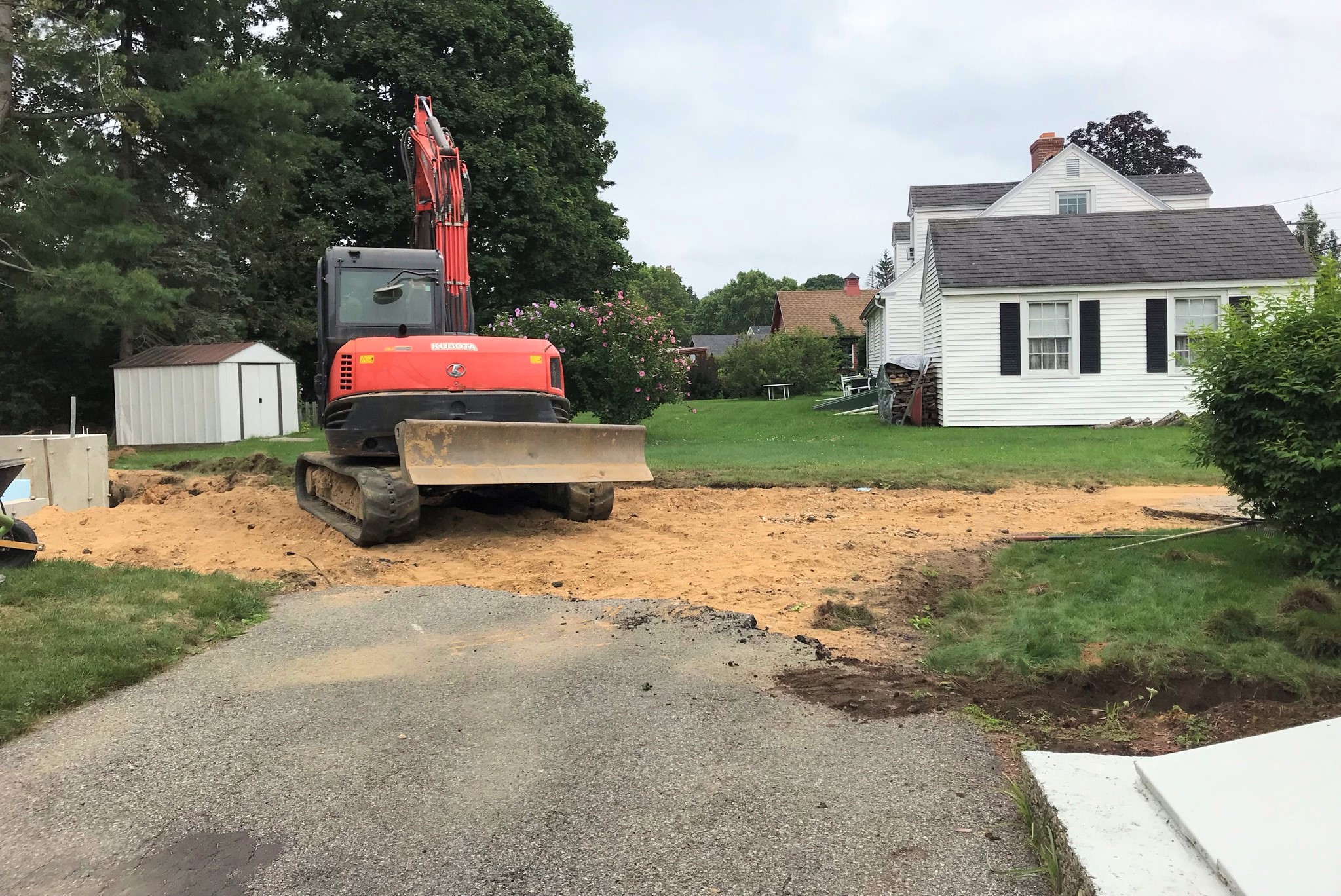 This is Tuesday, August 11th. Andy is digging the electrical/cox cable trench. More of the old driveway was removed and some cracked as you see here to the left of the open cellar bulkhead. It will all be repaved anyways.