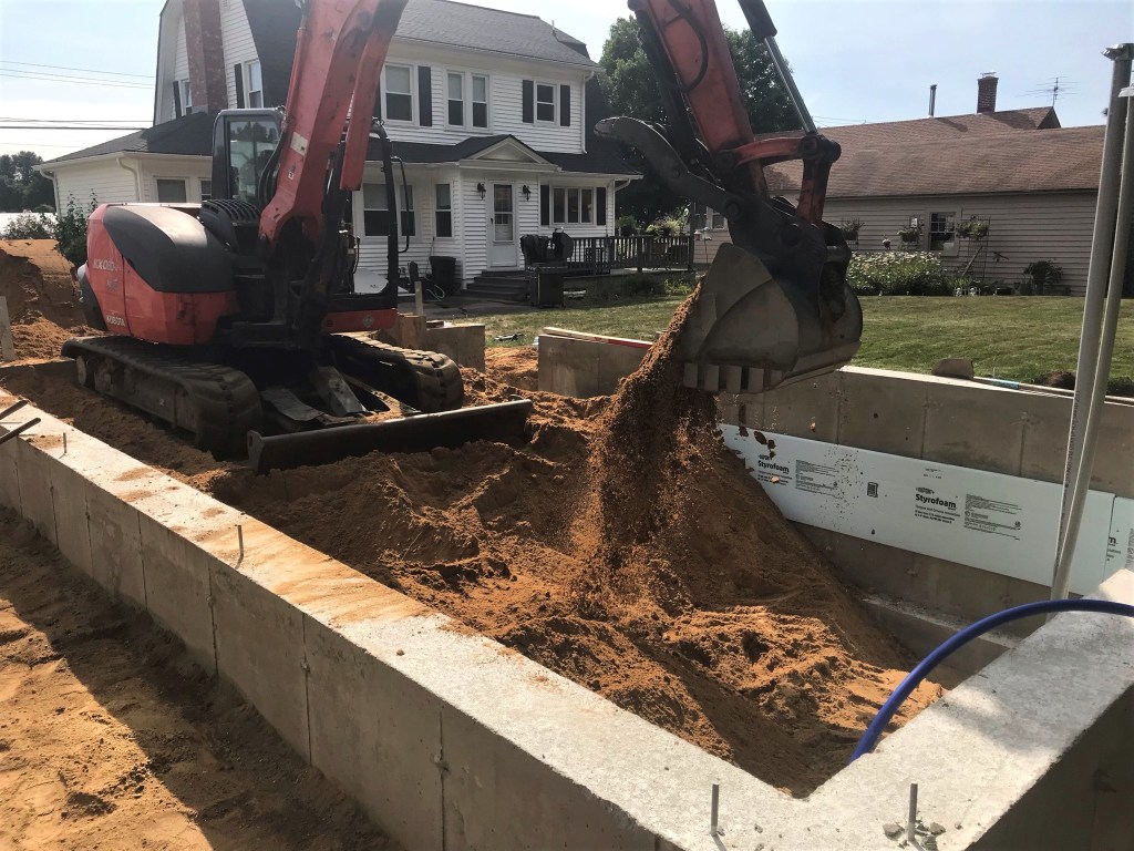 On Monday, serious work began on moving dirt. More of the old driveway was removed, as was some overburden. Unfortunately, on the previous week, one of the less-experienced excavator operators hit the new foundation and chipped off a piece.