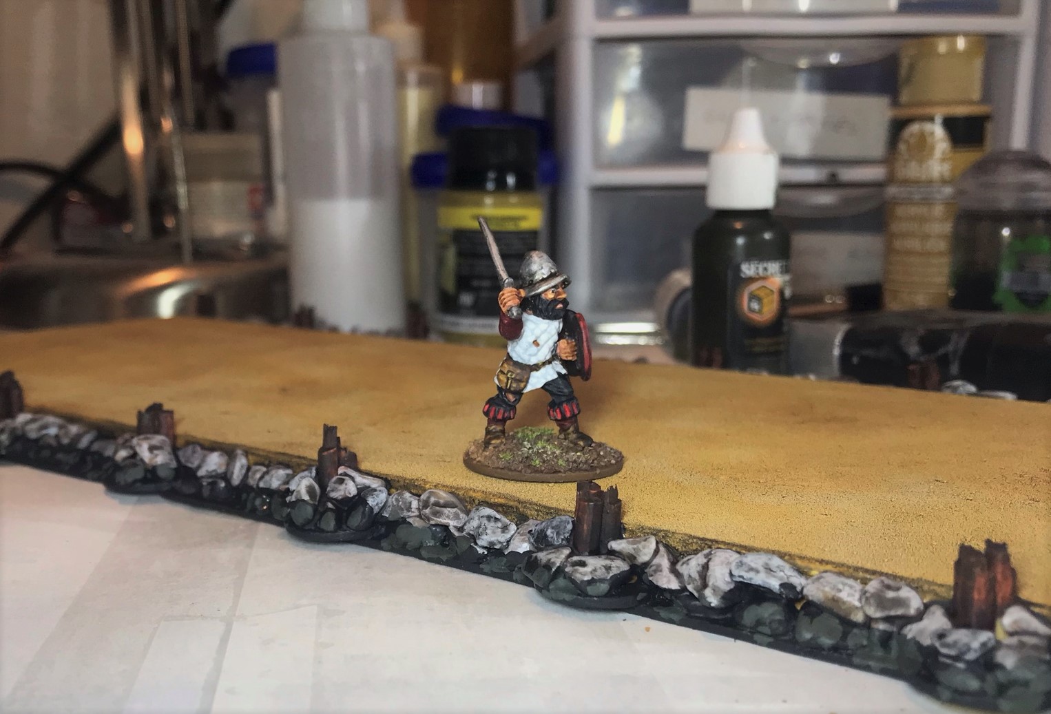 Detail of the pier and rocks gluing. I cut the pier wood pieces irregularly as possible to add realism.The first side of a causeway glued up with piers and rocks and a 28mm Conquistador for comparison. The PVA would dry and “suck” up nicely into the crevices.