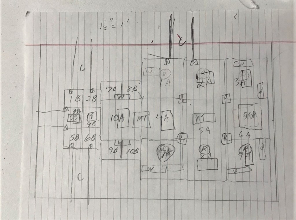 I started out with historical research into several sources, and thinking about what I wanted and what I could do. After I had my initial concept, I then refined it into the two plans that I put on paper below.