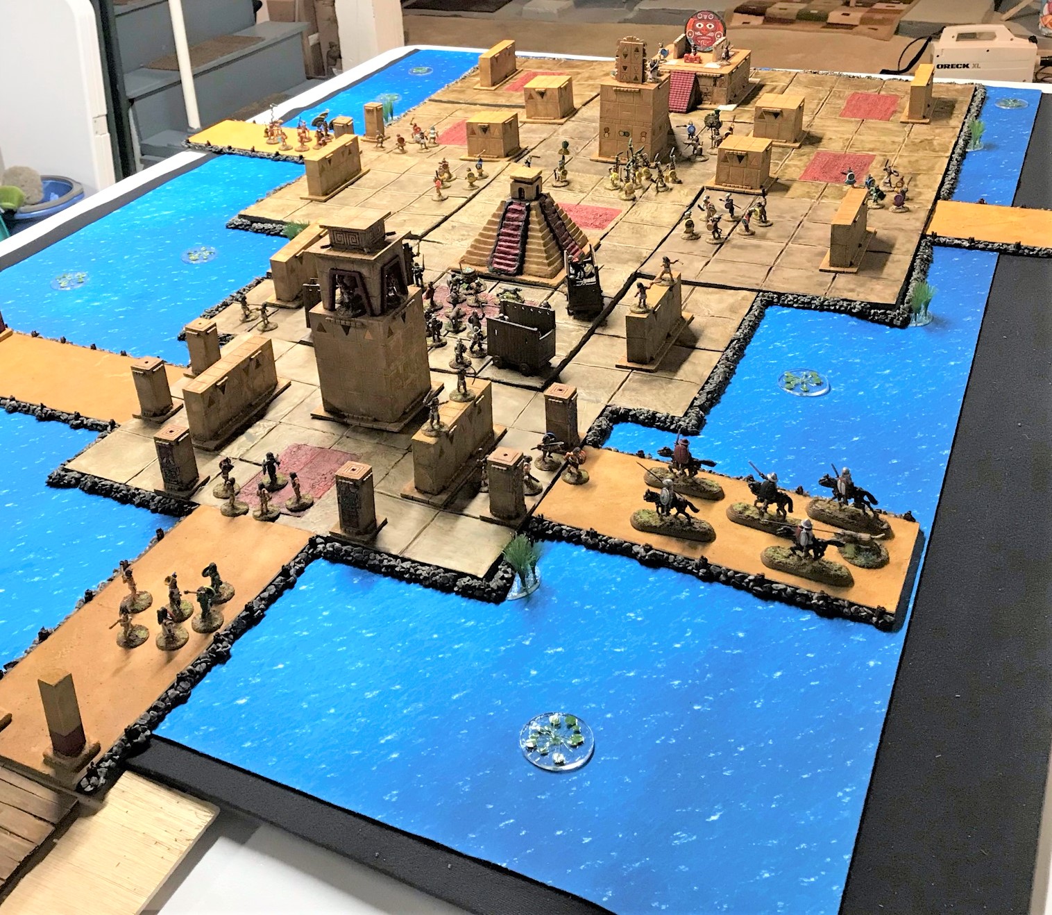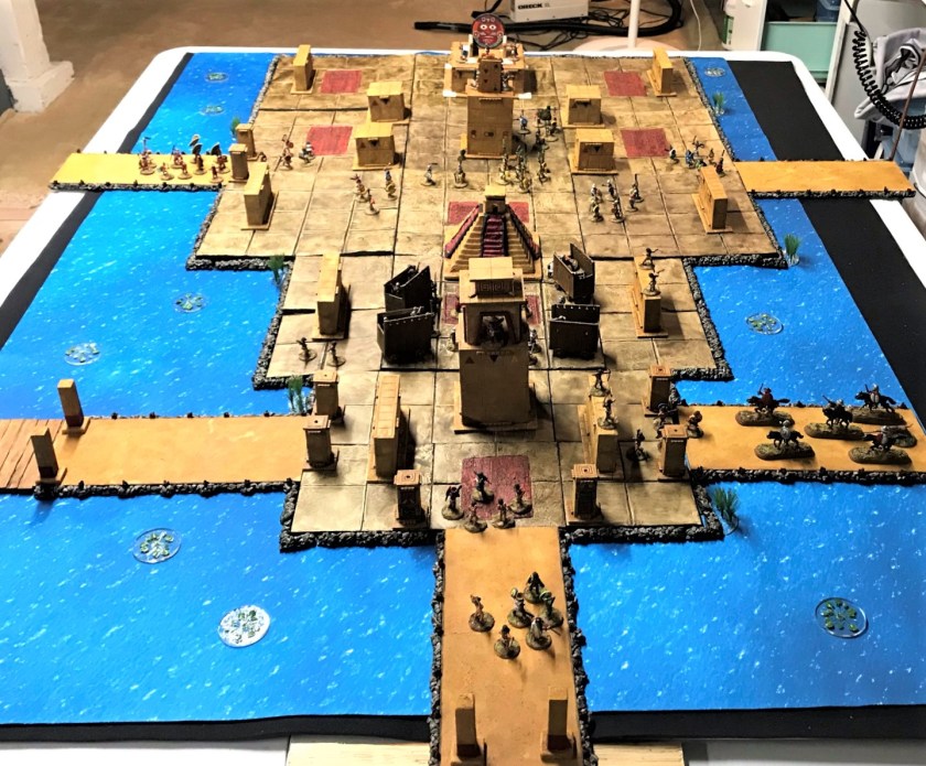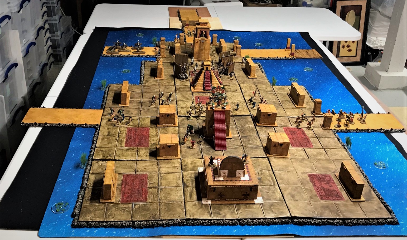 I have been working through July to build a representative 6′ x 4′ cityscape gaming table that would evoke the flavor of the city of Tenochtitlan, which was the capital of the Aztec Empire. On the arrival of Hernan Cortes in 1519, Tenochtitlan was populated by an estimated 200,000 to 400,000 people – making it even larger than contemporary London. It was built on an island in Lake Texcoco, and was linked to the mainland by multiple causeways. These causeways also had removable or liftable bridge sections. In effect, Lake Texcoco formed a “moat” around the city, making it impregnable to enemies for hundreds of years (until the Spanish Conquest occurred anyways). The causeways would be of major importance during all phases of the Spanish Conquest. Cortes met Montezuma II on a causeway for the first time. The Spanish and their Tlaxcalan allies would fight desperately at different times to both escape Tenochtitlan (La Noche Triste) and to return to conquer it afterwards. The nature and importance of the causeways were major aspects of these battles, so any representation of the city of Tenochtitlan needed to have causeways.