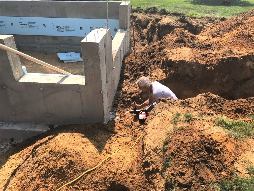 At this point, it became a waiting game for the wiring inspector, as both the conduits in the remaining trench, and in the foundation, needed to be inspected before being backfilled. We lost time as he did not come until Friday morning. As Andy was not sure as to when he would come, he had moved his excavator to another job site. This would delay the backfilling. Also, the wiring inspector wanted thicker conduit installed where it attached to the house (schedule 80 versus schedule 40), in case it was struck buy something. He also wanted more sealing where it went through the siding. Therefore the electricians had another task for the following week’s work.