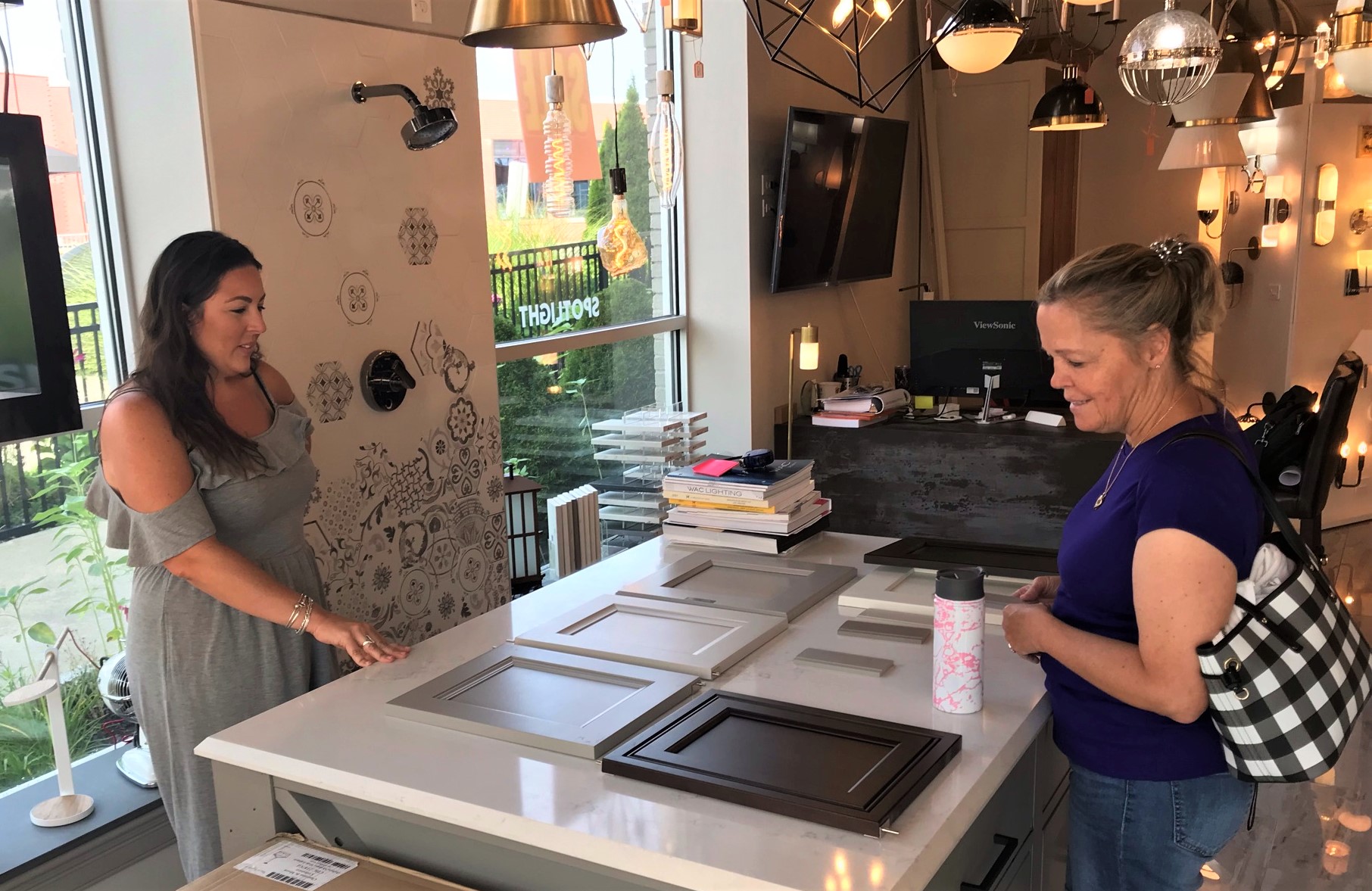 Spotlight Design Center in Worcester.Lynn and Leanne discuss cabinetry choices. I am letting those choices be all Lynn’s!