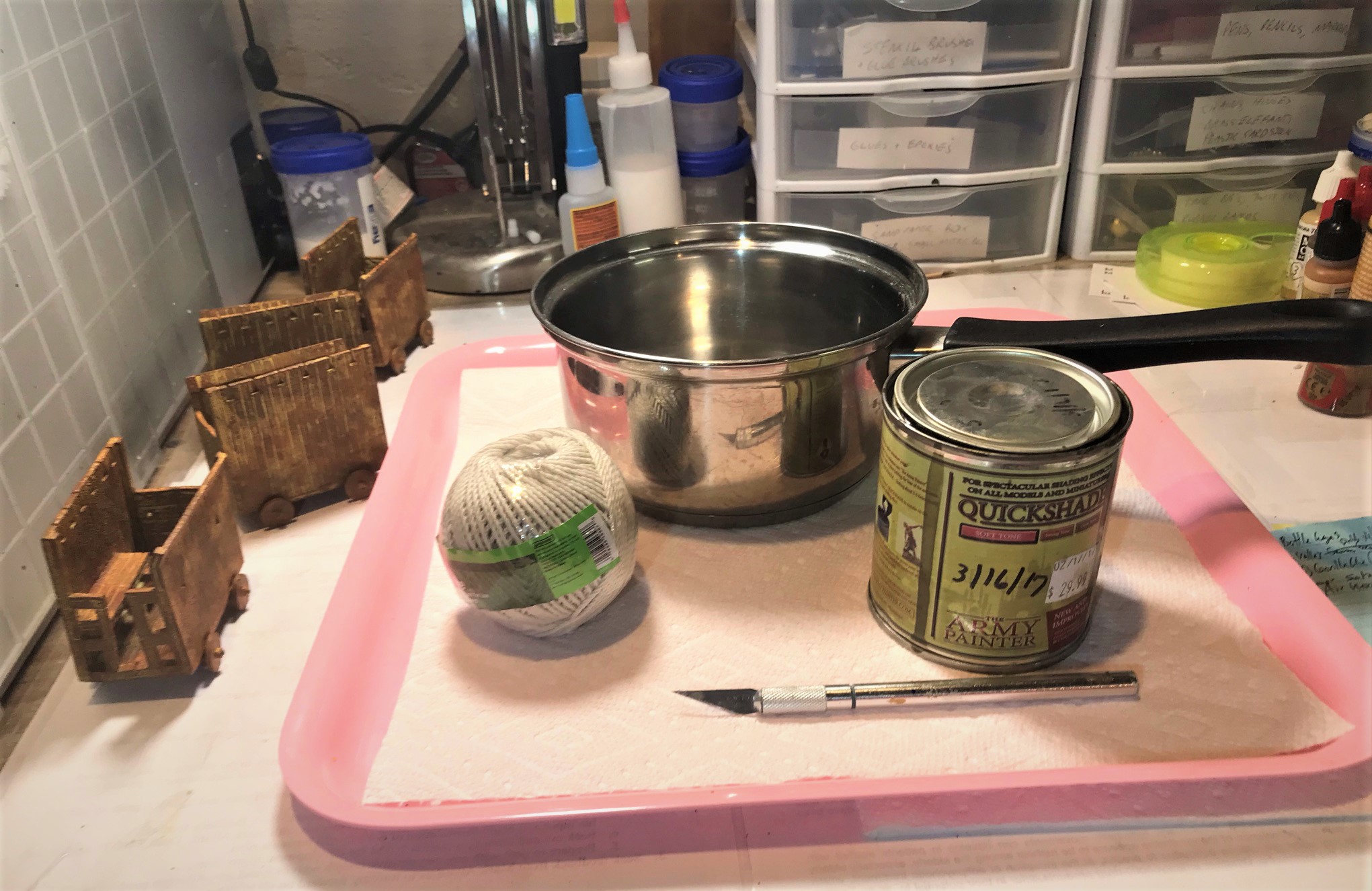 I then used various browns (I list all my paints and more at the end of this post). to approximate a used wood tone. After all, these war wagons were made from old recycled lumber. At this point in the project, I still wondered how I was going to get paint etc. under the benches, as well as how I was going to varnish them. As you may imagine, these are heavy! I decided that they needed a “dip” – in some Army Painter dip. To retrieve them without a huge mess, I used a pot I bought from a Salvation Army Thrift store, some twine from the hardware store, and an old piece of balsa.