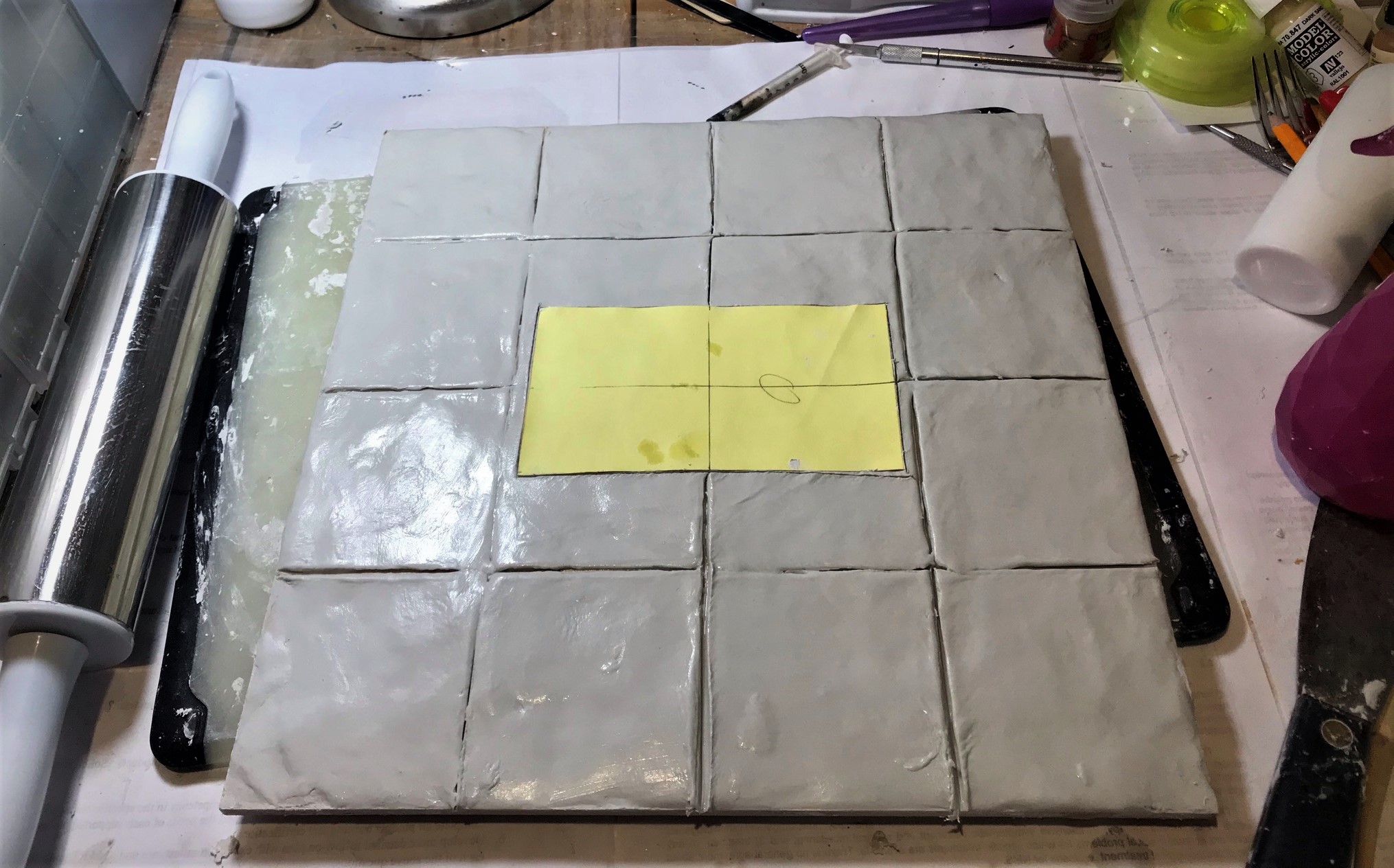 The next step was to figure out the marking/sculpting plan for each pavement. I decided that having 3″ x 3″ squares would work well with both the larger and smaller MDF tiles. I needed to have a properly-sized template for the Aztec roller such that I could center it on the sculpted tiles. I planned to do 6 large tiles with the roller imprint, 4 without, and 9 small tiles without the roller imprint, and one with it. The roller imprint would be approximately 3″ x 5.5″.