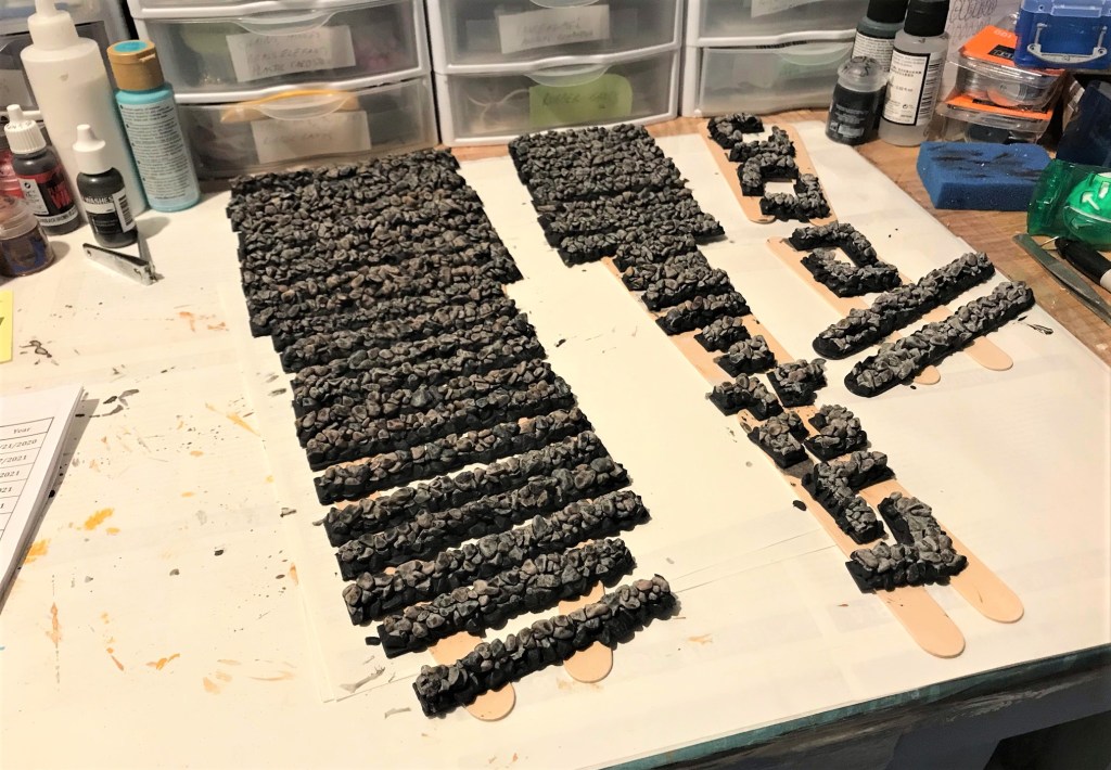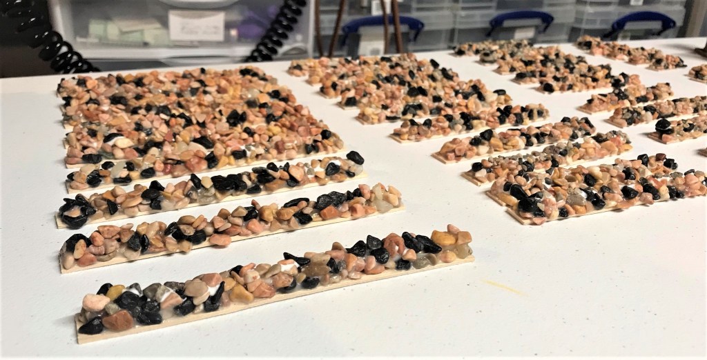 Once the bass wood pieces were all cut, the gluing began, similar to the process I used on the causeways. Each pebble had to be glued one at a time in 2-3 courses of different sizes – while letting each course dry before moving on to the next one. In terms of pebbles, I estimate that for the 184 linear inches that I put about 10-15 pebbles per inch. That means for the revetments alone I glued an estimated 1,840 – 2,760 pebbles/rocks!! Add in the six two-sided foot-long causeways, and that makes an estimated 4,720 – 7,080 pebbles that I glued down. Ok, now I know why these took so long!