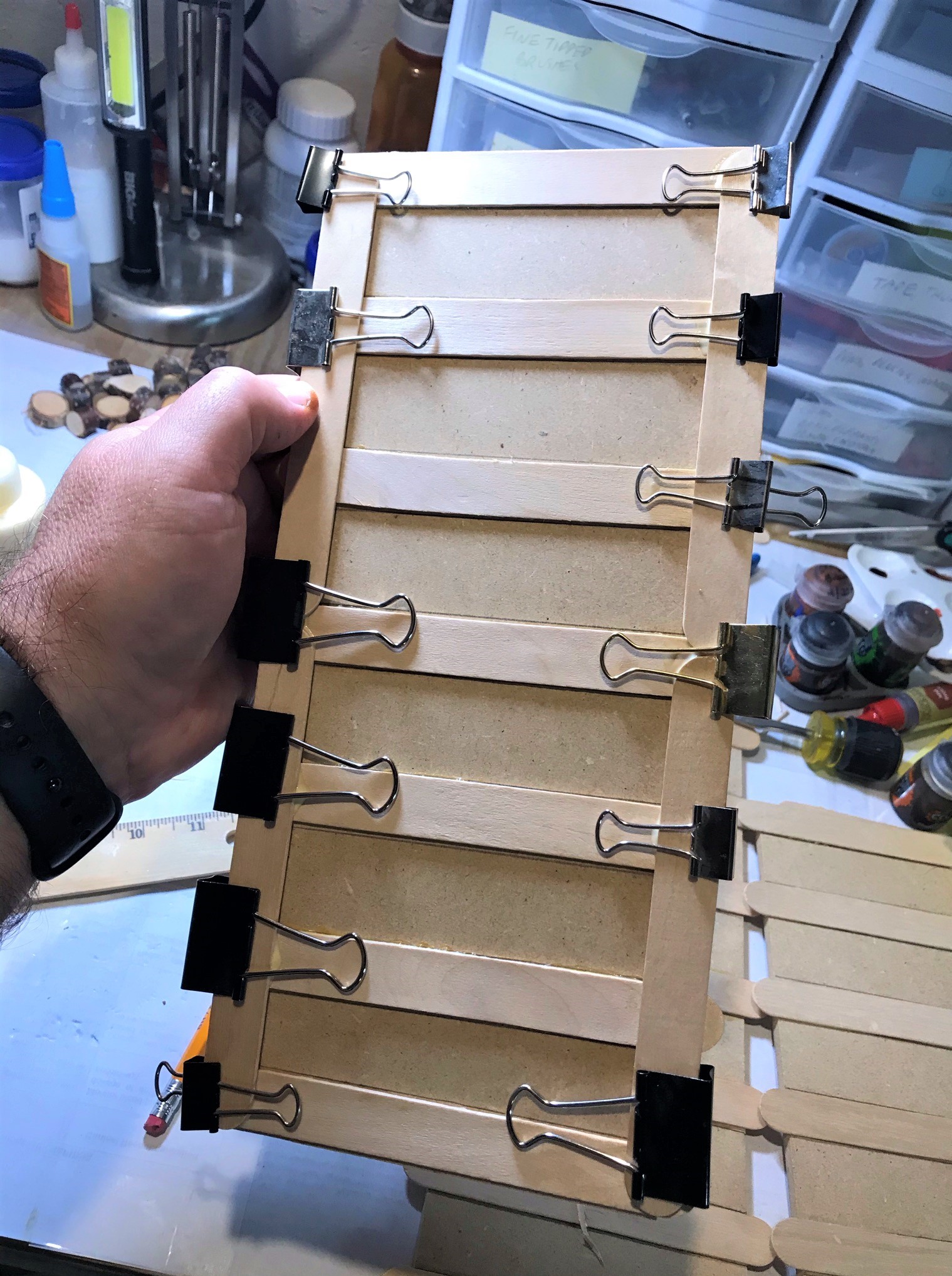Here you see four of the six causeways after the first gluing – and before adding more on the sides for the rocky revetments.Here are the longitudinally-added craft sticks set with binder clips for overnight drying.