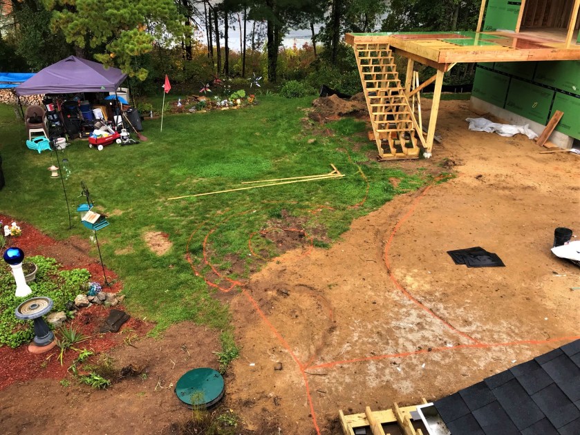 It’s a bit difficult to see, but the spray-painted orange lines designate the plan for paving stones. These patio stones will go under the garage deck and stairs, then connect to the house deck. The gas fireplace will be the round circle here.