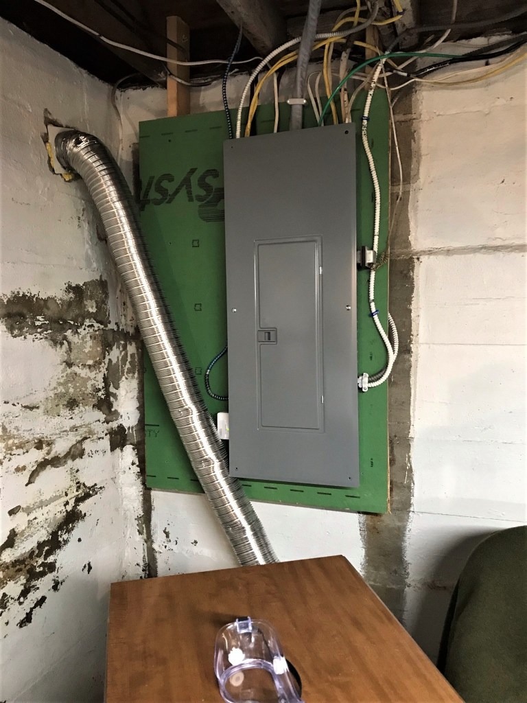 Back in the cellar, the old distribution box mounting monstrosity was removed and a new sheet of plywood and some lumber from the garage build was used to build a suitable mount. The new configuration is bigger and we will need to move the dryer to the wall to the left of the distribution box so that the vent hose is not right next to it. But, as we were using the old the shelves I never got around to paint it as you can see – and it looked like hell.