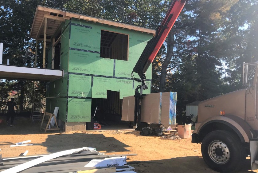 Boom truck delivery of blue board upstairs. Some went below as well.
