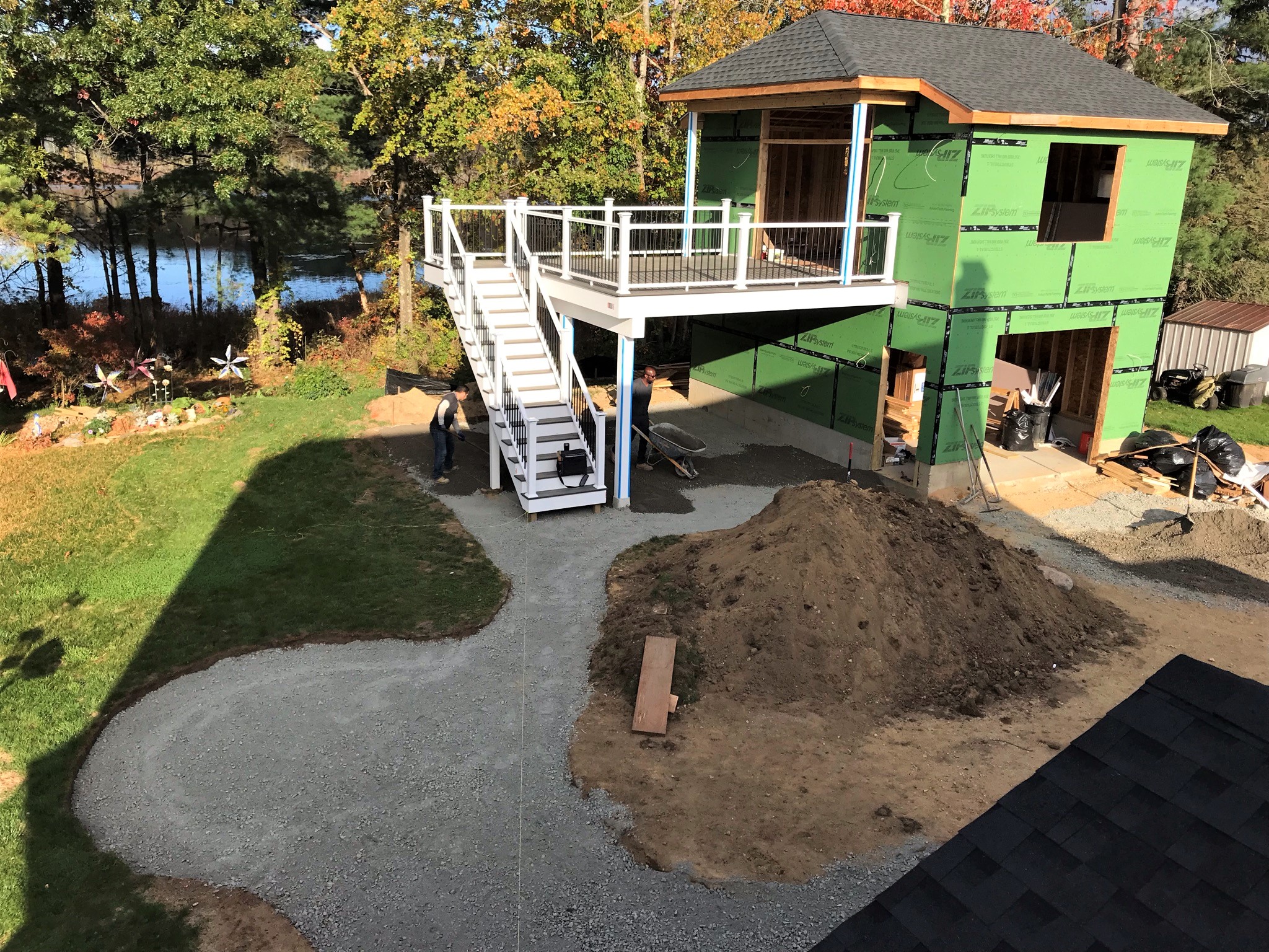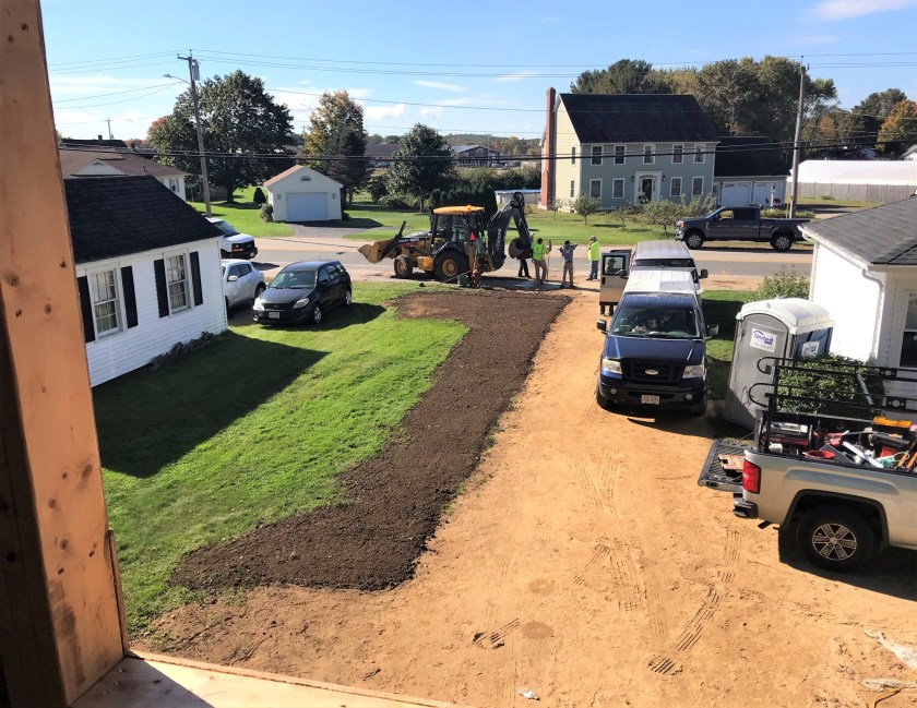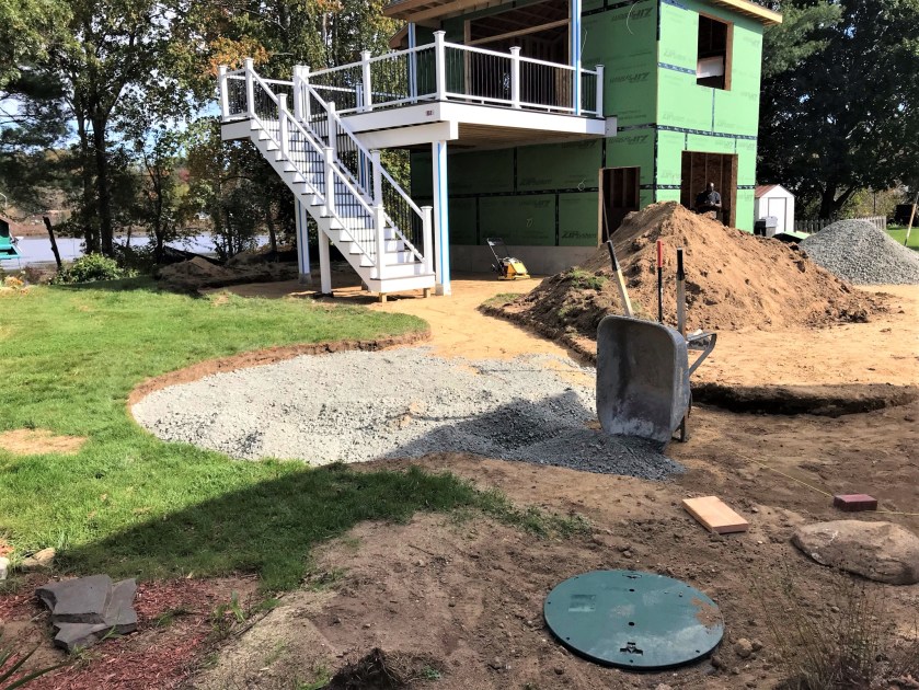 On Wednesday, it rained. Thursday things picked up again. Subbase compaction began – some by hand and some by machine depending on the leach field presence underneath. Then crushed stone started being brought in and spread.