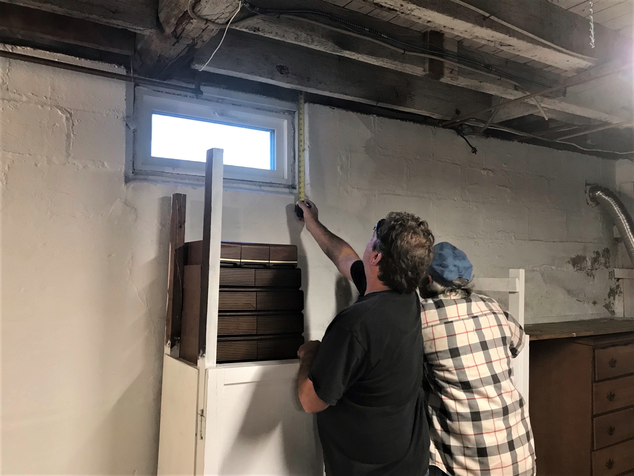Here you see he old distribution box mounted on whatever lumber the previous homeowner had available – back in the 50’s? 60’s? – to include a piece of trim! We had a series of shelves built by the previous owner long ago (probably 40+ years) along this wall. We had put an old bureau (left over from my childhood actually) under the shelf planking that was attached to the monstrosity that the distribution box was mounted on. The dryer vent snakes up to the wall as you see.Here you see the electricians (Mike and Paul) trying to determine the sill height to drill for the power cable by using the window as a reference for outside. The actual hole would be far to the left. The other end of the old shelving/cabinet that I referred to above is seen here on the wall under the cassette cases (future yard sale items).