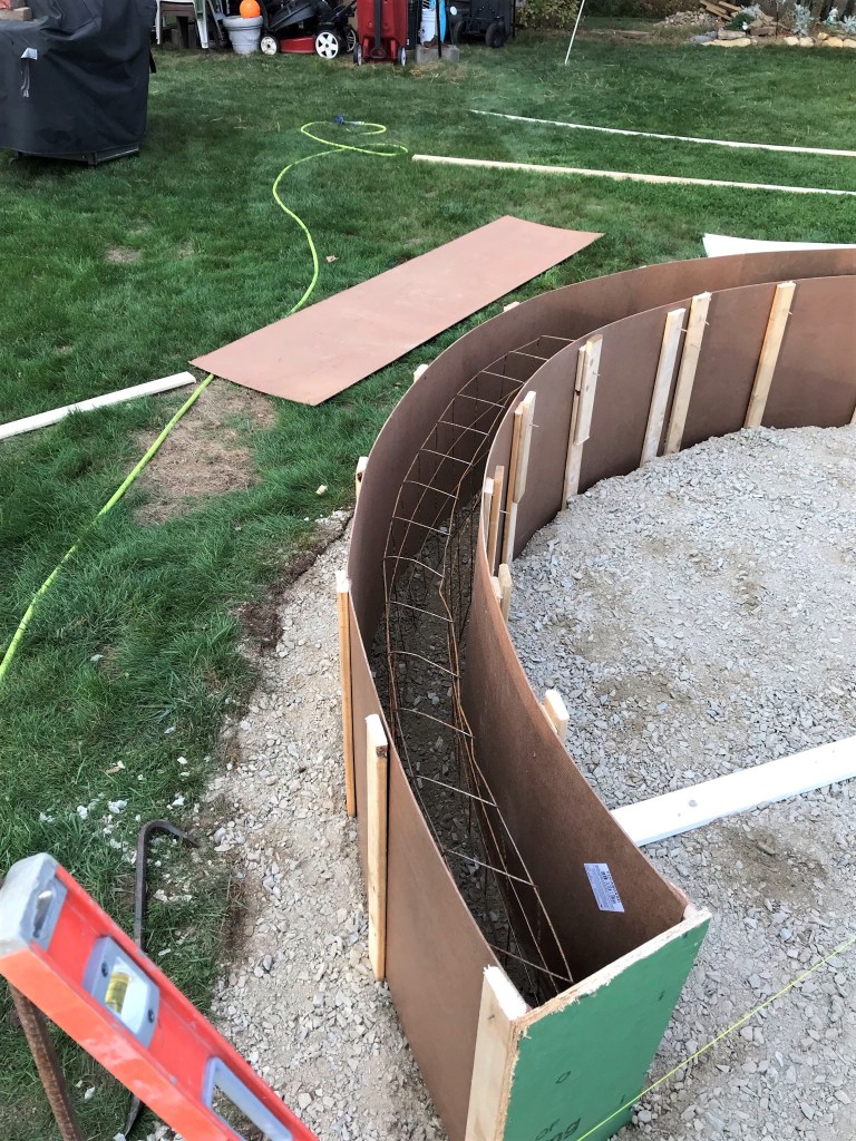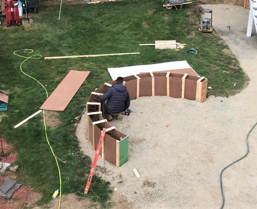 However, it became obvious that Evandro wanted to catch up for Wednesday, so work proceeded on Saturday as well. The work was focused on building concrete forms for the back wall and the fire pit, and lastly placement of hand-mixed concrete. Evandro had an amazing drone that he used to take some photos and videos that will eventually show his work start to finish – and I hope to share a link for that when its available. The drone was able to self-stabilize in the wind and could reach heights of 500 feet!